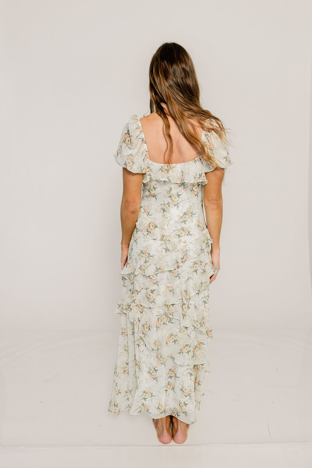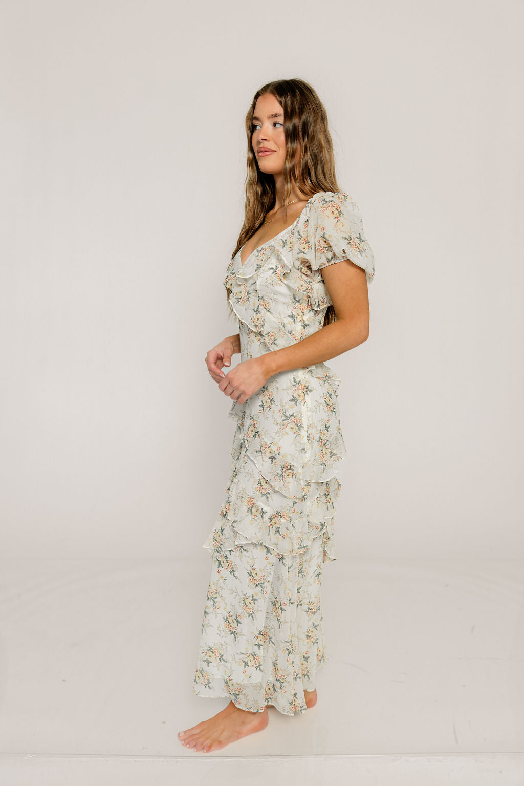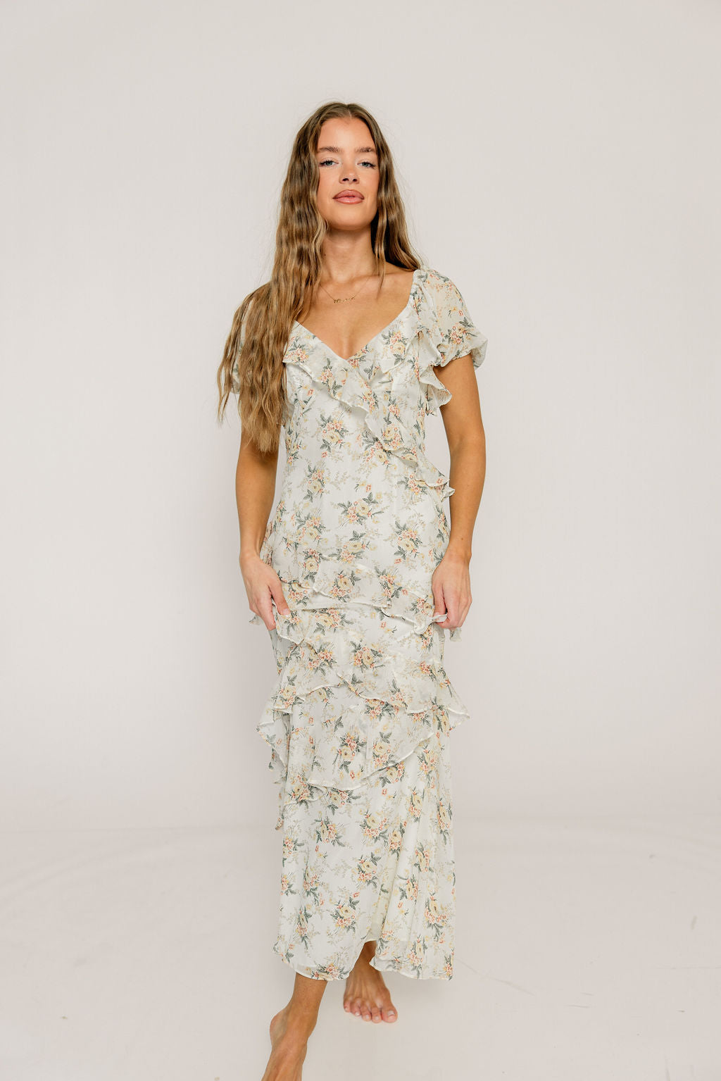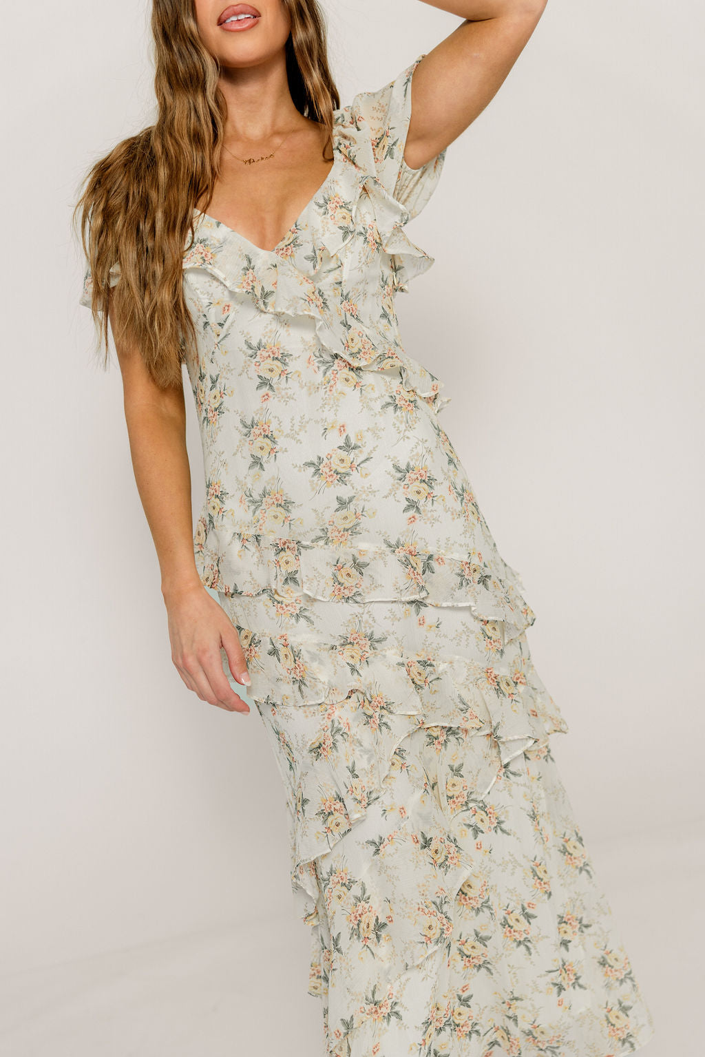 Elle Smocked Floral Ruffle Maxi Dress in Creme Floral
