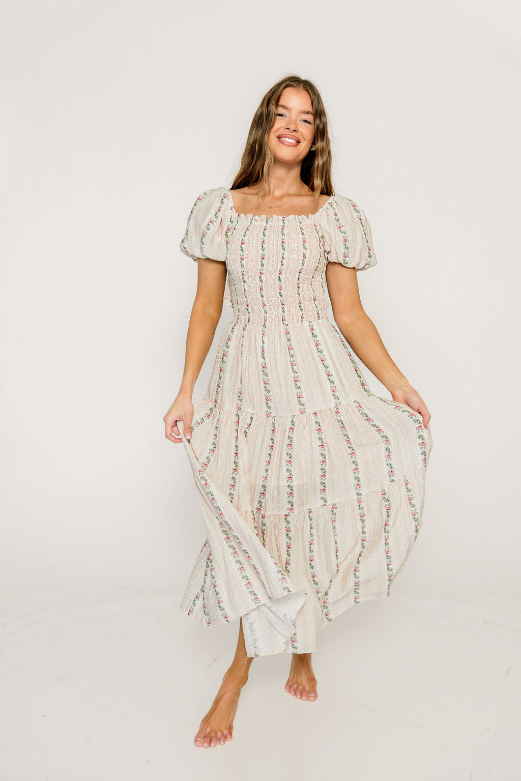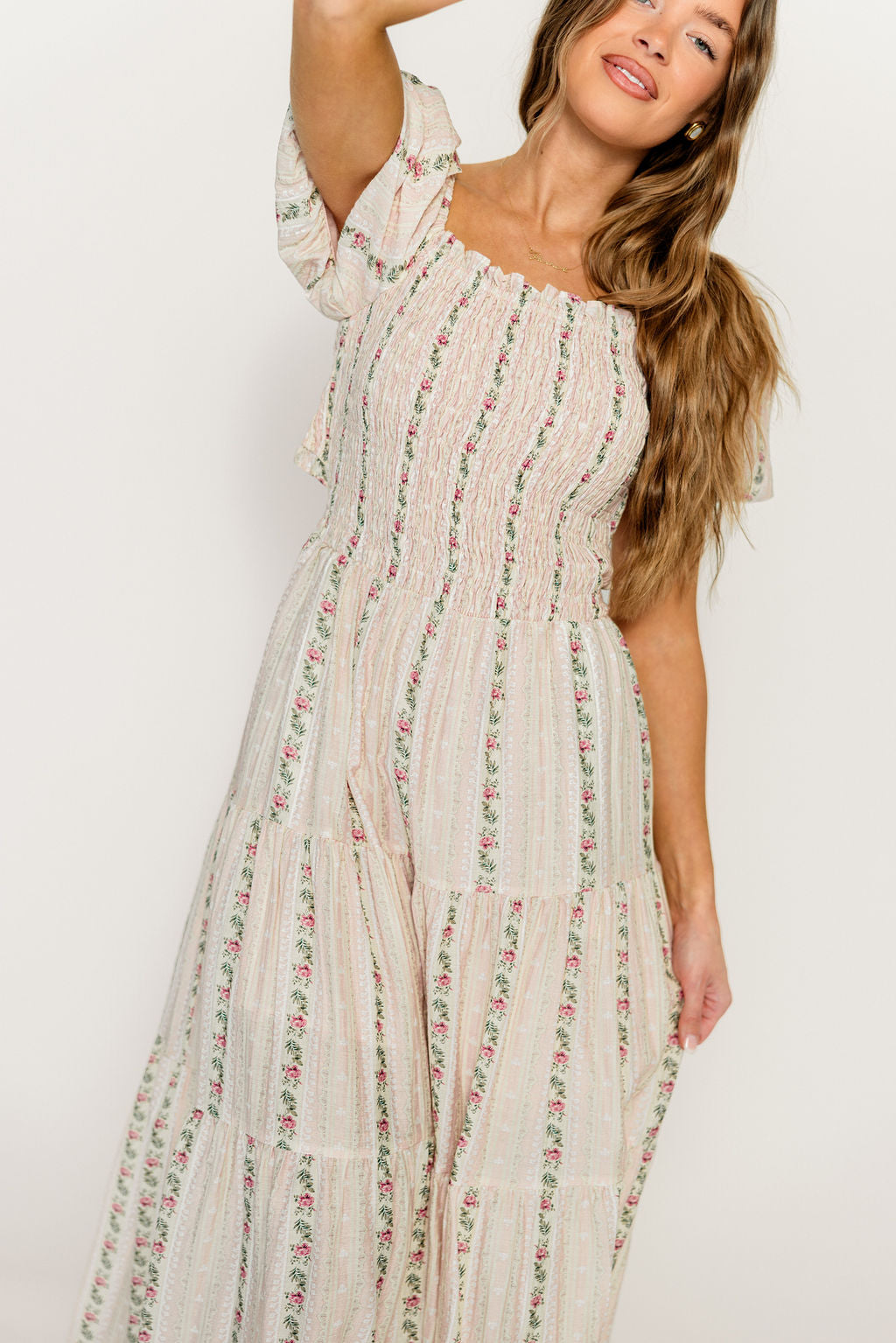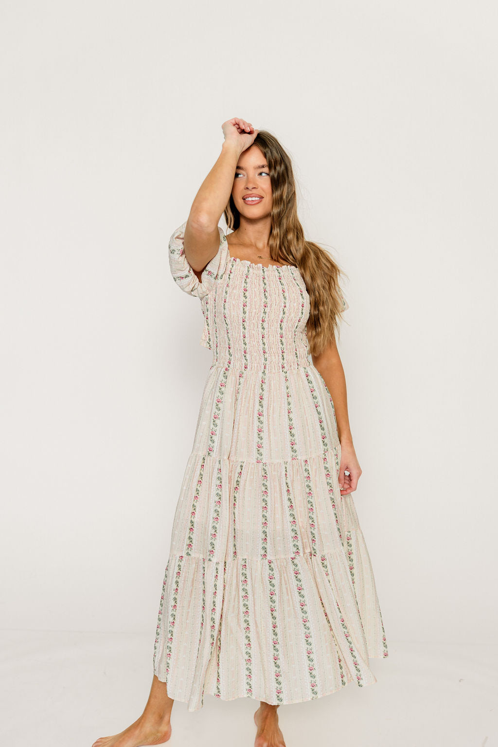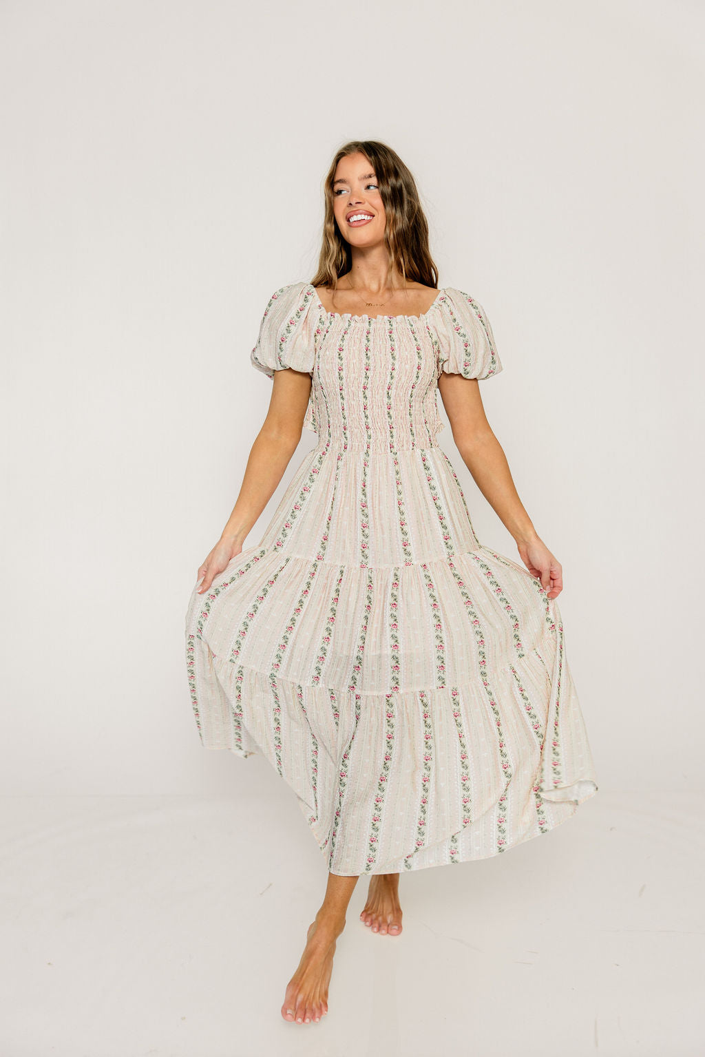 Elle Smocked Floral Ruffle Maxi Dress in Creme Floral