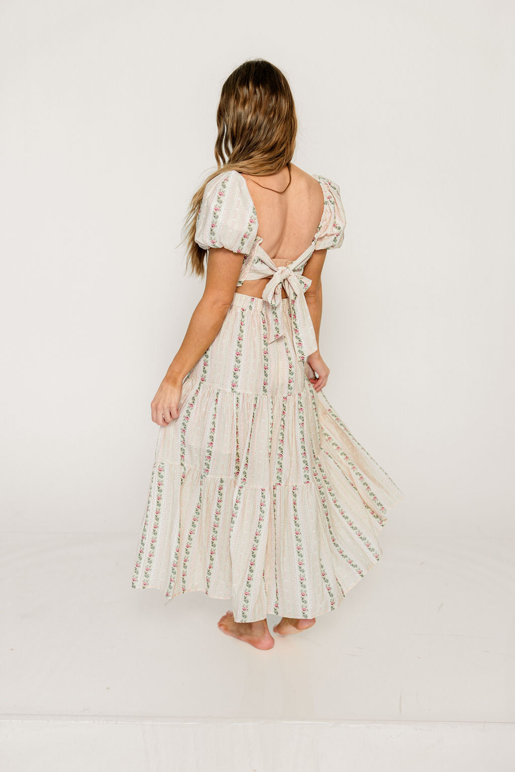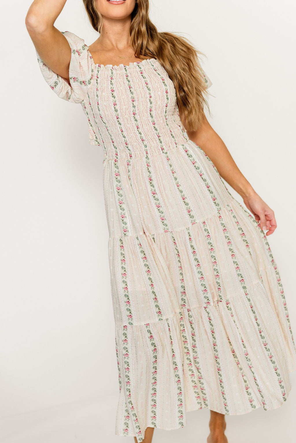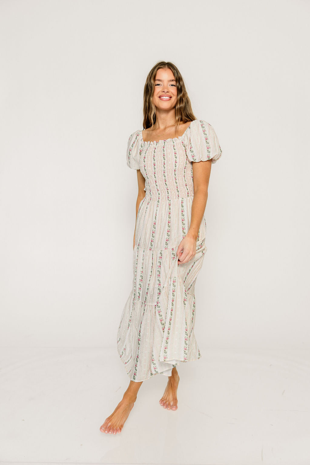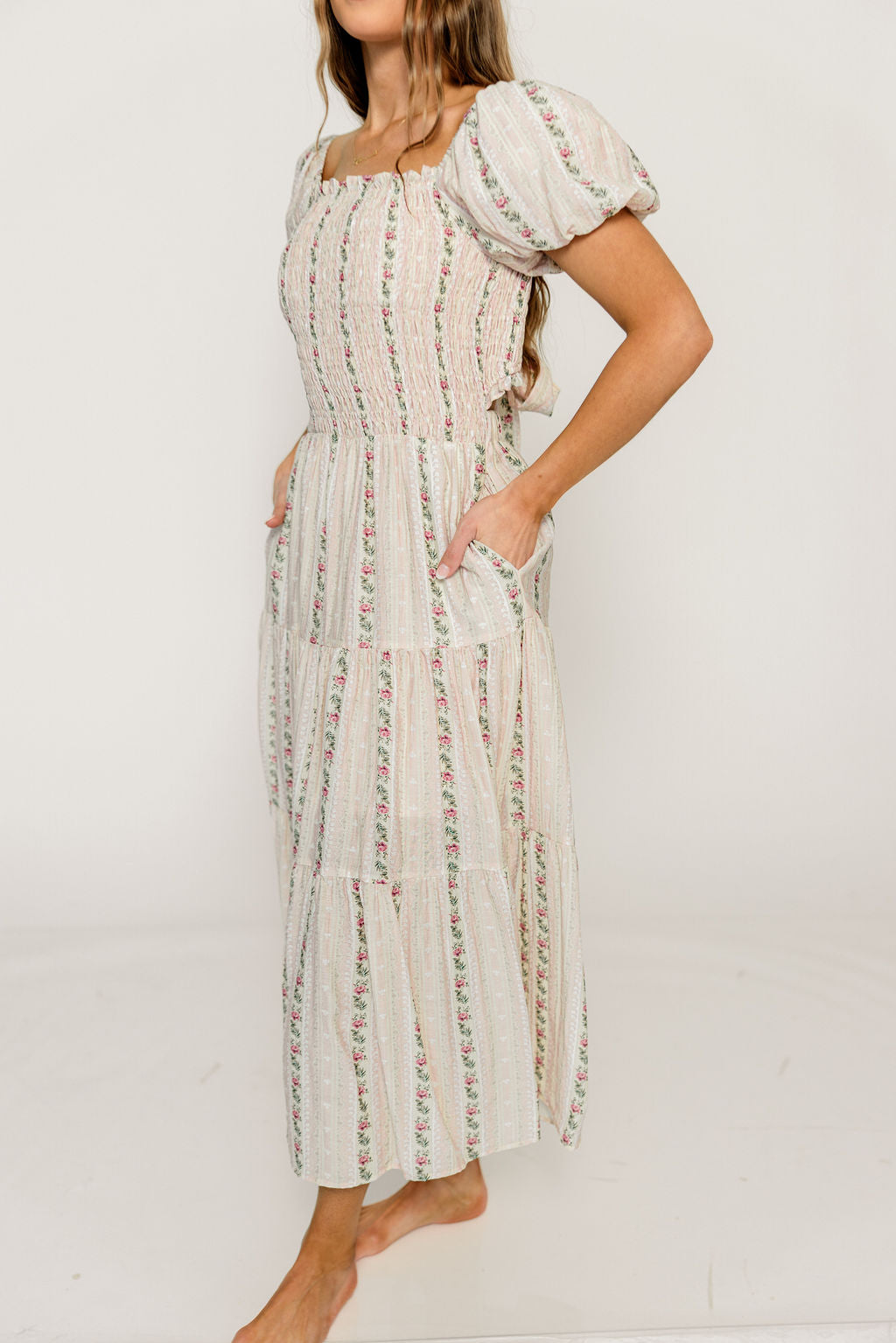 Elle Smocked Floral Ruffle Maxi Dress in Creme Floral