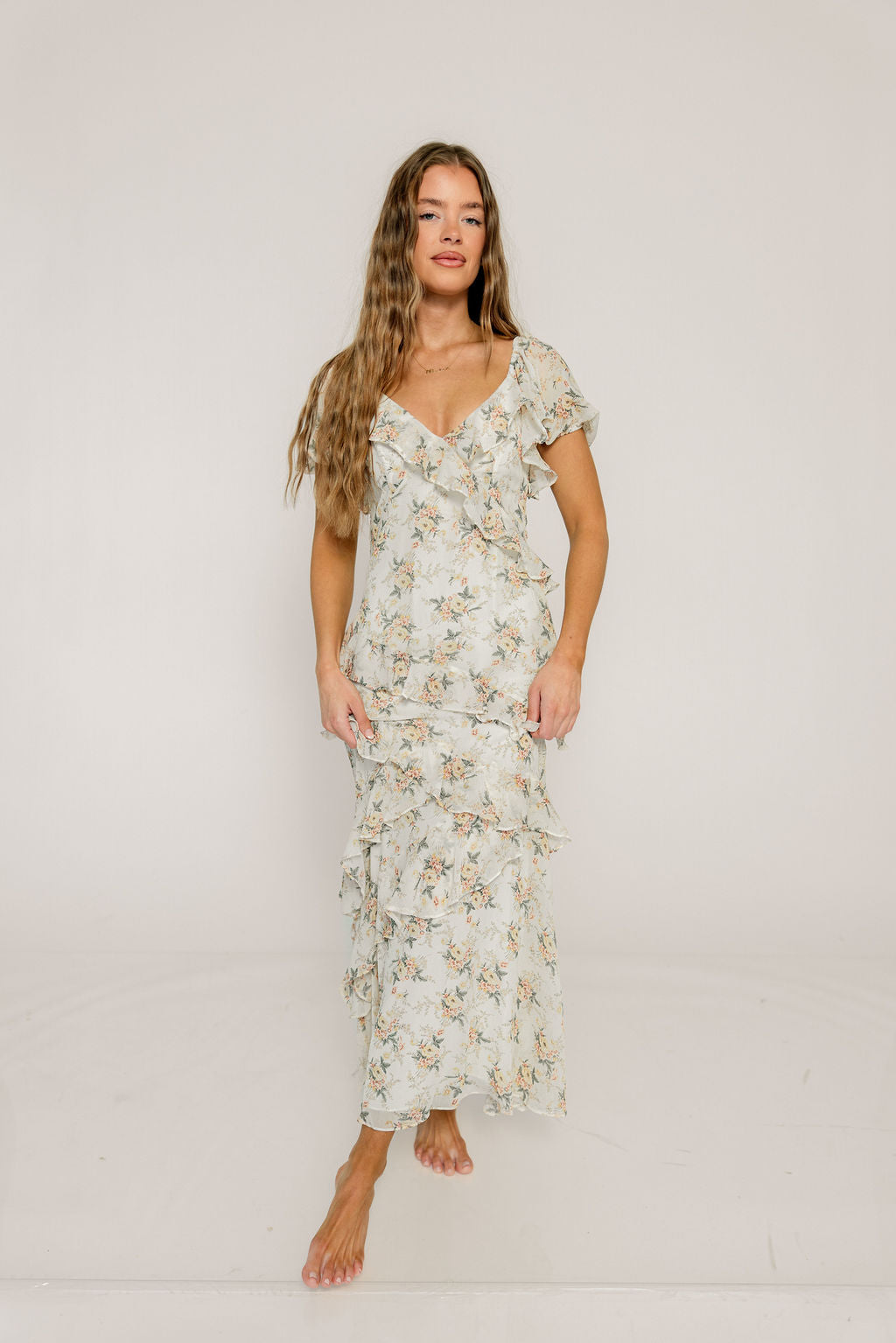 Elle Smocked Floral Ruffle Maxi Dress in Green Tea Floral