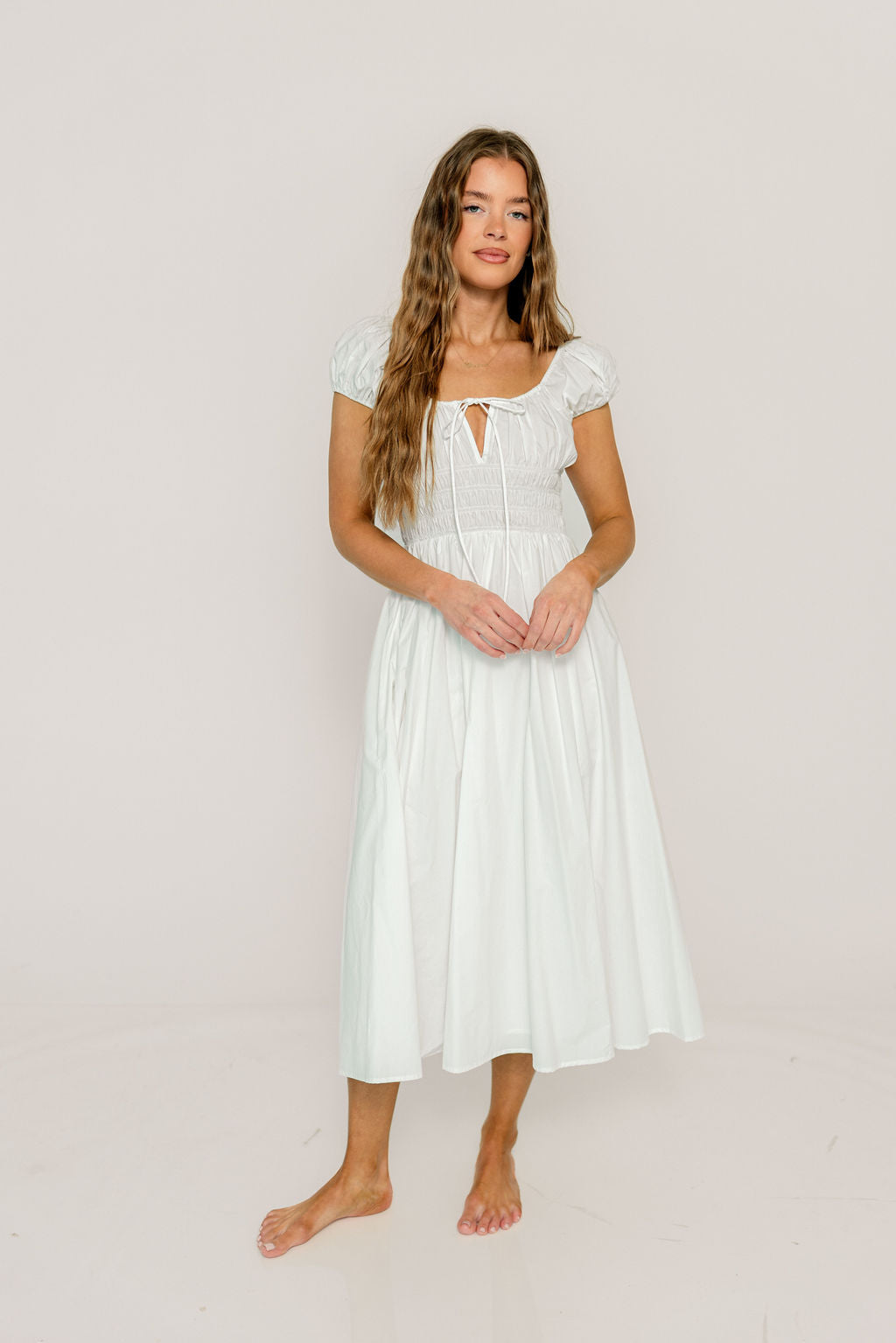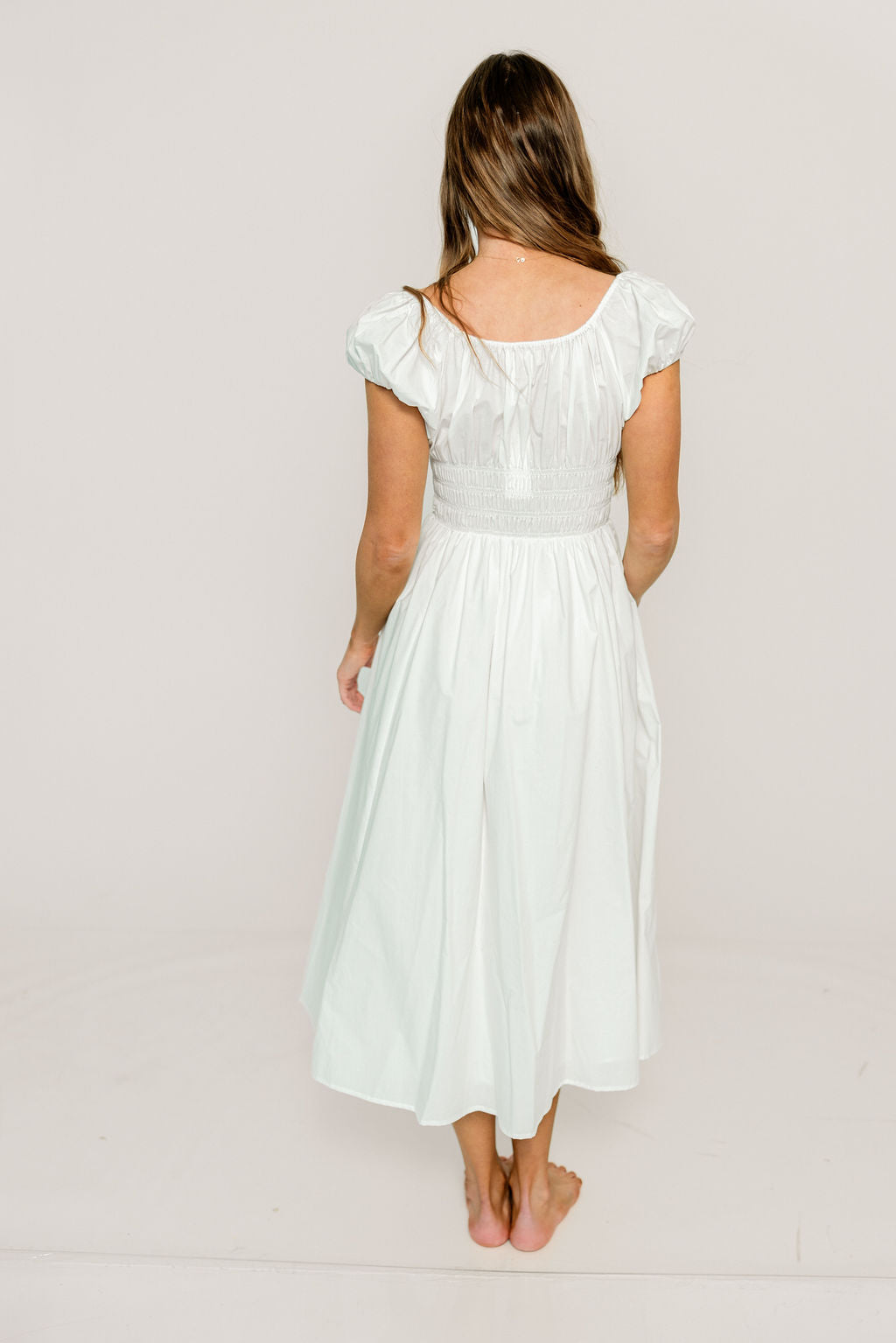 Eliana Floral Puff Sleeve Midi Dress in Off White Multi