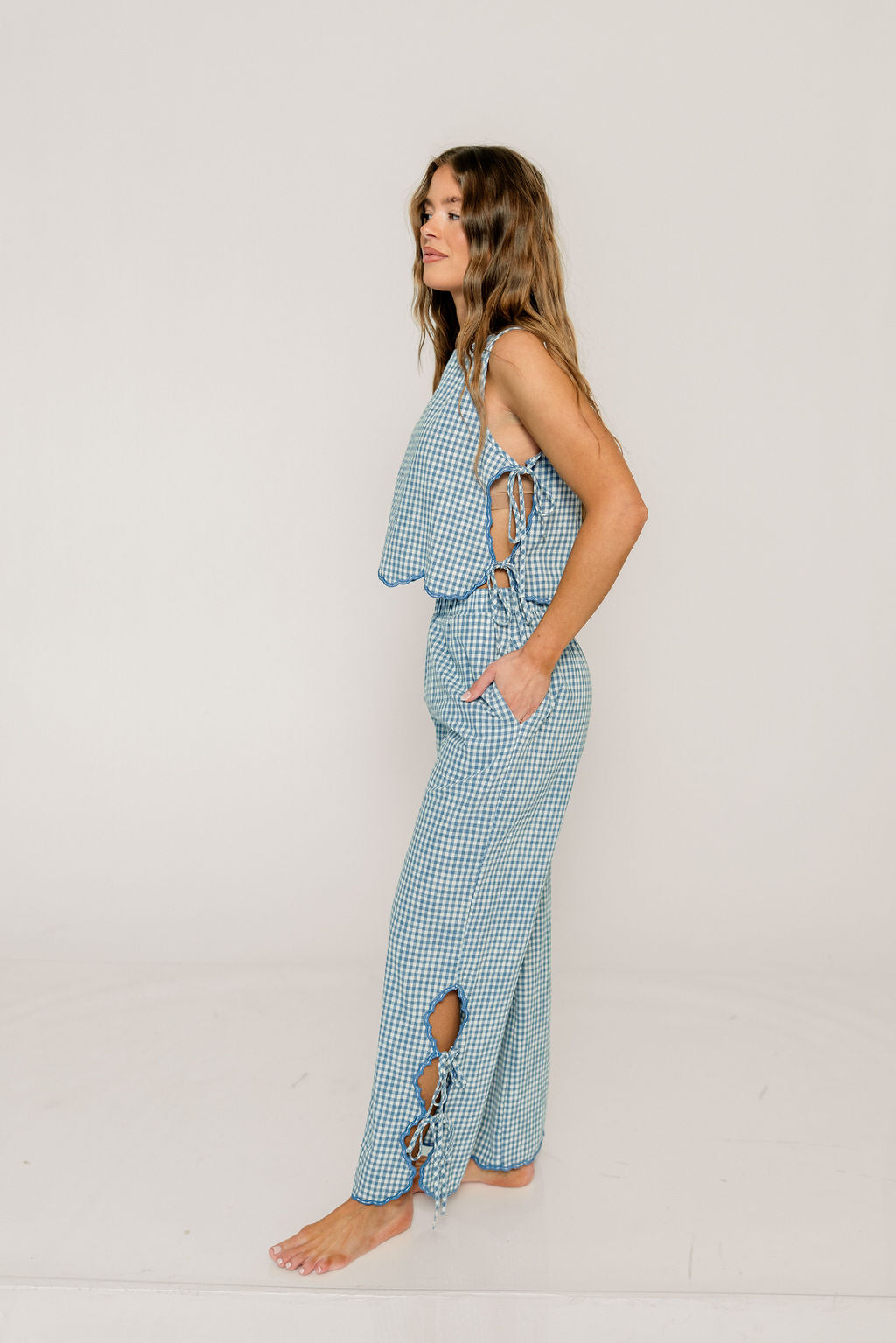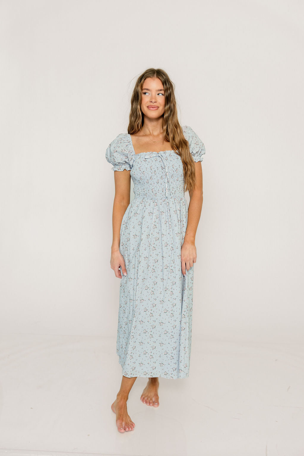 Arabelle Smocked Bow Detail Maxi Dress in Blue Aura