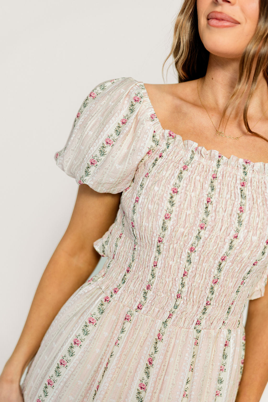 Junie Puff Sleeve Floral Midi Dress in Off-White/Pink