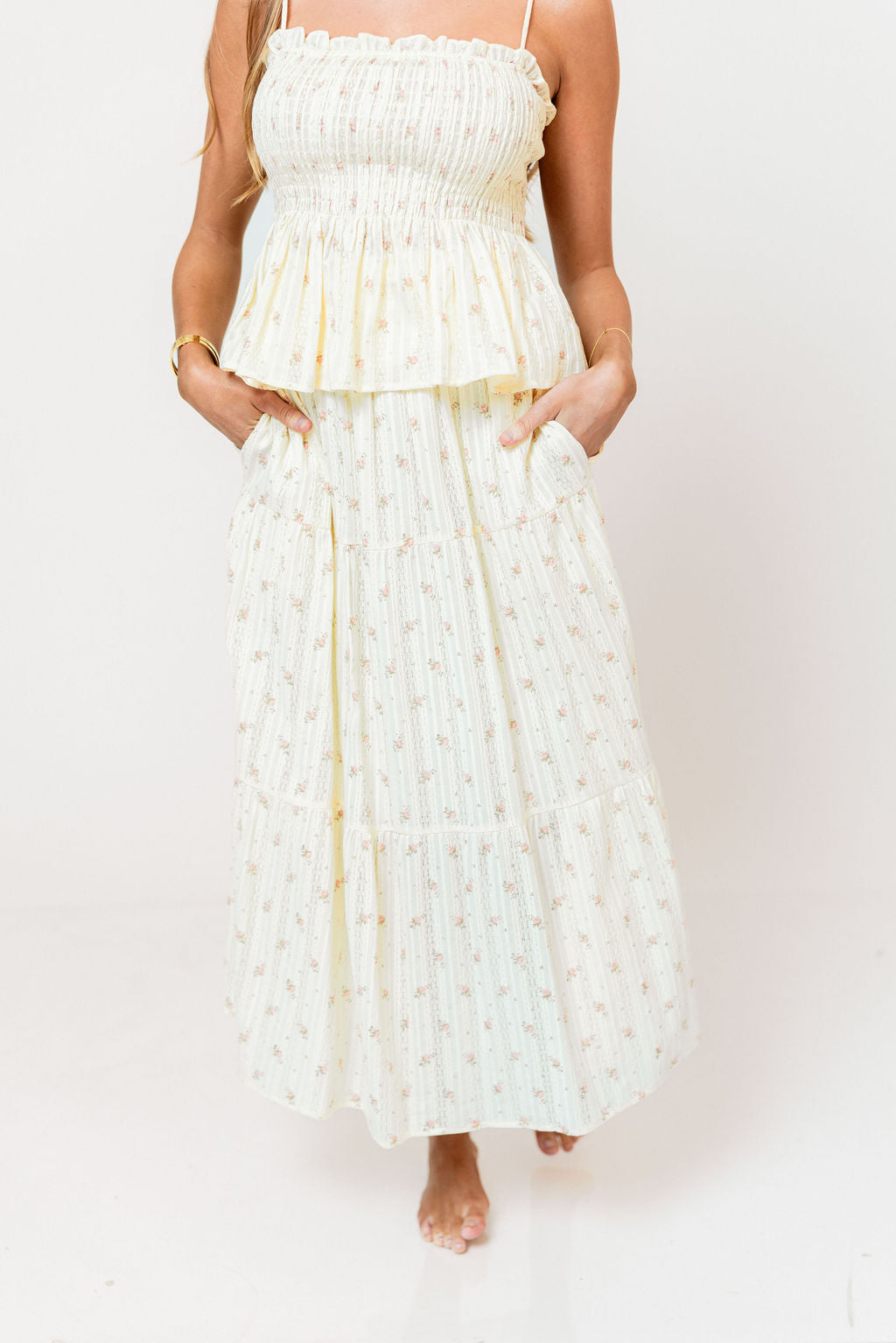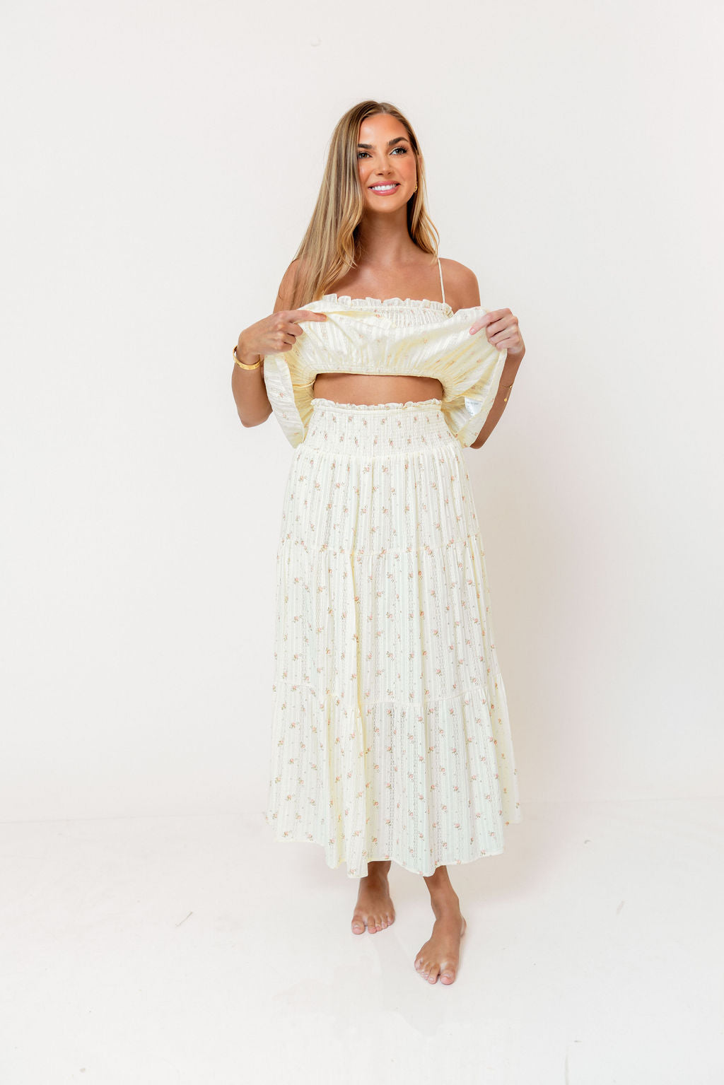 Gracie 100% Cotton Tiered Floral Midi Skirt in Butter Yellow