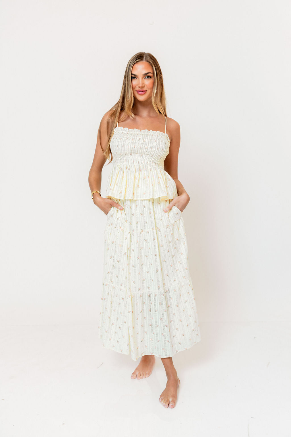 Bianca Smocked Floral Midi Dress in Butter Yellow