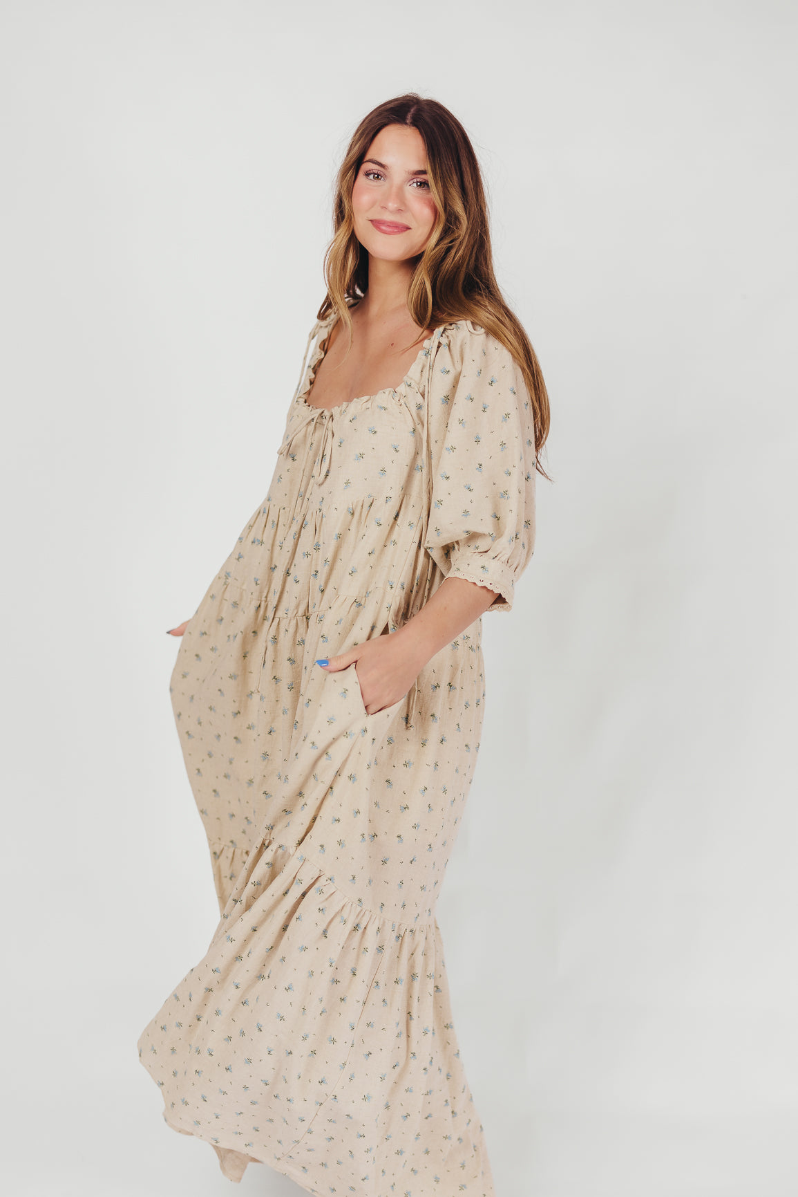 GARMENT DETAILS: Relaxed fit maxi dress in 100% cotton, with a square ruffled neckline with drawstring detail, loose 3/4 length sleeves, and a shift-style silhouette for ease of movement. Finished with skirt lining and dual in-seam pockets.