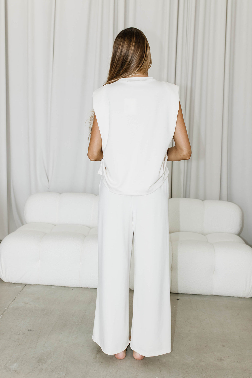 GARMENT DETAILS: Buttery soft, premium knit top and pants set. To features a high rounded neckline and structured power shoulder, with relaxed fit and side ruching details. Full-length pants feature half-elastic waistband, front pleats, wide-leg, and side pockets.