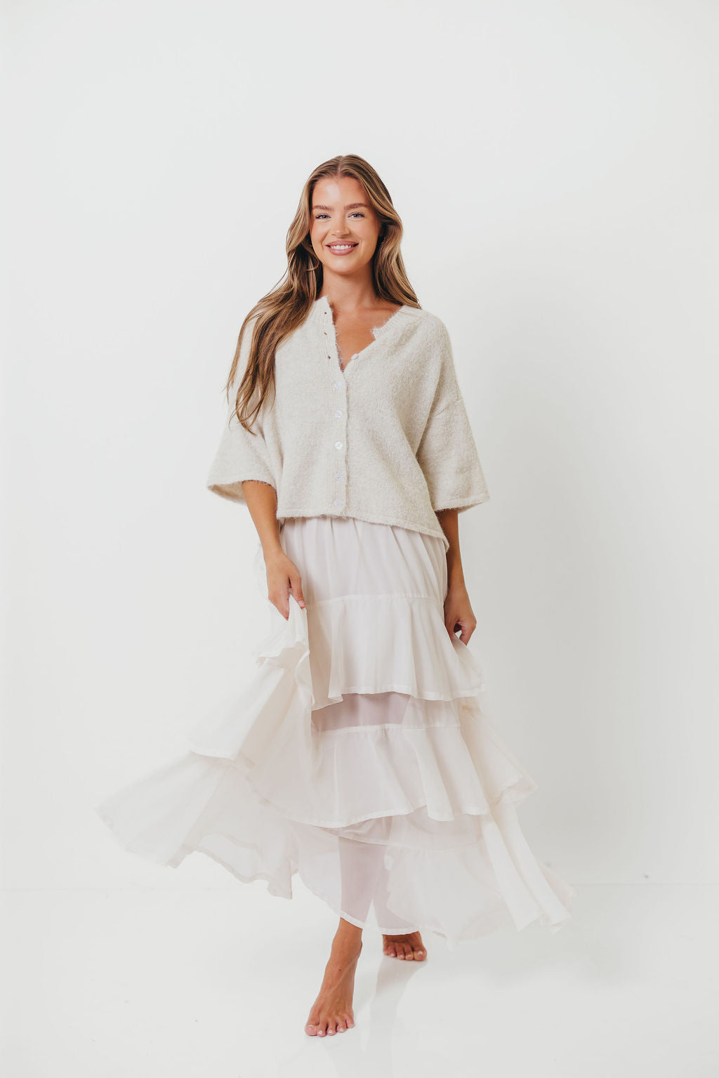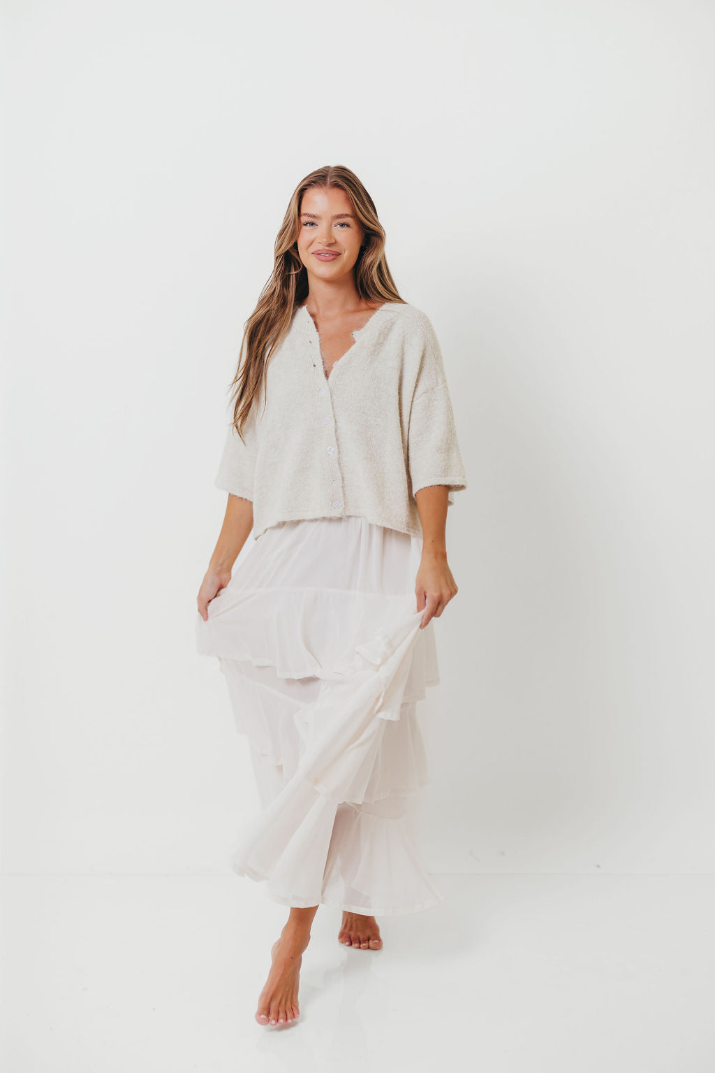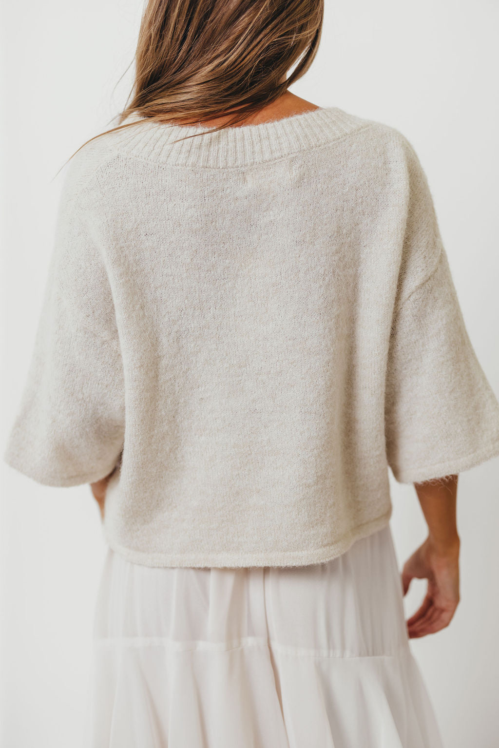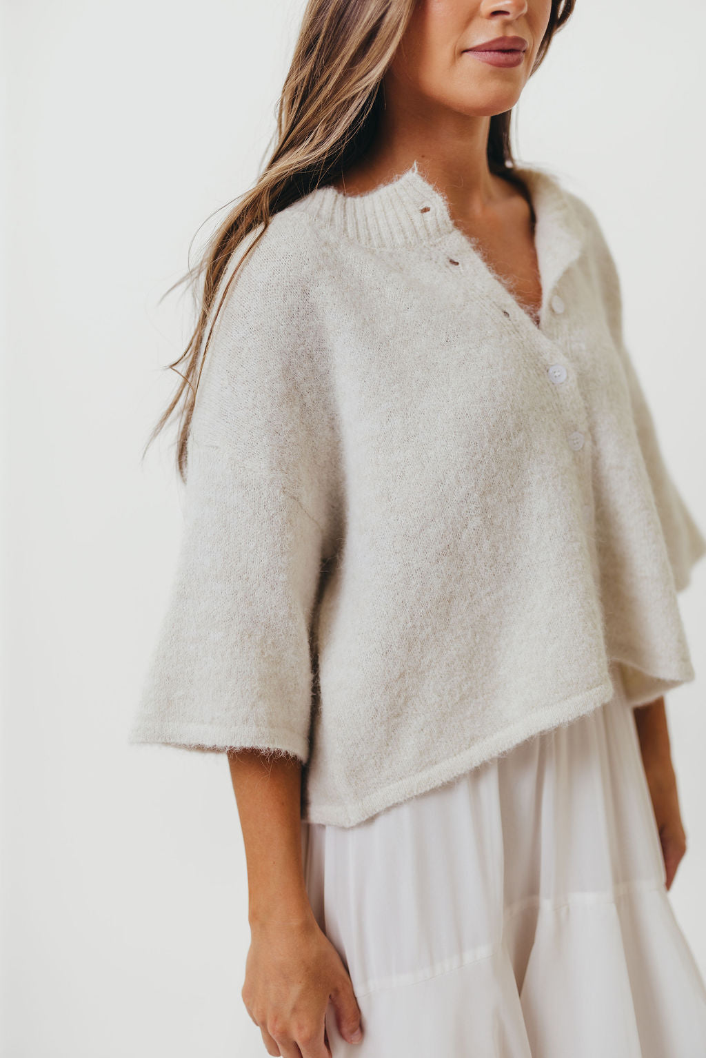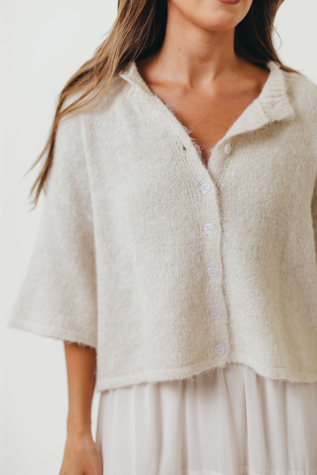Chutney Button-Up Half Sleeve Knit Cardigan Top in Ivory