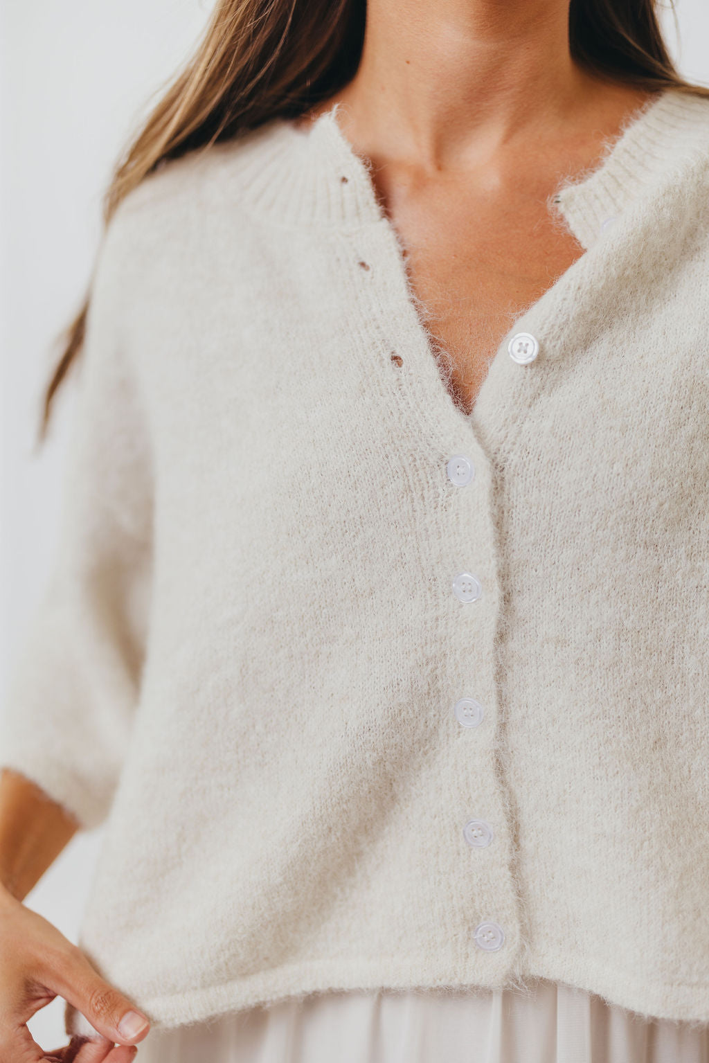 GARMENT DETAILS: Thick knit cardigan top with ribbed, rounded neckline, front button placket, and 1/2 length sleeves. Features a relaxed silhouette and functional buttons.