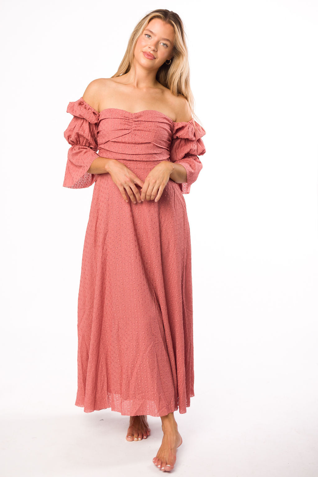 GARMENT DETAILS: Elegant maxi dress with ruched bodice and sweetheart neckline, with 3/4 length tiered Marie sleeves; neckline can be worn on or off the shoulder. Bodice features silicone tape. Features dual in-seam pockets and a textured, lightweight fabric. Lined.