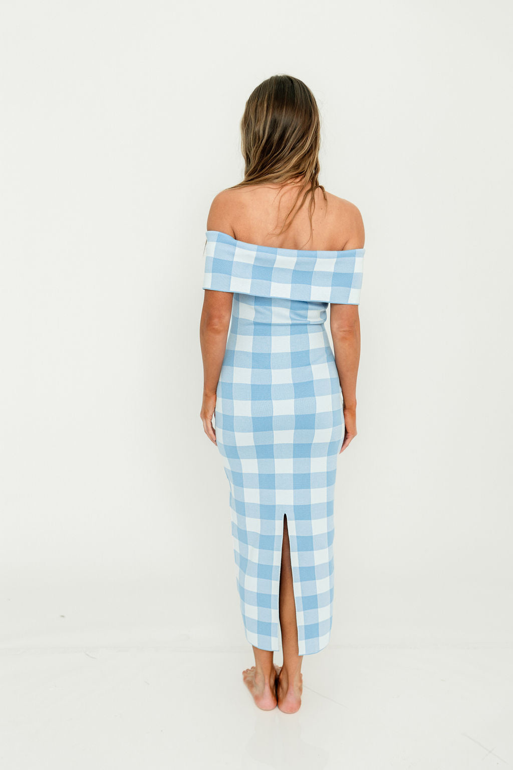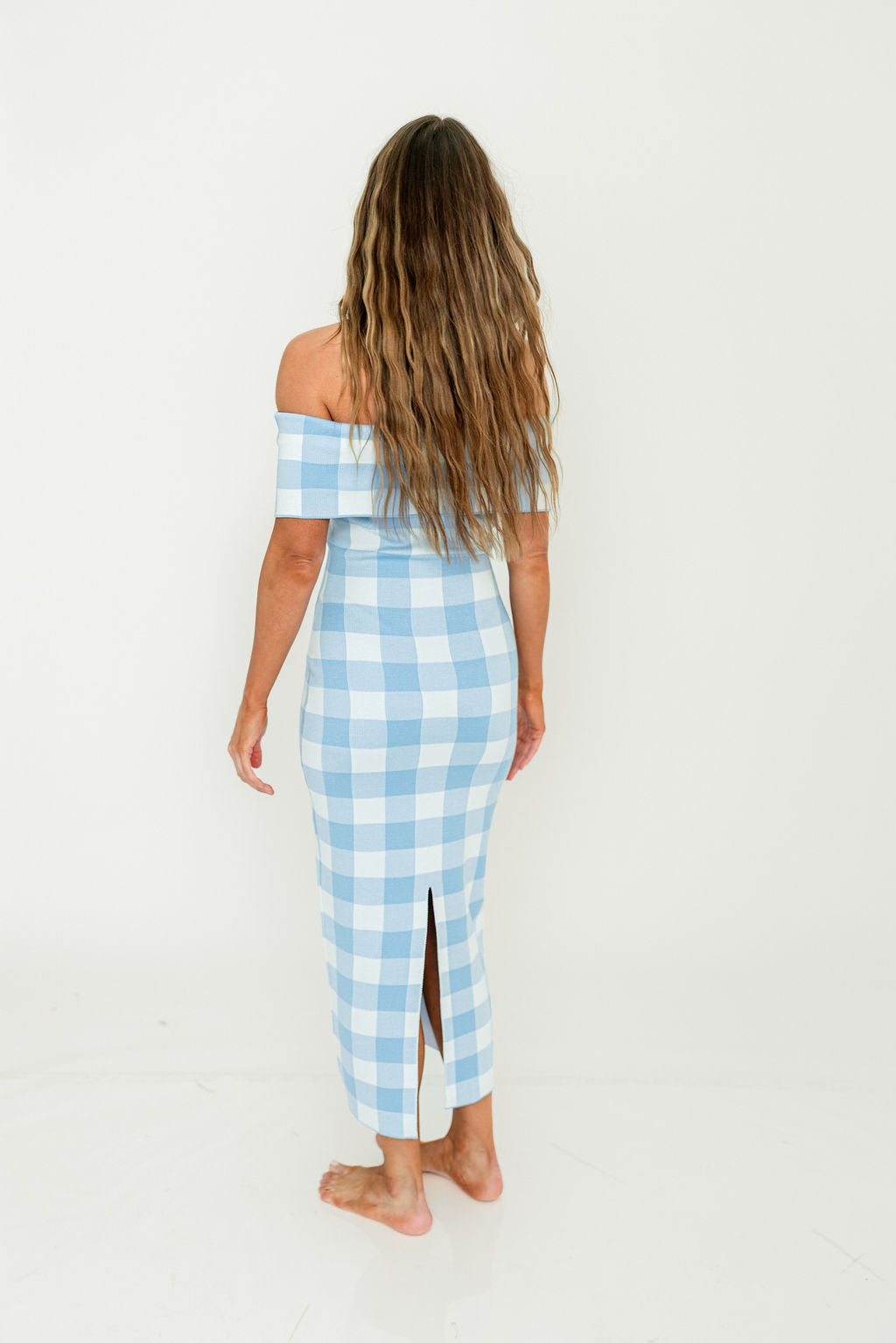 GARMENT DETAILS: Extra-soft Viscose-blend long midi dress in a charming blue gingham print. Features a fold-over strapless neckline, modest back skirt slit, and flattering, feminine fit.