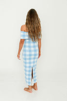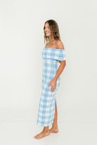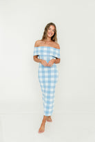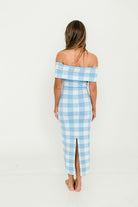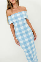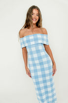 Carrie Gingham Plaid Off Shoulder Midi Dress in Blue