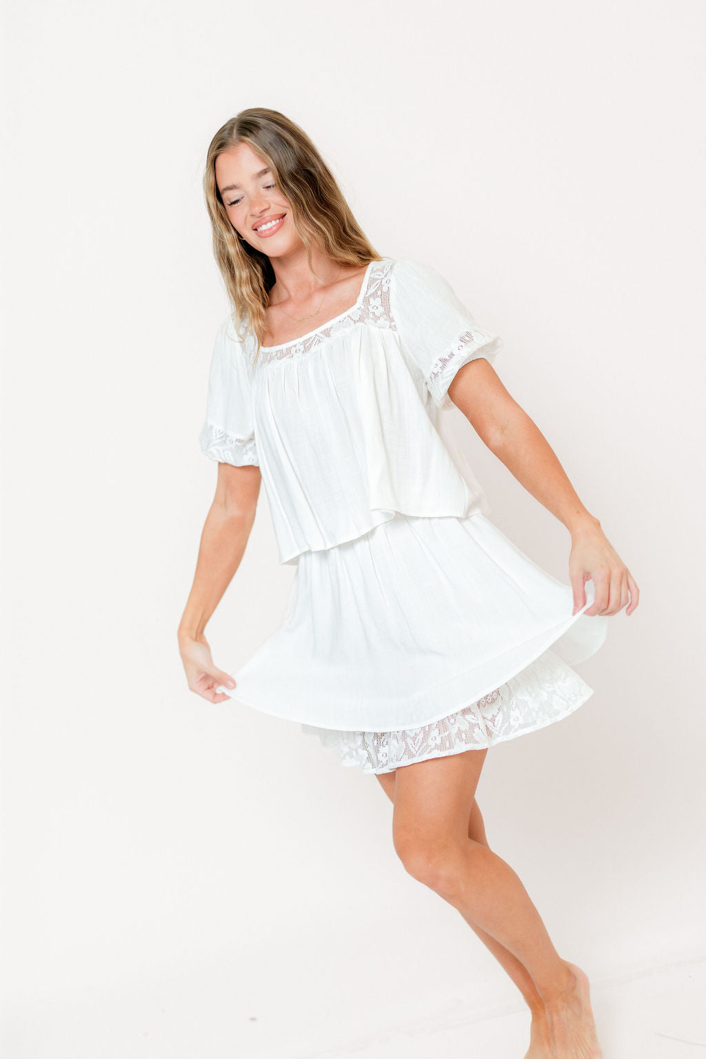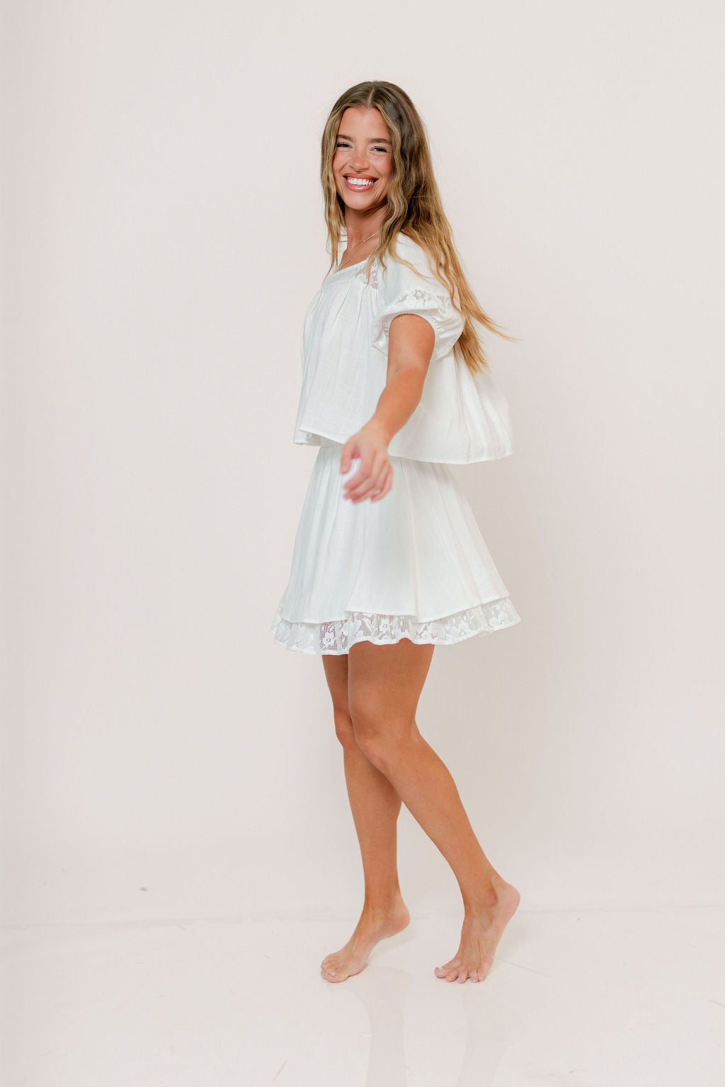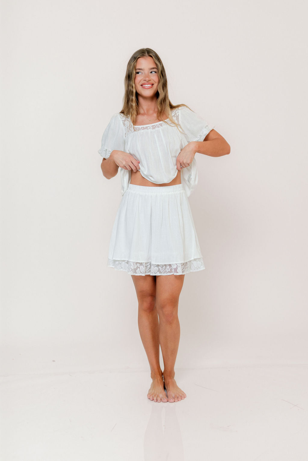 The Fields Mini Skirt dresses up your basic mini with a romantic silhouette and delicate lace trim; pair it with the matching Misty Top for effortless style, or with an oversized cardigan and boots for multi-season versatility!