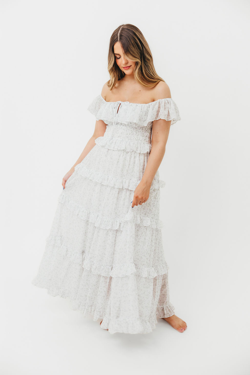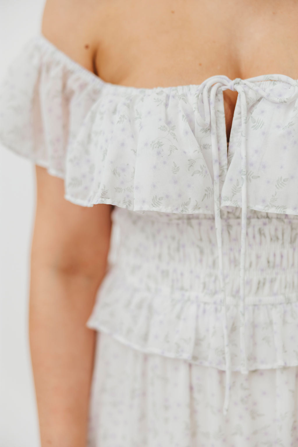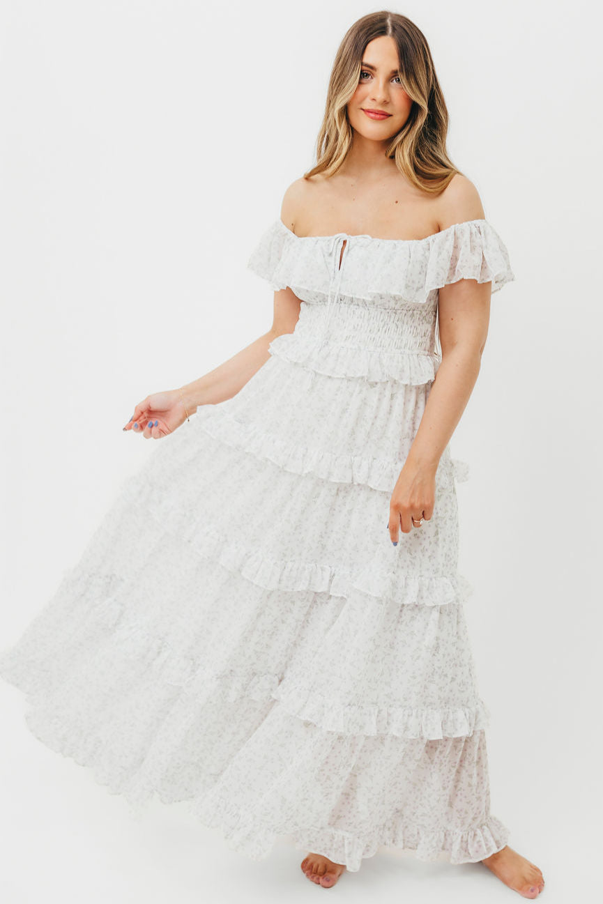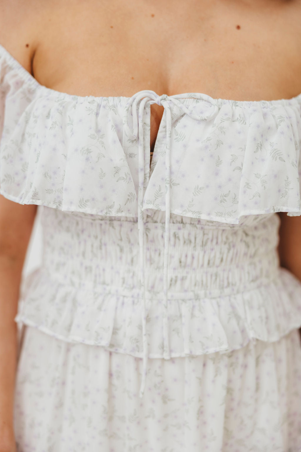 GARMENT DETAILS: Floral maxi dress with self-tie detail at bust, smocked waist panel, and ruffled cap sleeves that can be worn on or off the shoulder. Lightweight skirt features ruffled tiers. Dress is lined to the 2nd ruffle from the bottom.