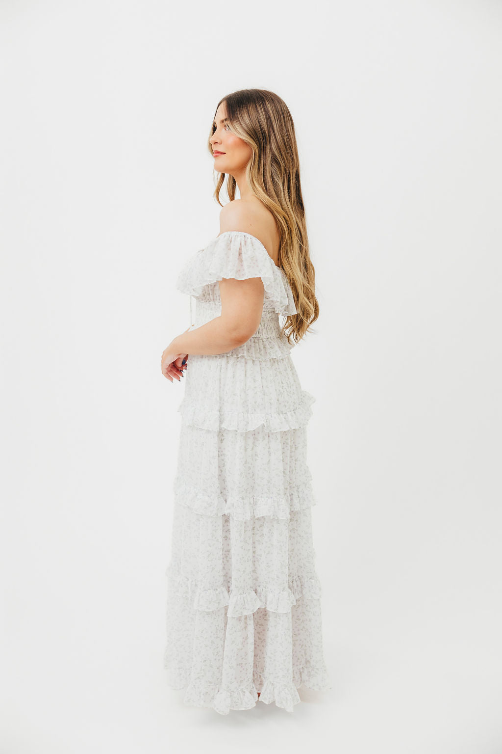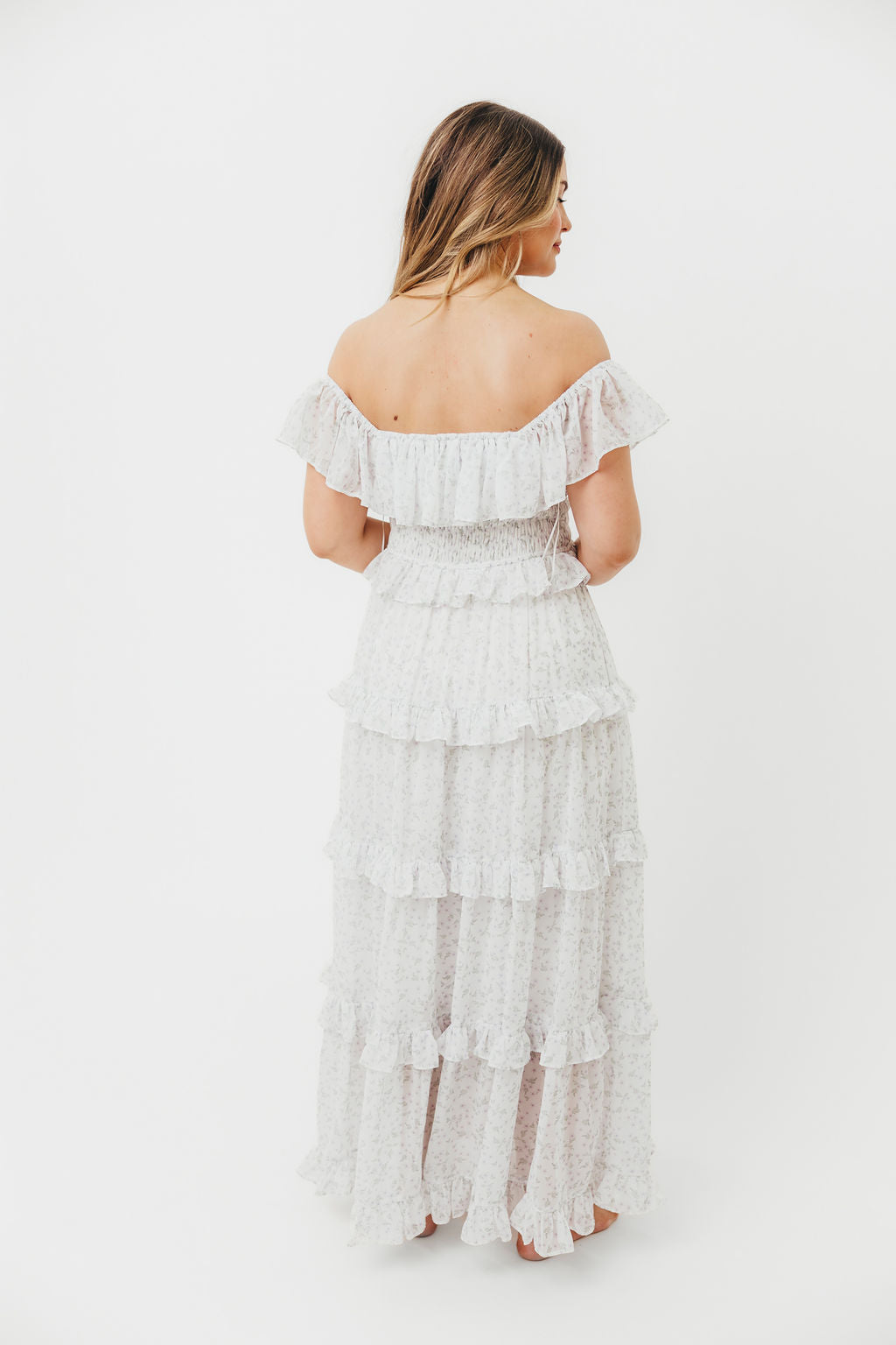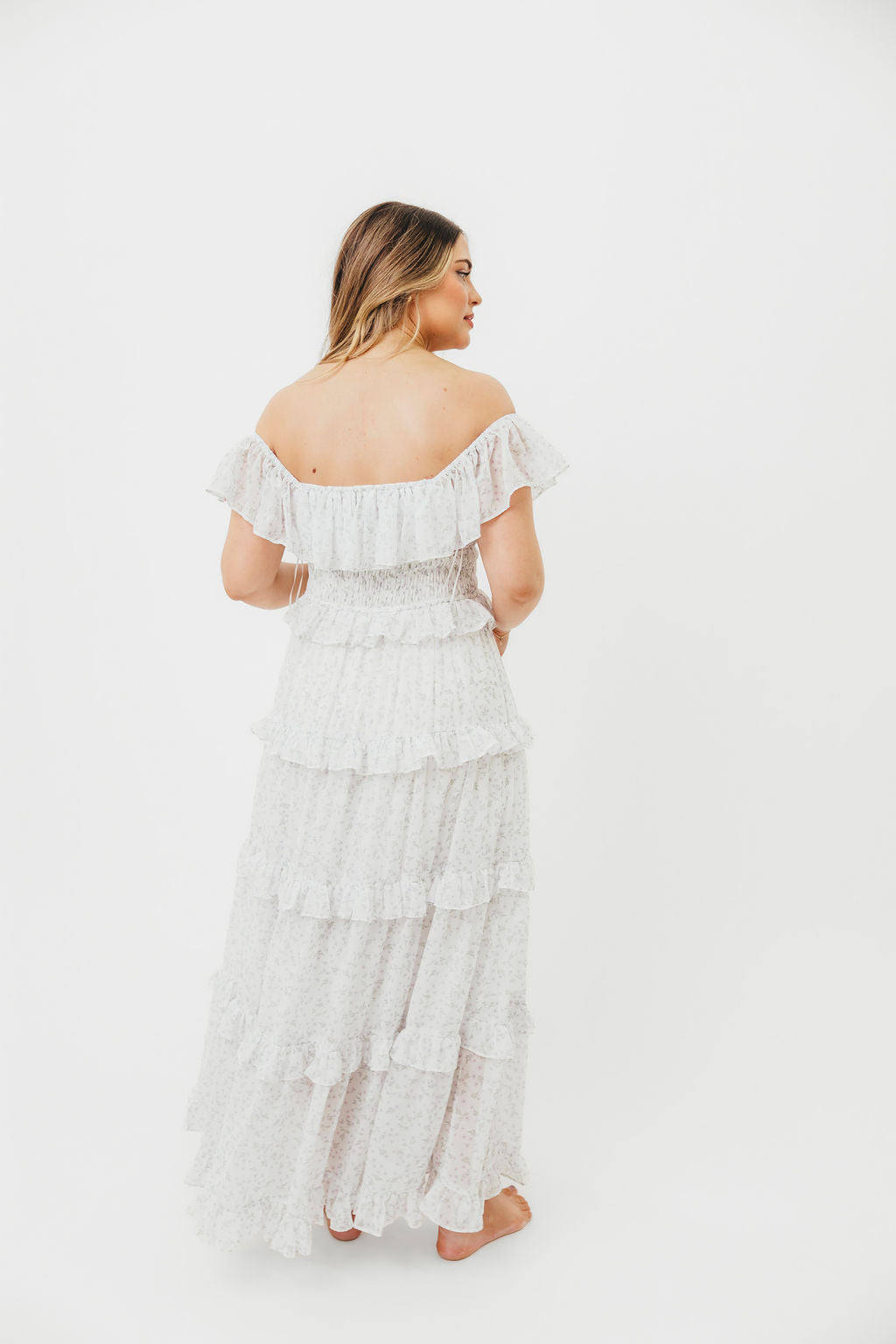 GARMENT DETAILS: Floral maxi dress with self-tie detail at bust, smocked waist panel, and ruffled cap sleeves that can be worn on or off the shoulder. Lightweight skirt features ruffled tiers. Dress is lined to the 2nd ruffle from the bottom.