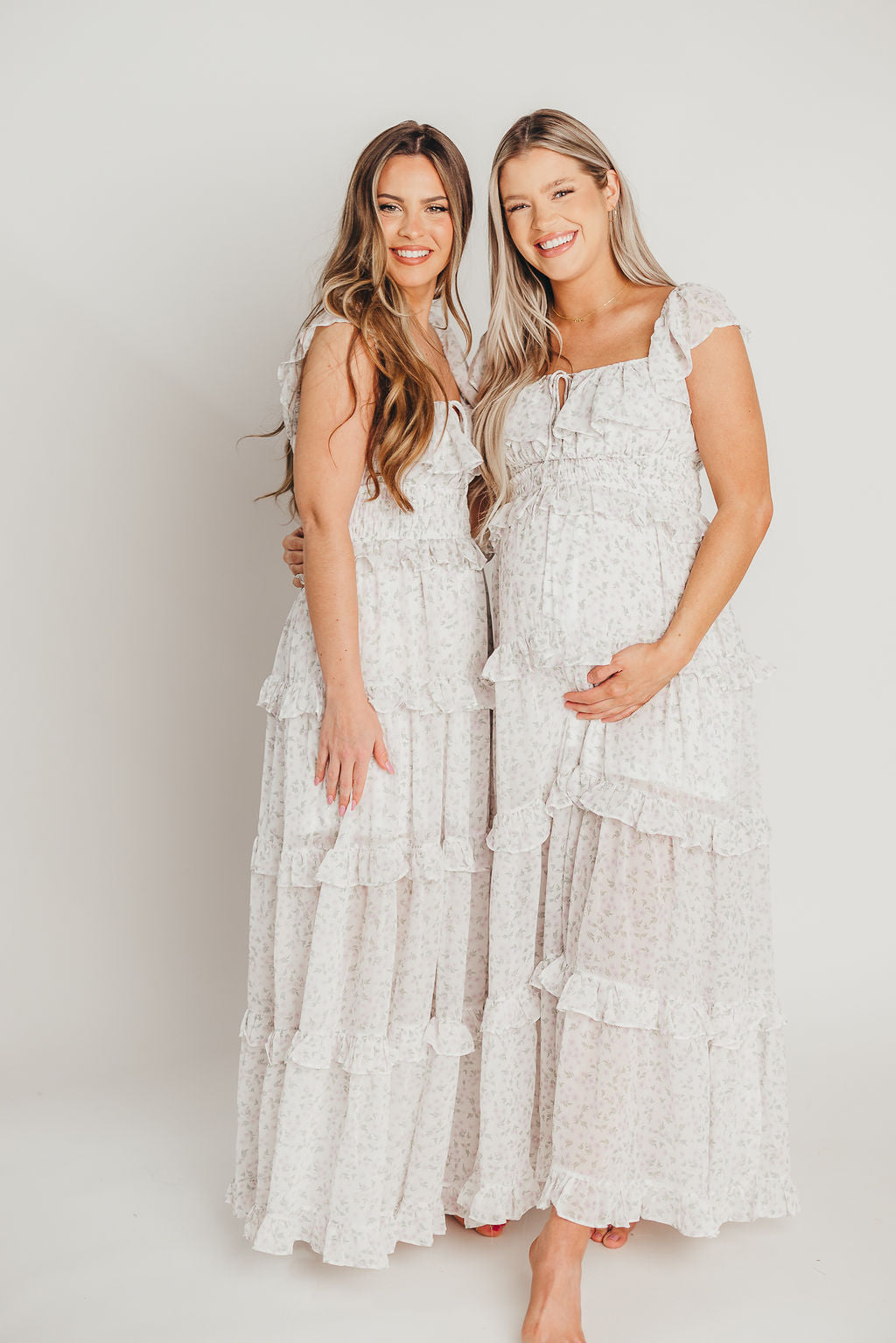 This romantic, bump-friendly maxi dress features the sweetest ruffle detailing that will flatter any silhouette in the most charming way. The always-popular Astrid design is back for 2025 with a full lining, so you can enjoy your special day in comfort. Crafted from a lightweight, whispery fabric in a delicate floral hue, this beautiful gown is sure to make an impression at any special occasion.