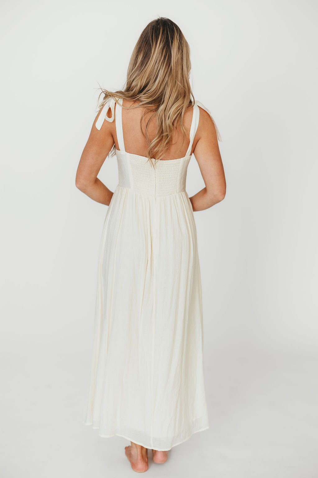 Float among the flowers in our lush Clementine Midi Dress, a fresh new take on florals just in time for the spring. This feminine gown features delicate floral embroidery and adjustable tie straps, with a comfortable bodice and flowing skirt that makes the Clementine an elegant choice for tea parties or brunch.