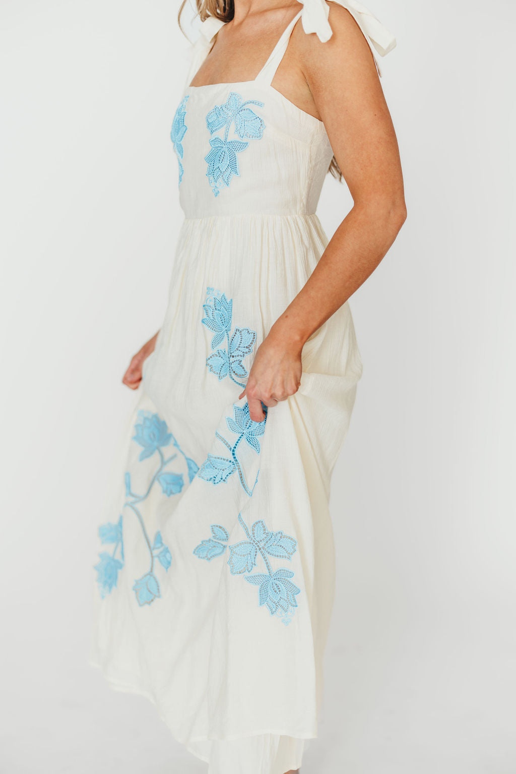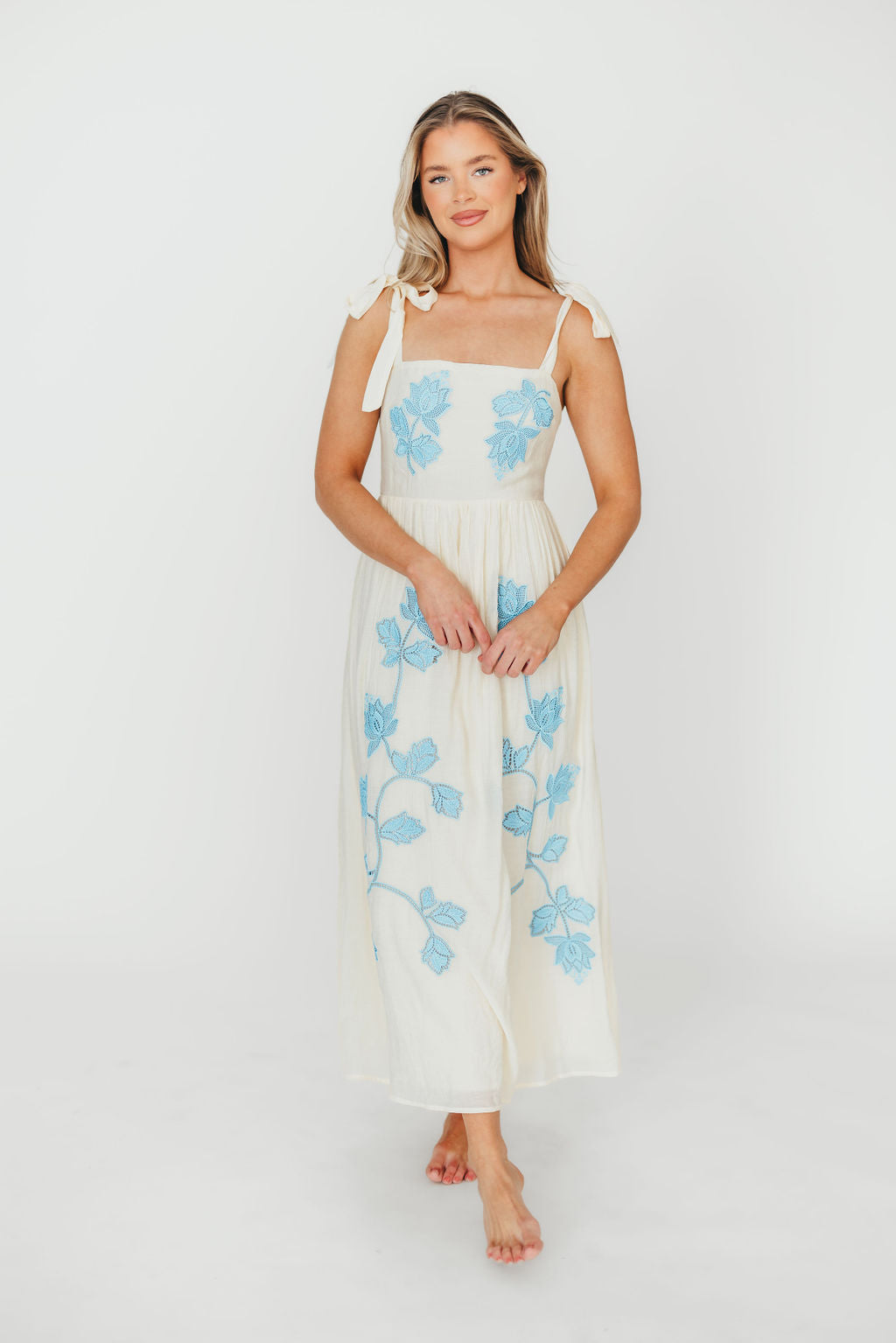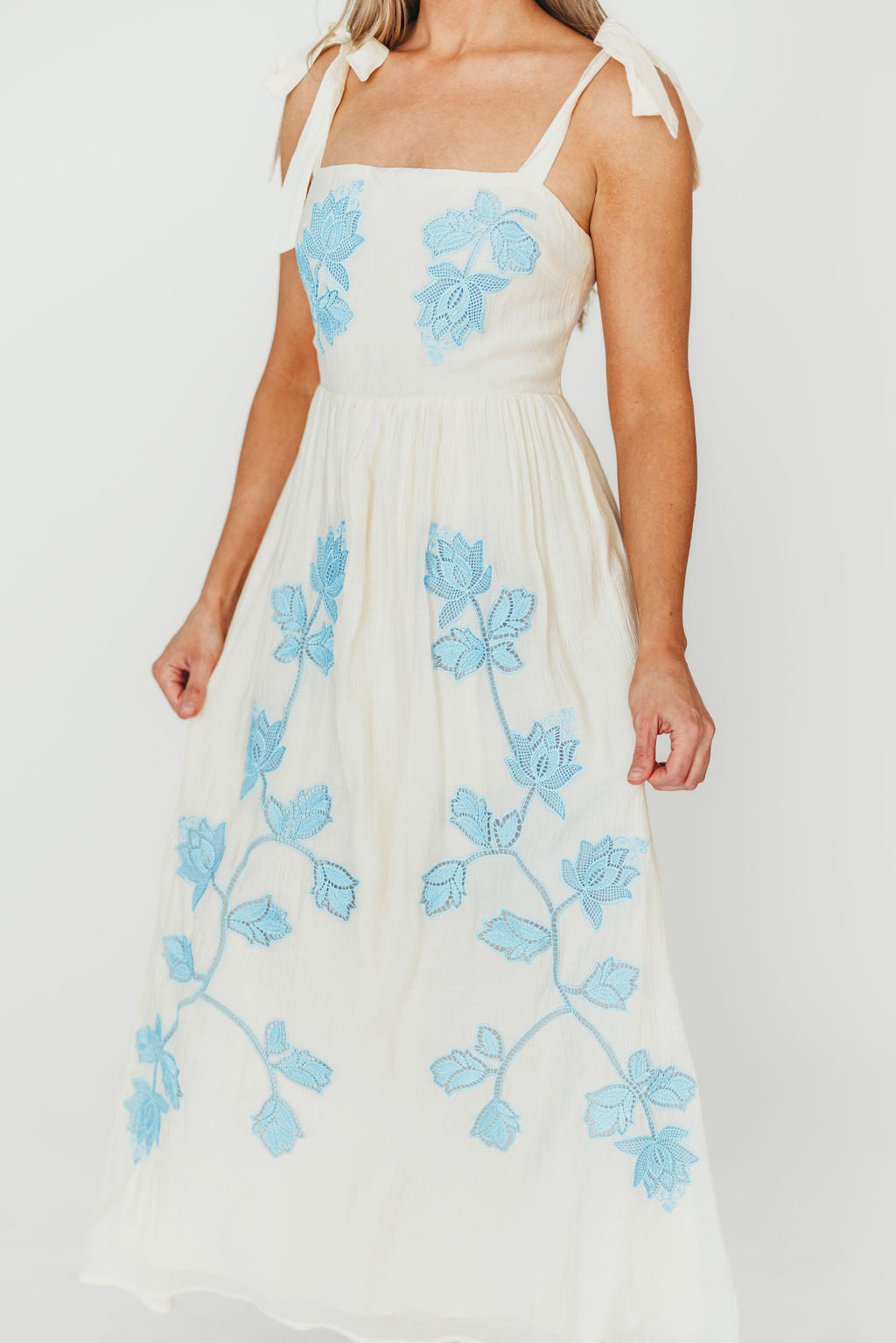Clementine Embroidered Midi Dress in Cream/Light Blue