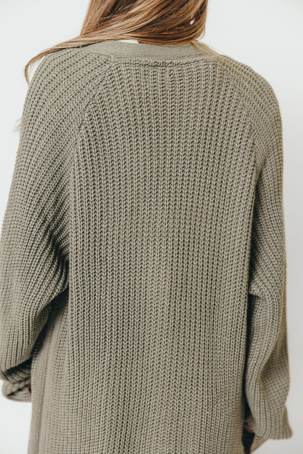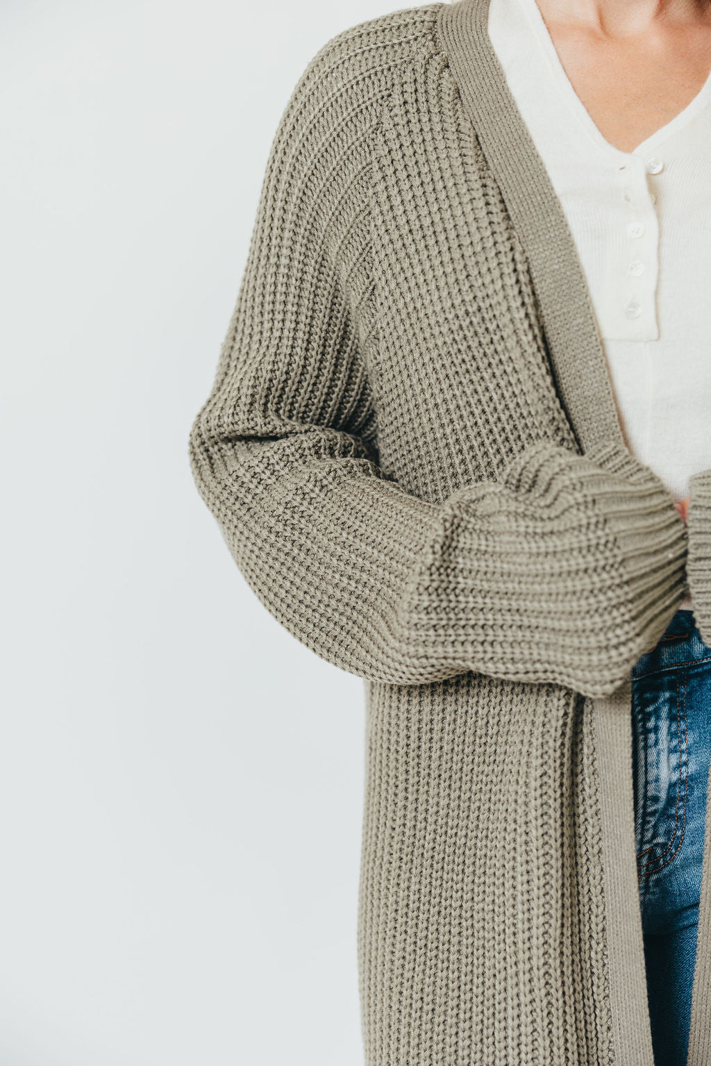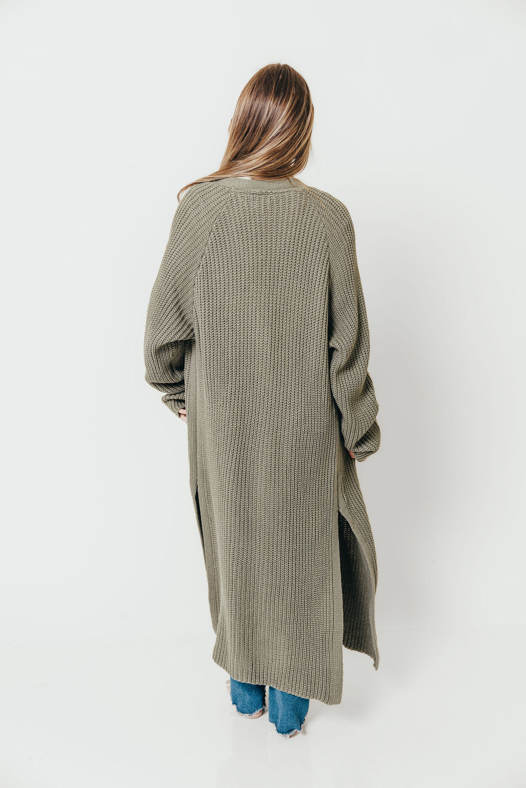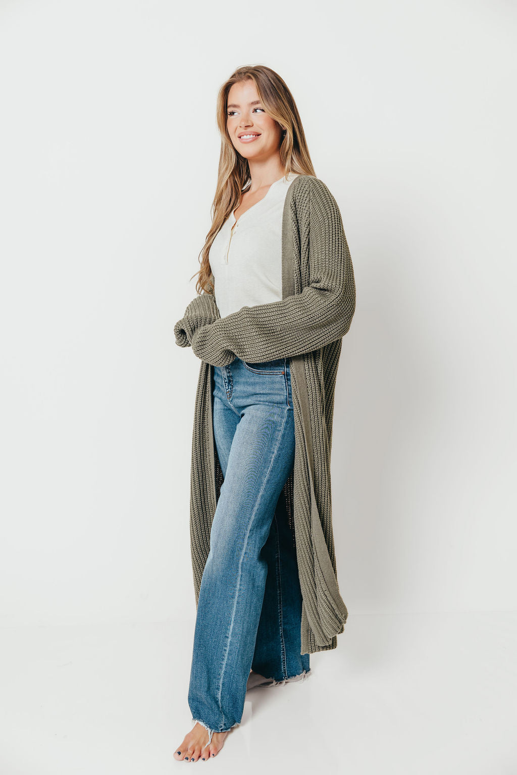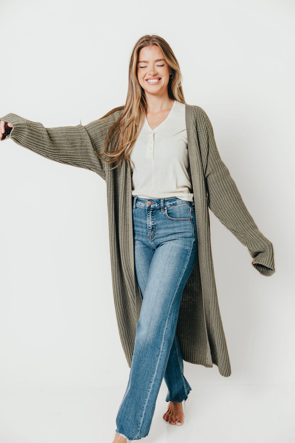 Stay cozy AND trendy with this premium duster-length cardigan! The Janelle offers long raglan sleeves and a comfortable, open front style in a stunning green color that's absolutely perfect for fall and winter outfits.
