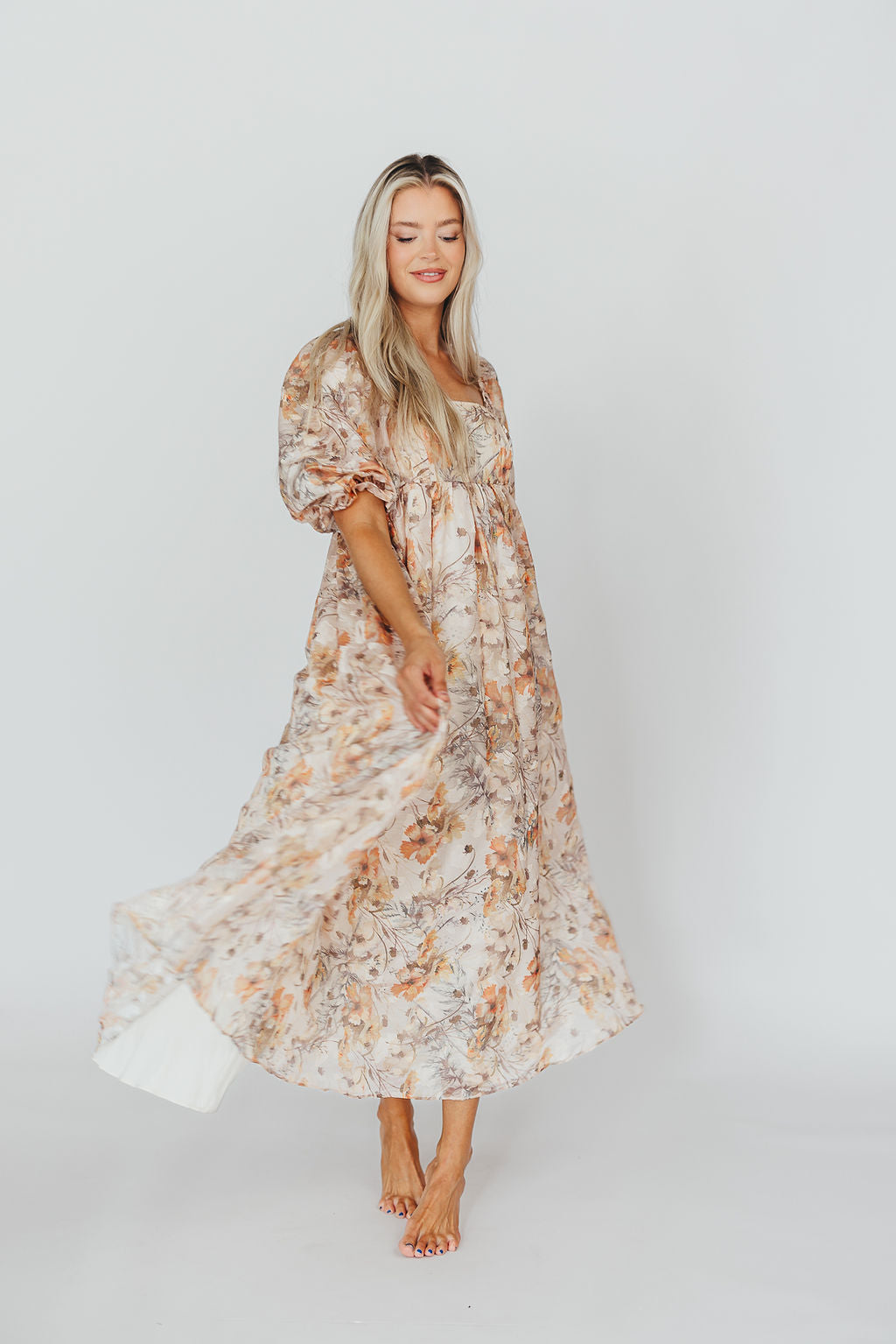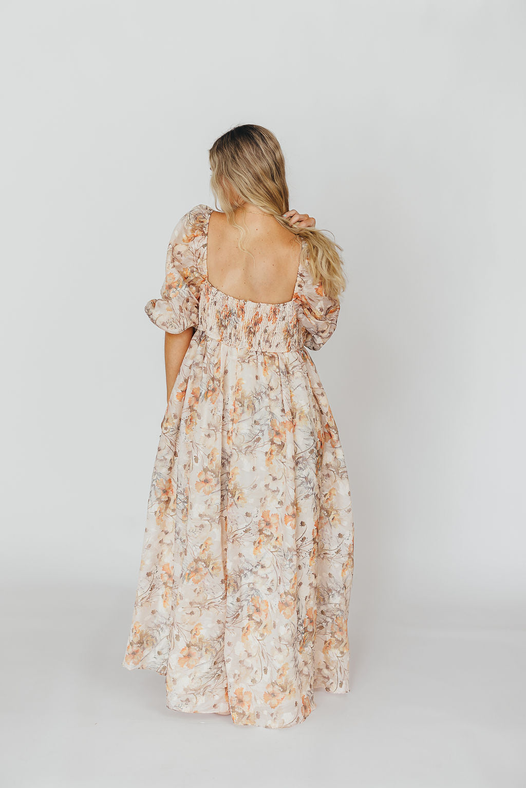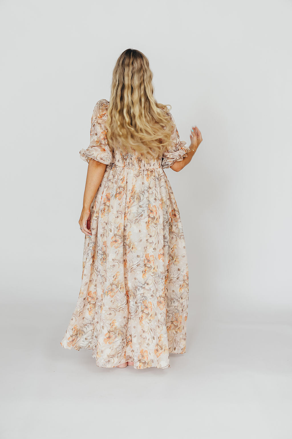 Mona Maxi Dress with Smocking in Beige Multi - Bump Friendly & Inclusive Sizing (S-3XL)