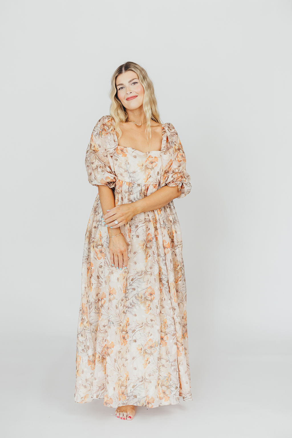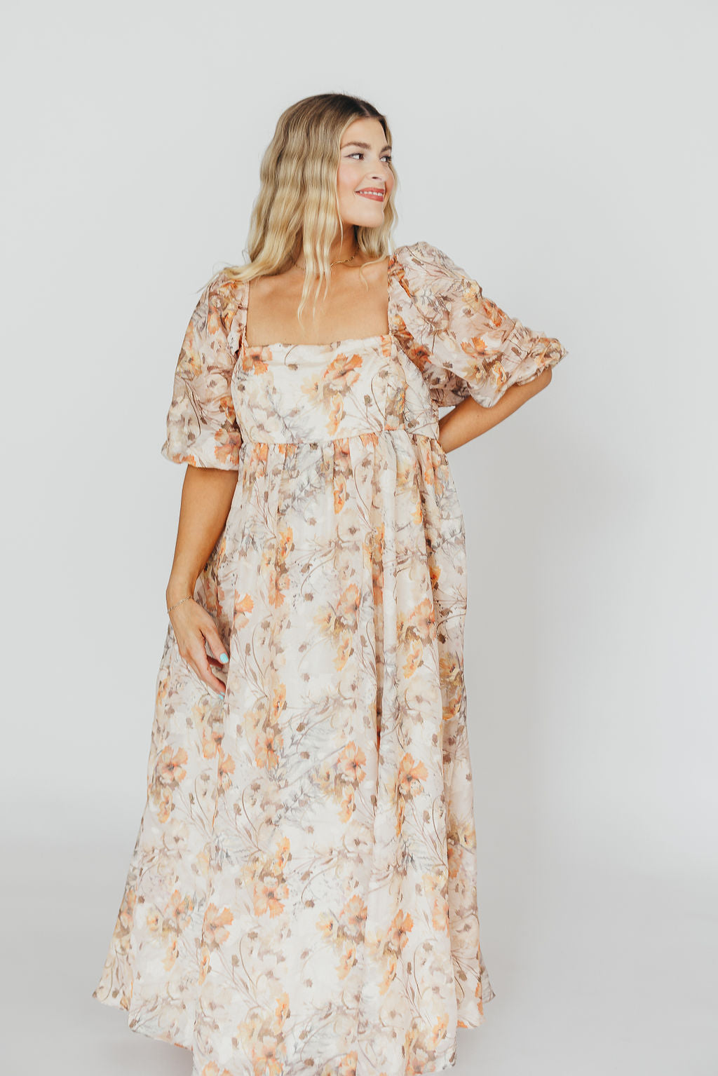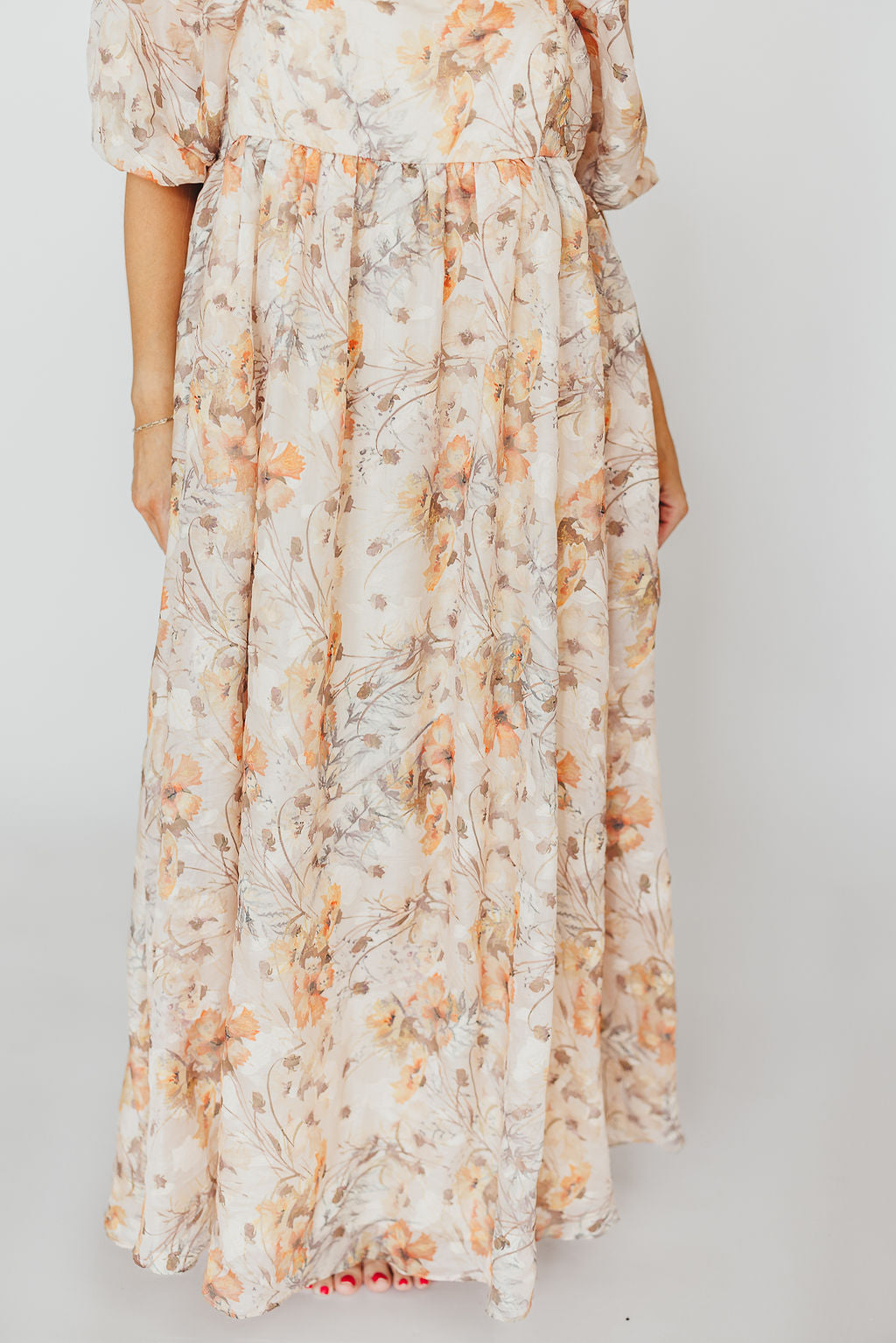 Mona Maxi Dress with Smocking in Beige Multi - Bump Friendly & Inclusive Sizing (S-3XL)