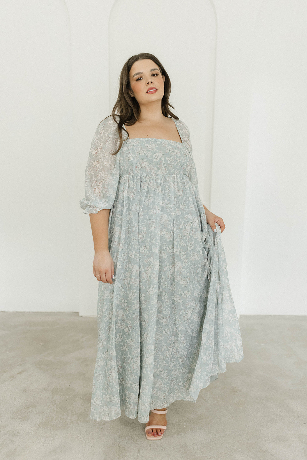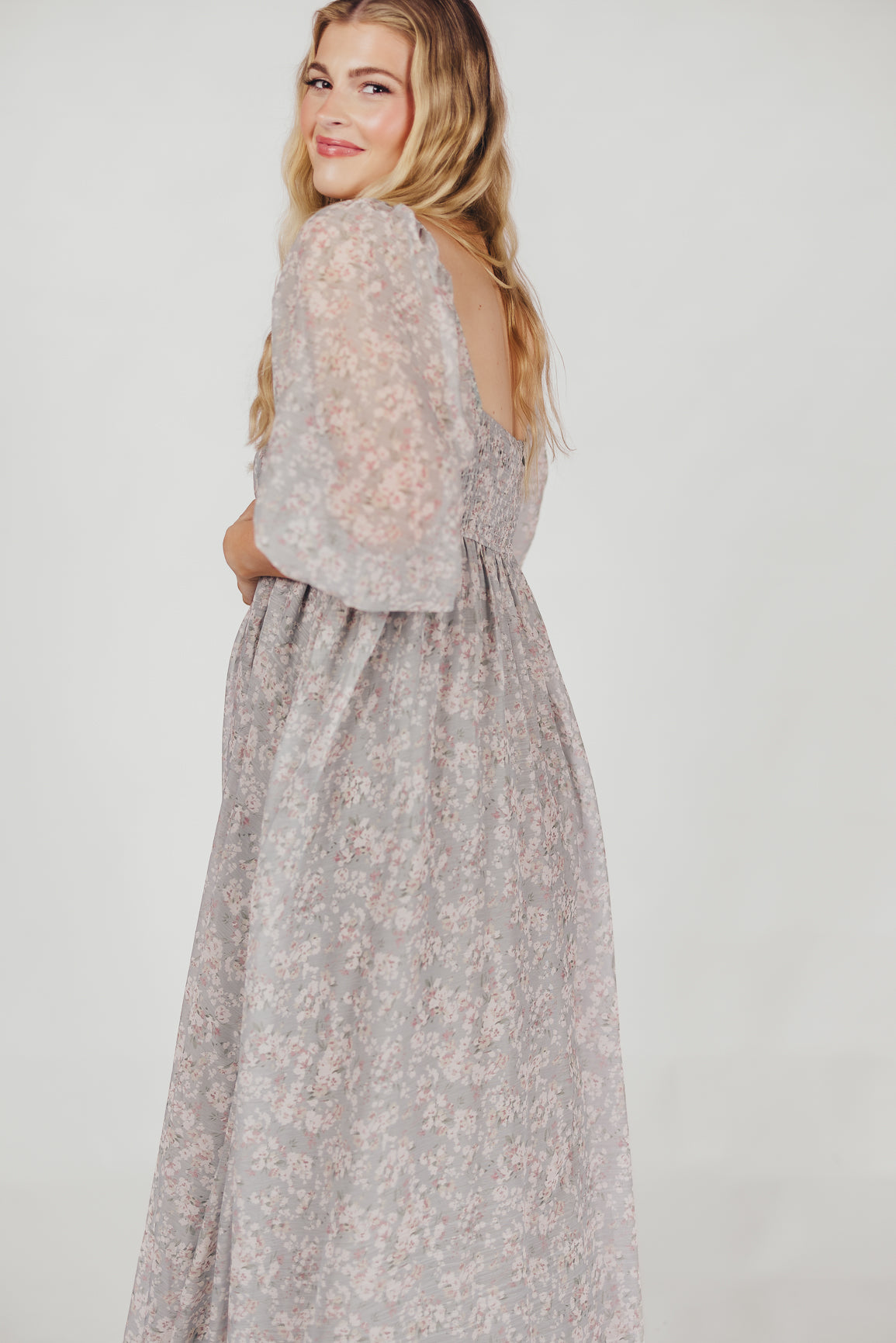 GARMENT DETAILS: Empire-waisted maxi dress in a pastel floral pattern. Features square neckline, sheer 3/4 length puffed sleeves, and bust darts, with a stretchy, smocked back panel. Lined.