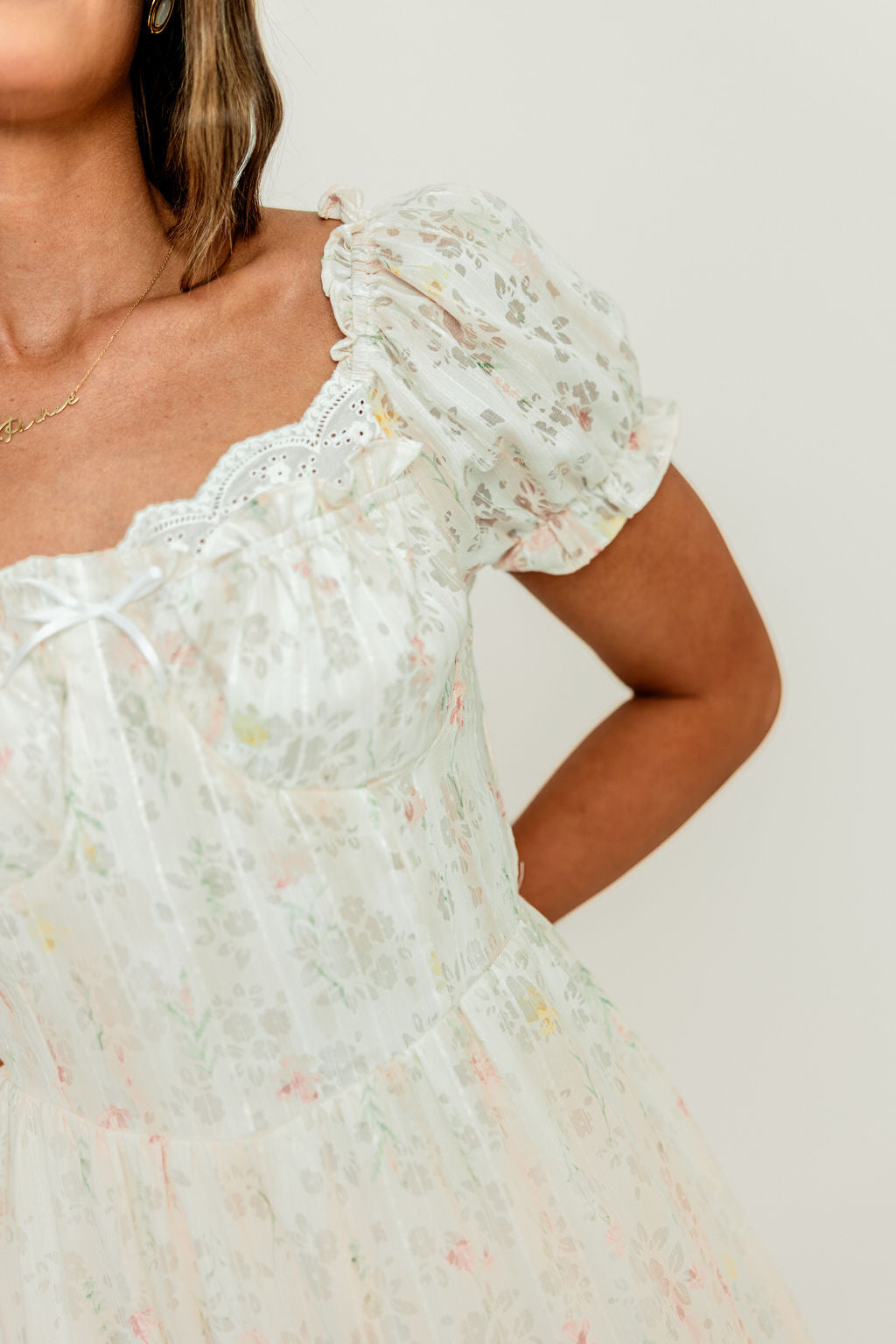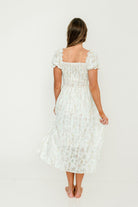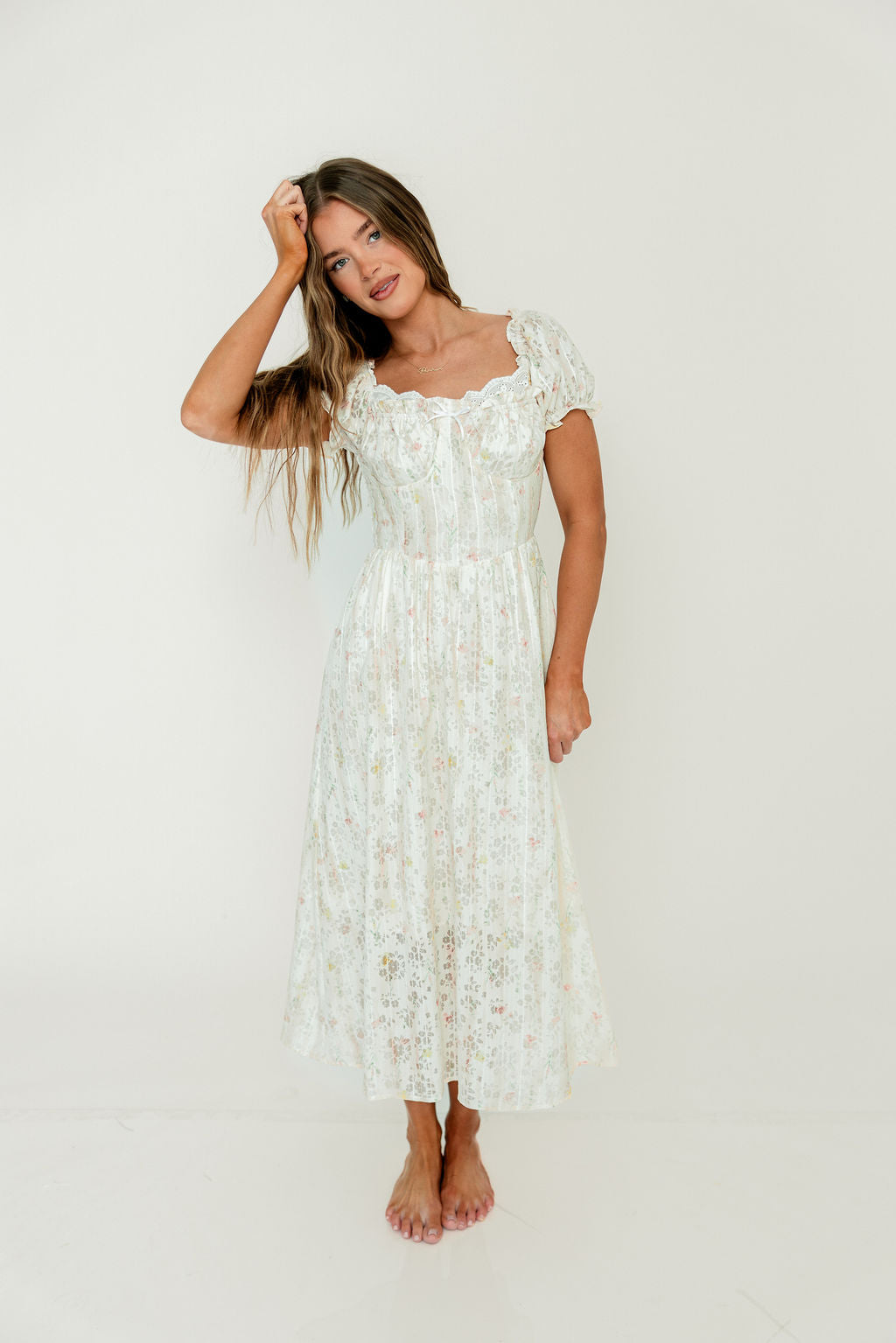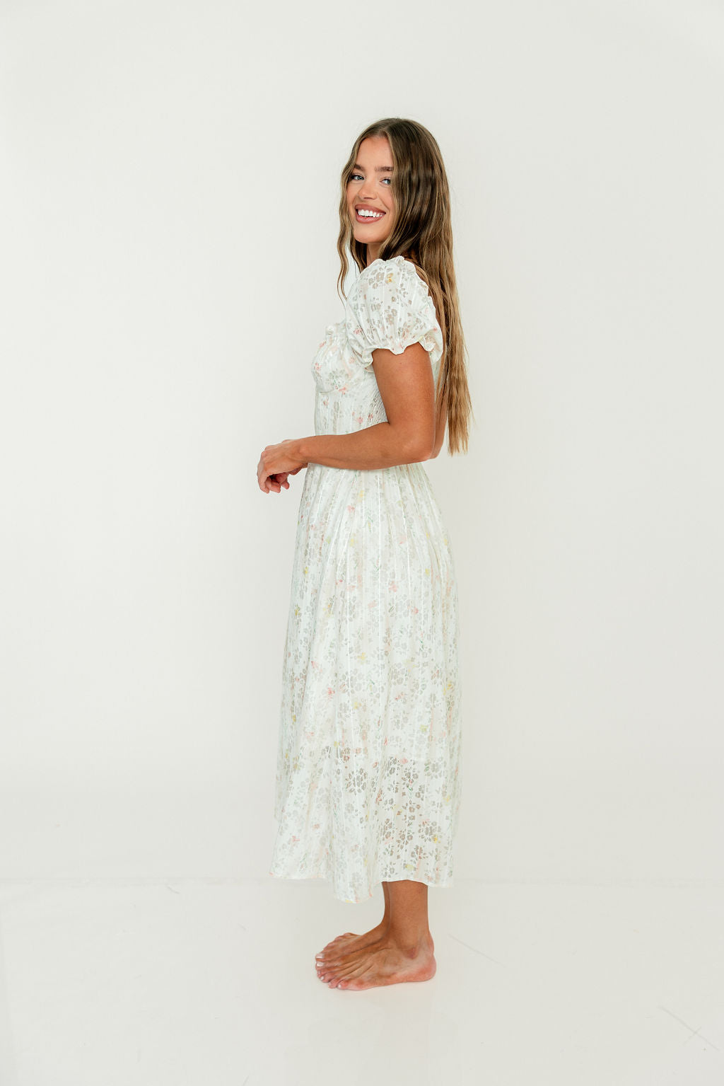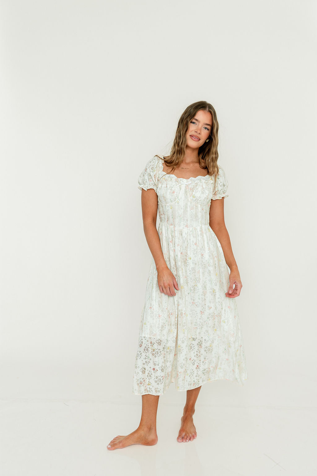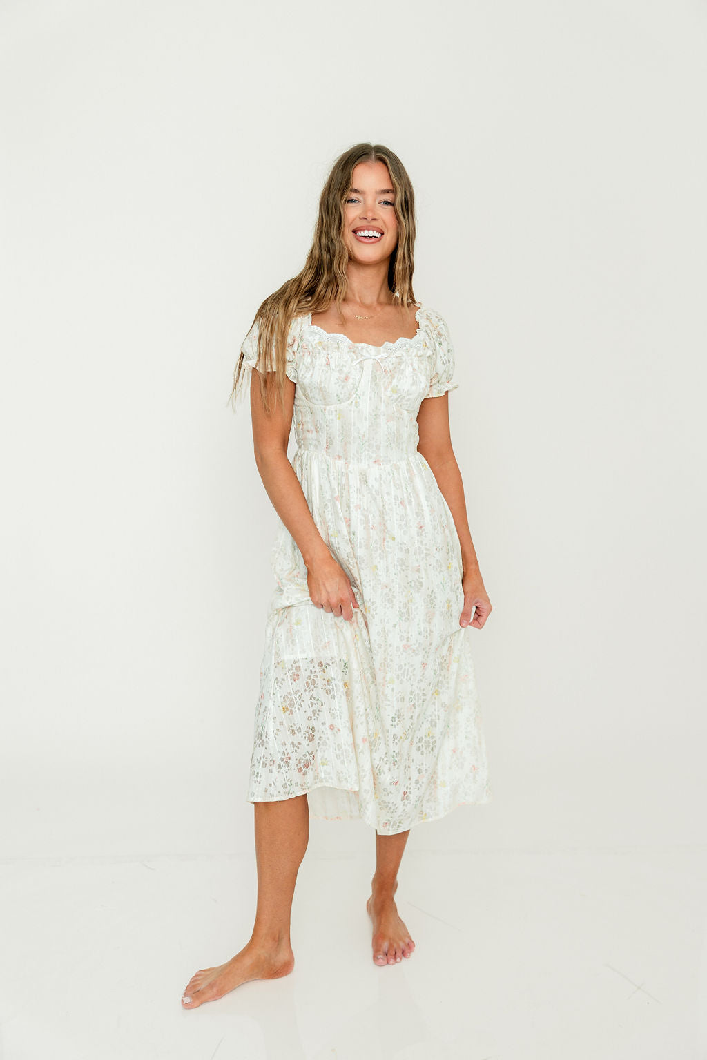 GARMENT DETAILS: Elegant midi dress in a subtle pastel floral print fabric, with sweetheart neckline, puffed short sleeves, and a fitted bodice with defined bra cups. Features delicate lace trim, a smocked back panel for comfort, and partial lining.