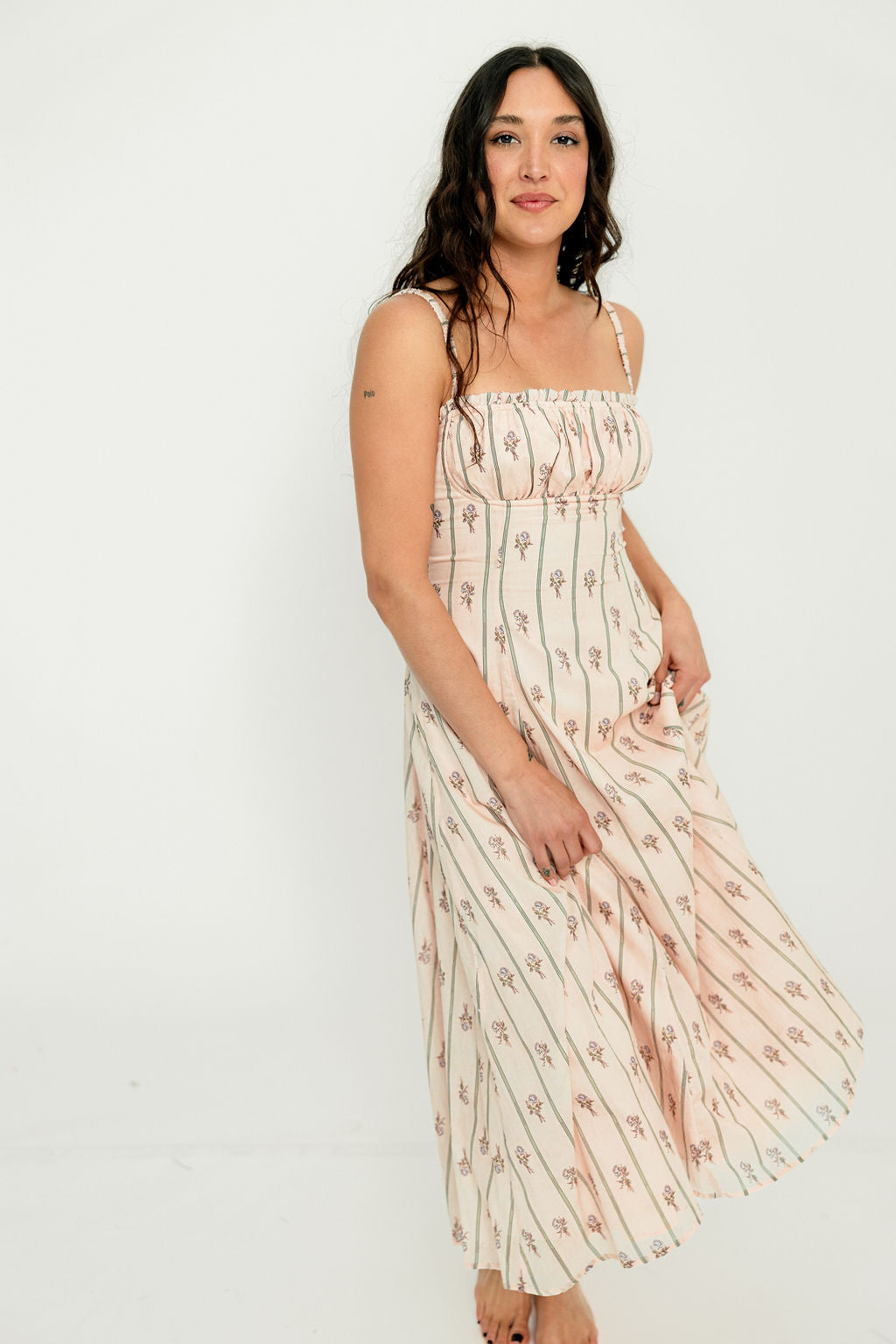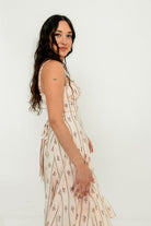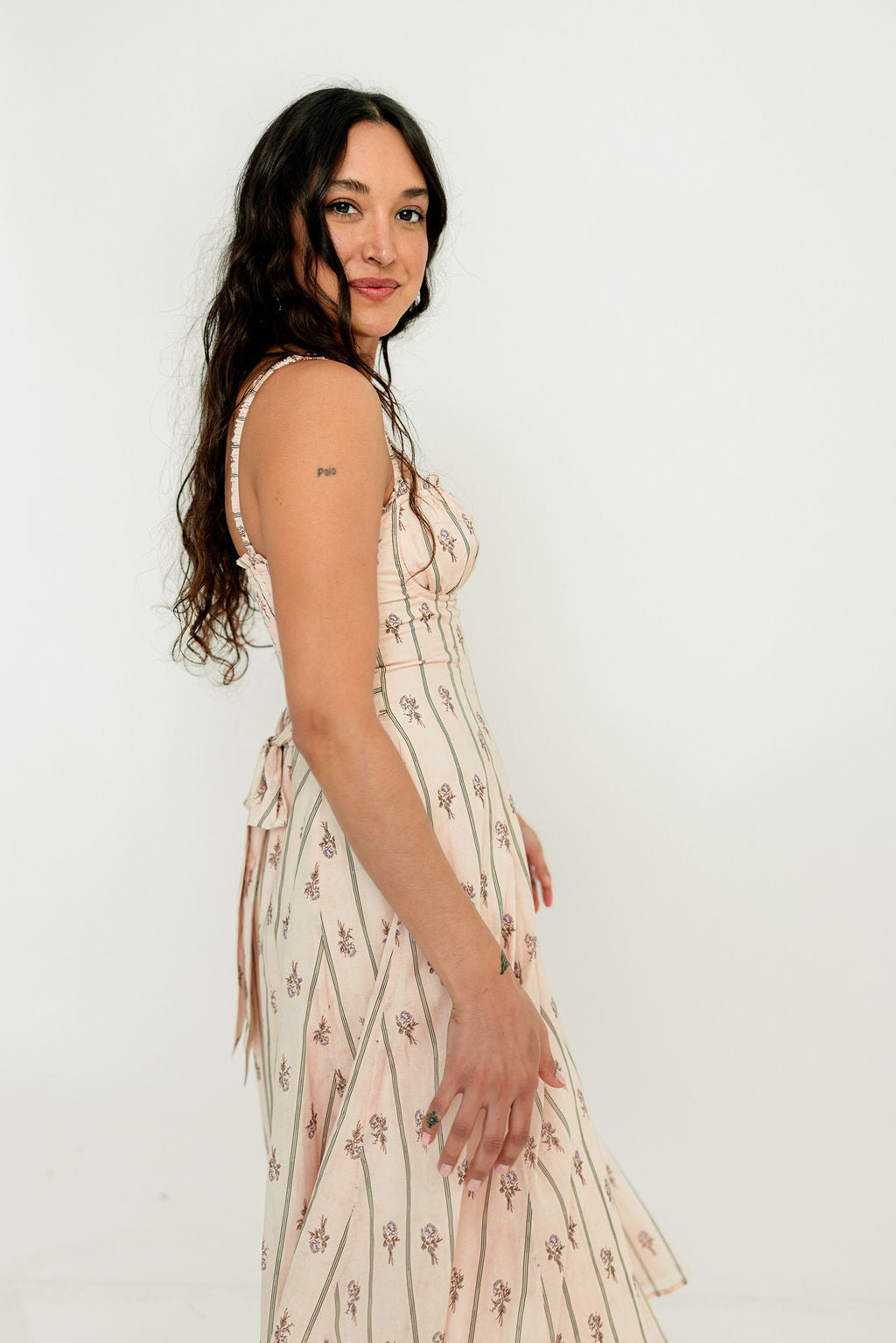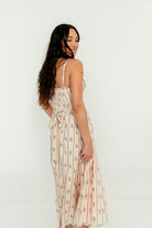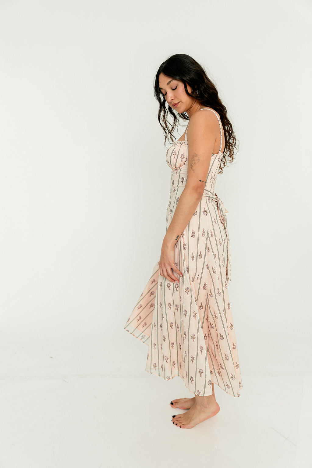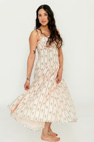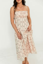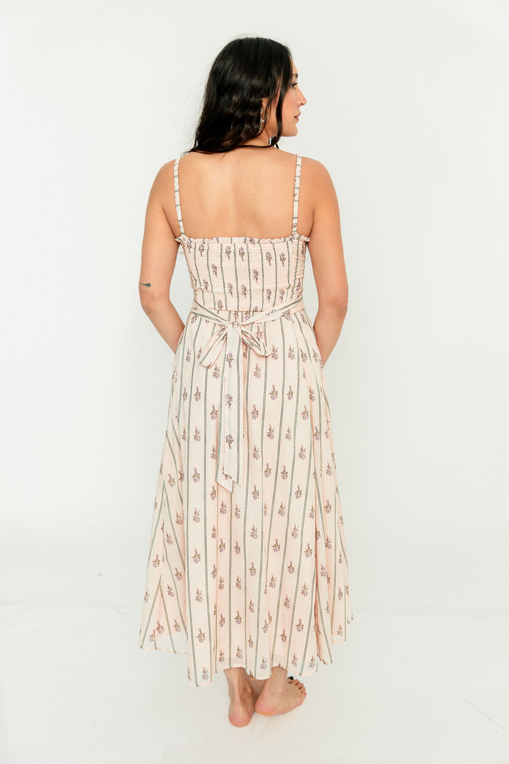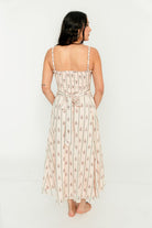 GARMENT DETAILS: Elegant cotton midi dress in a charming floral wallpaper print. Features a defined bust with adjustable spaghetti straps, empire waist, and smocked back panel for comfort. Finished with an invisible back zipper and attached waist sash; fully lined.