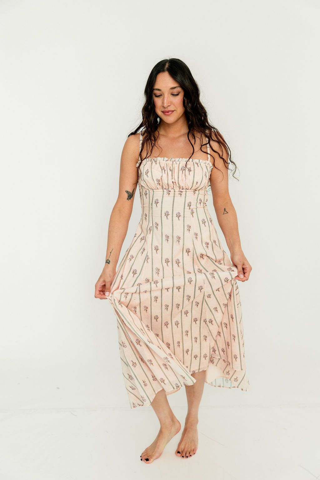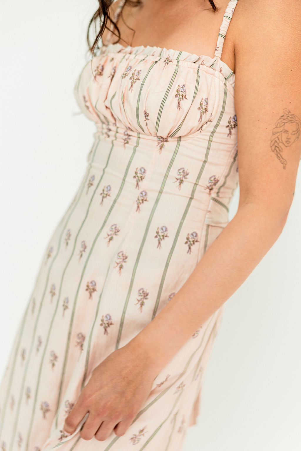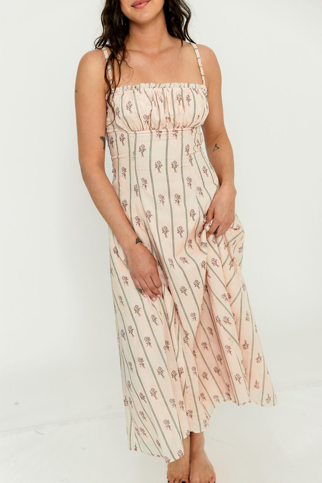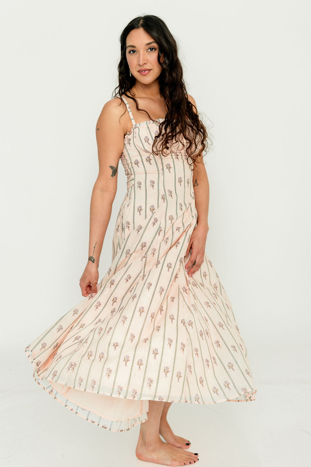 GARMENT DETAILS: Elegant cotton midi dress in a charming floral wallpaper print. Features a defined bust with adjustable spaghetti straps, empire waist, and smocked back panel for comfort. Finished with an invisible back zipper and attached waist sash; fully lined.