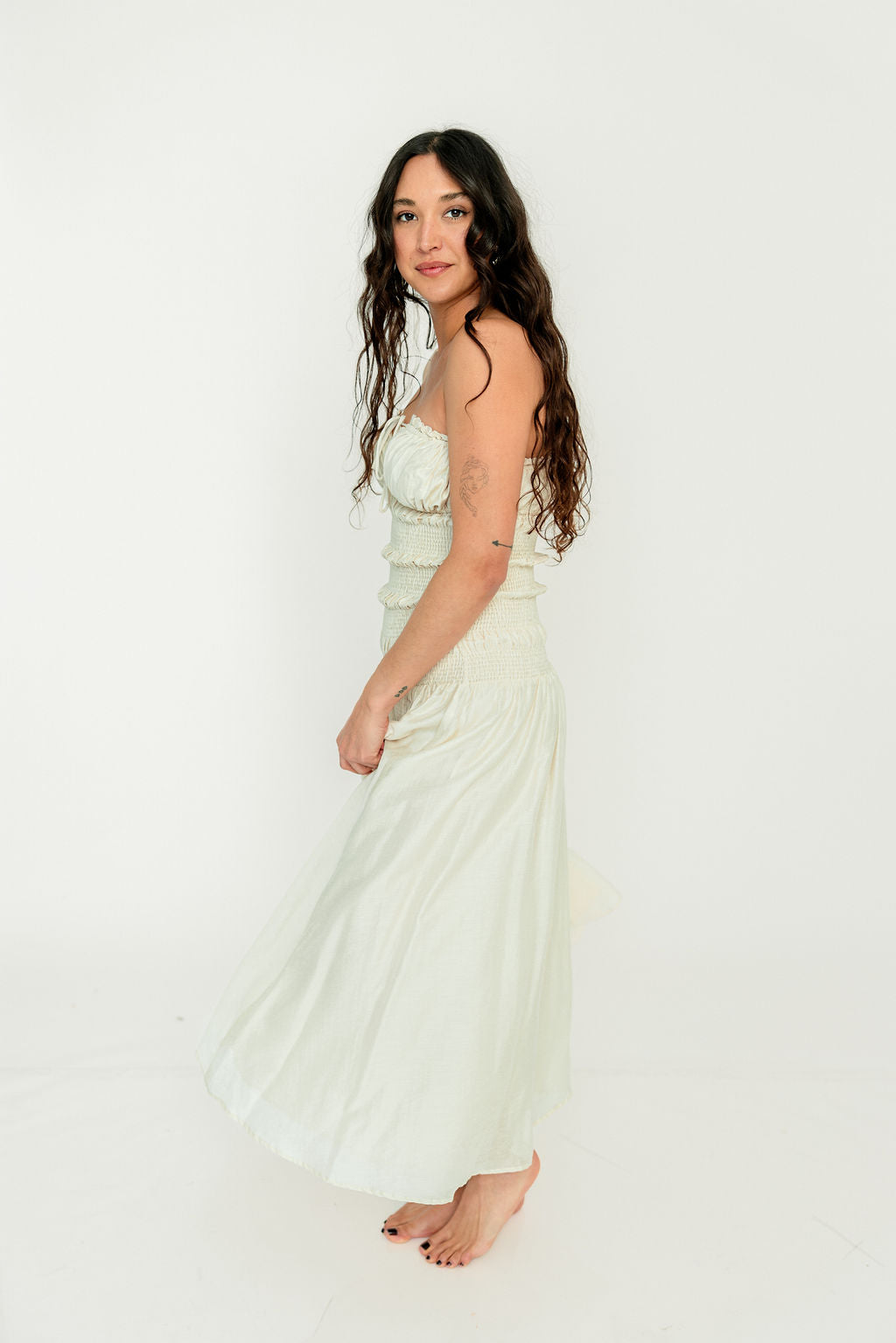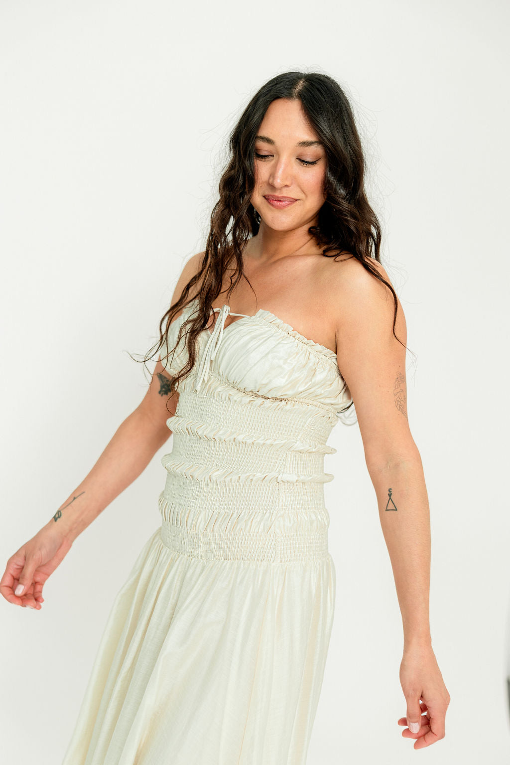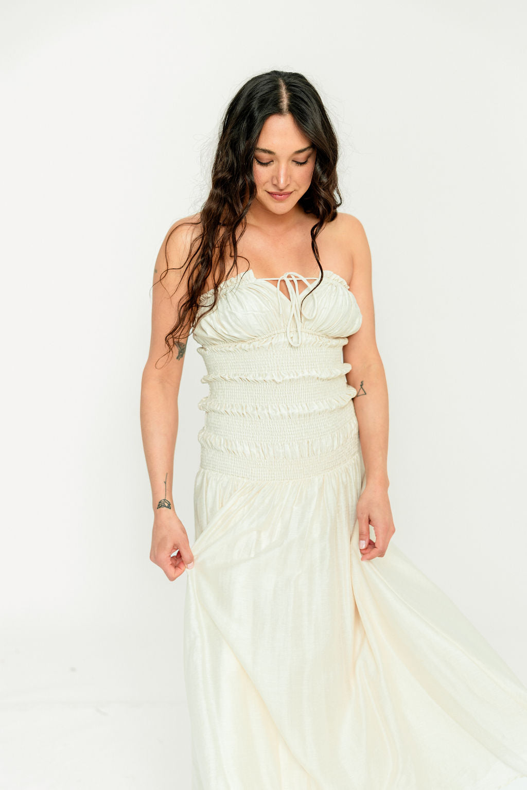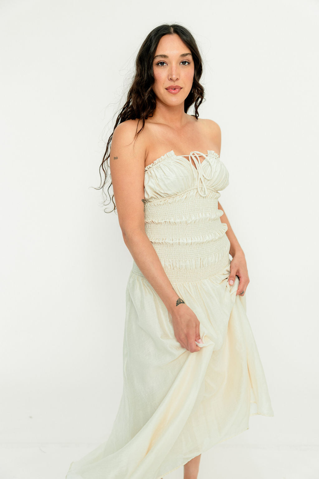 Myra Strapless Smocked Bodice Tube Maxi Dress in Cream