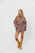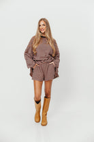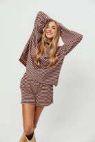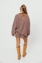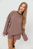 GARMENT DETAILS: Soft, relaxed-fit striped set. Top features a crewneck, long sleeves, and dropped shoulders. Shorts feature an elasticated waistband and split hem.