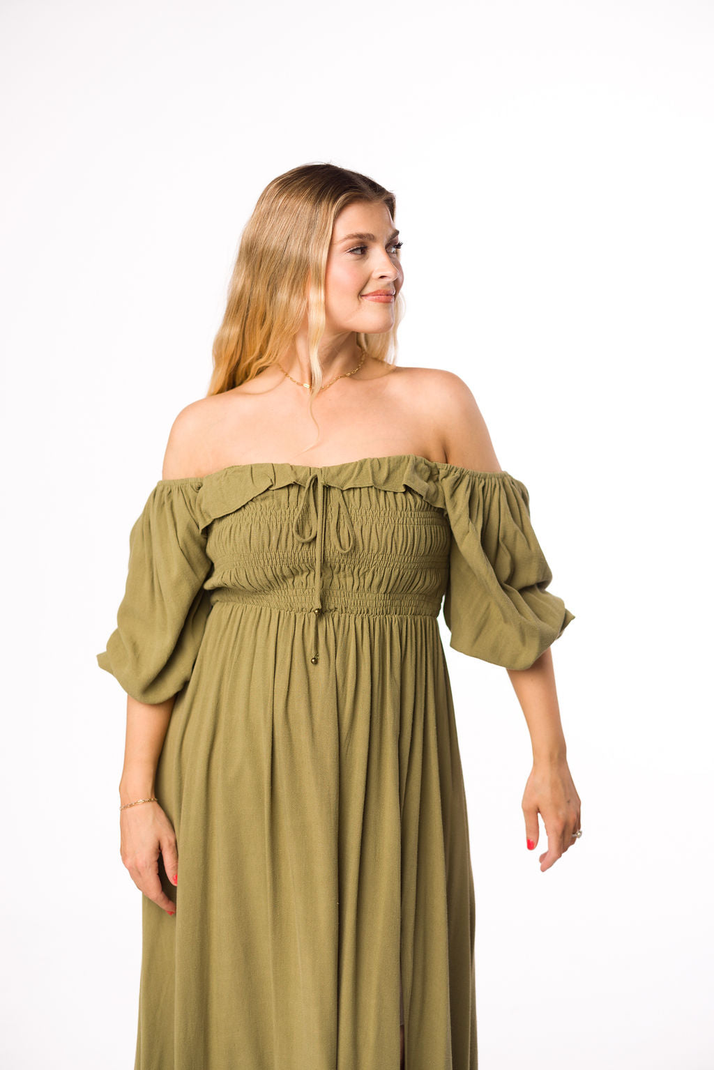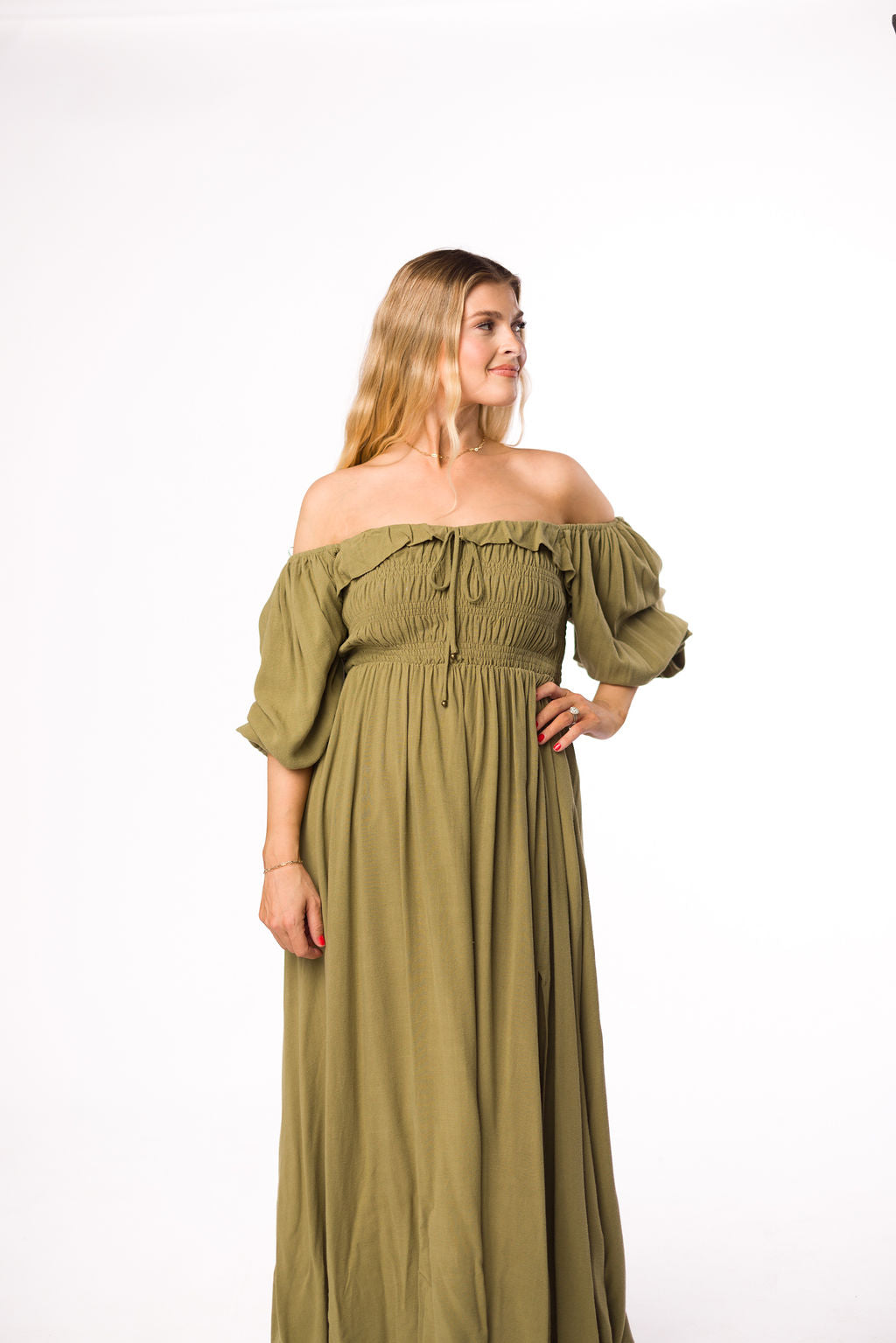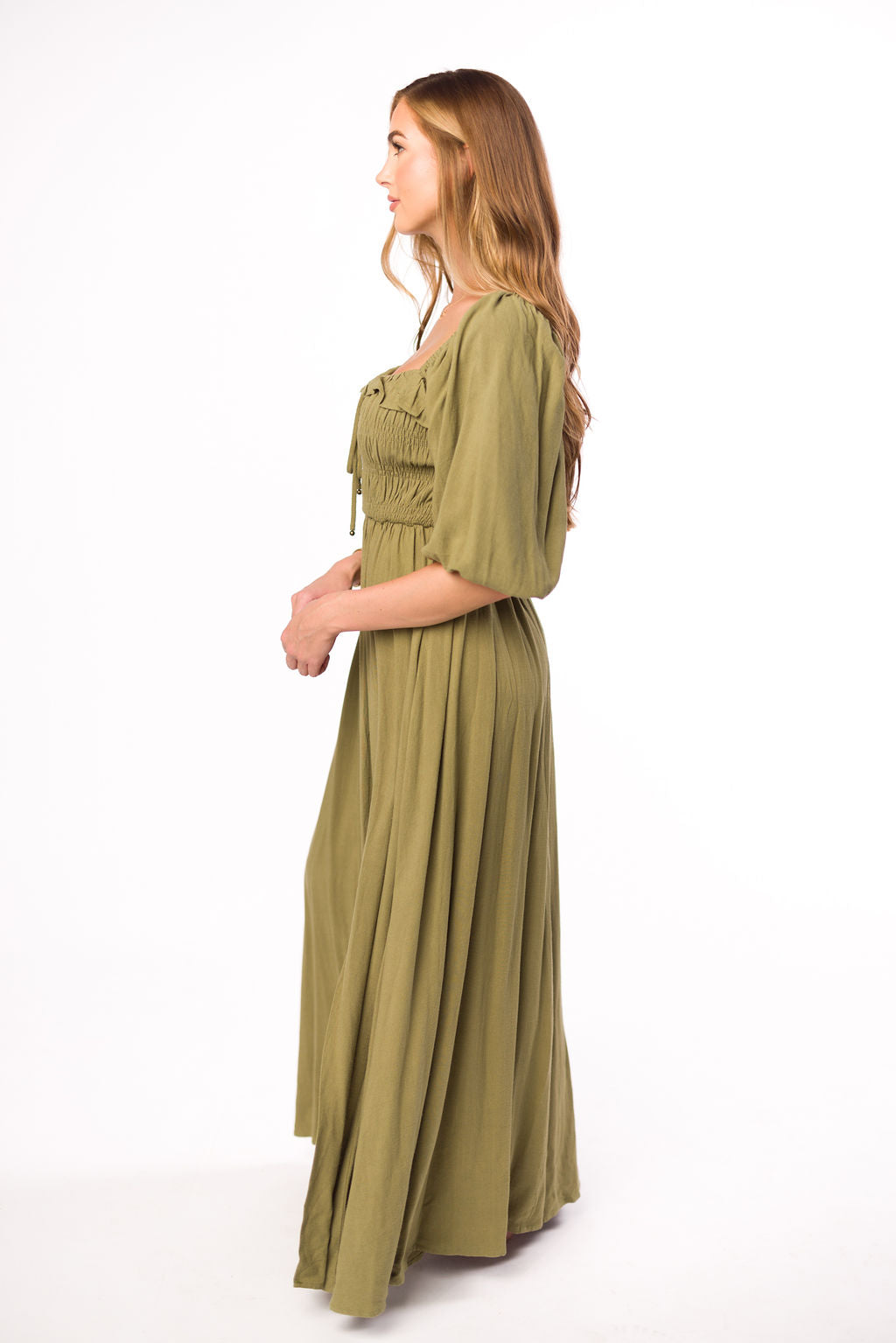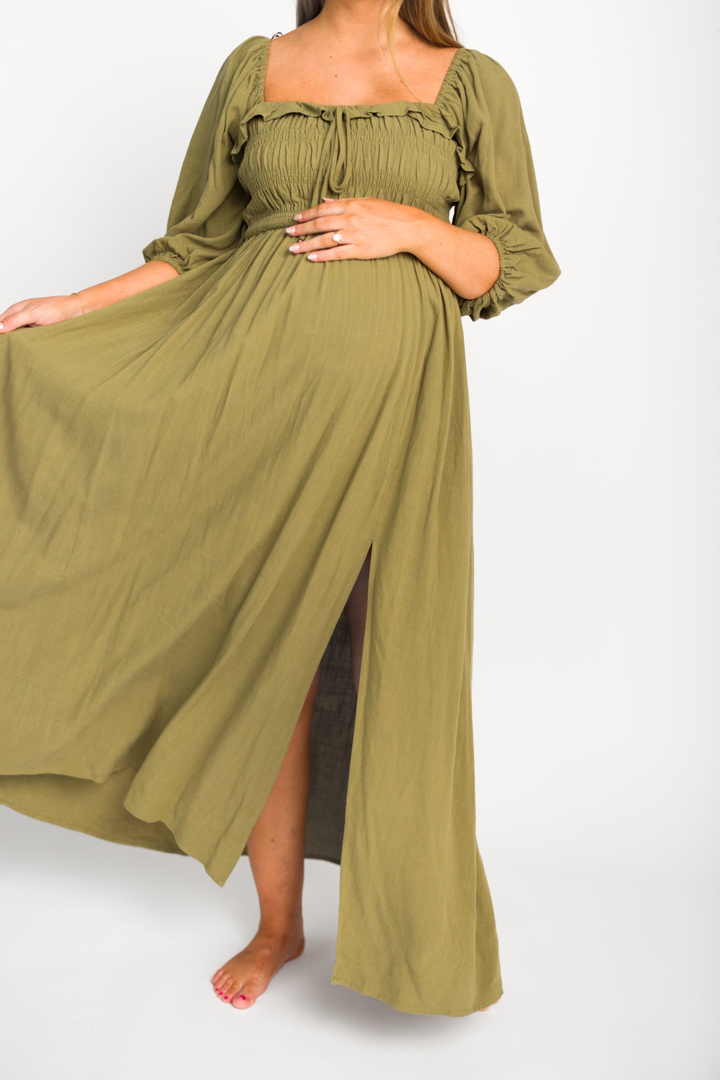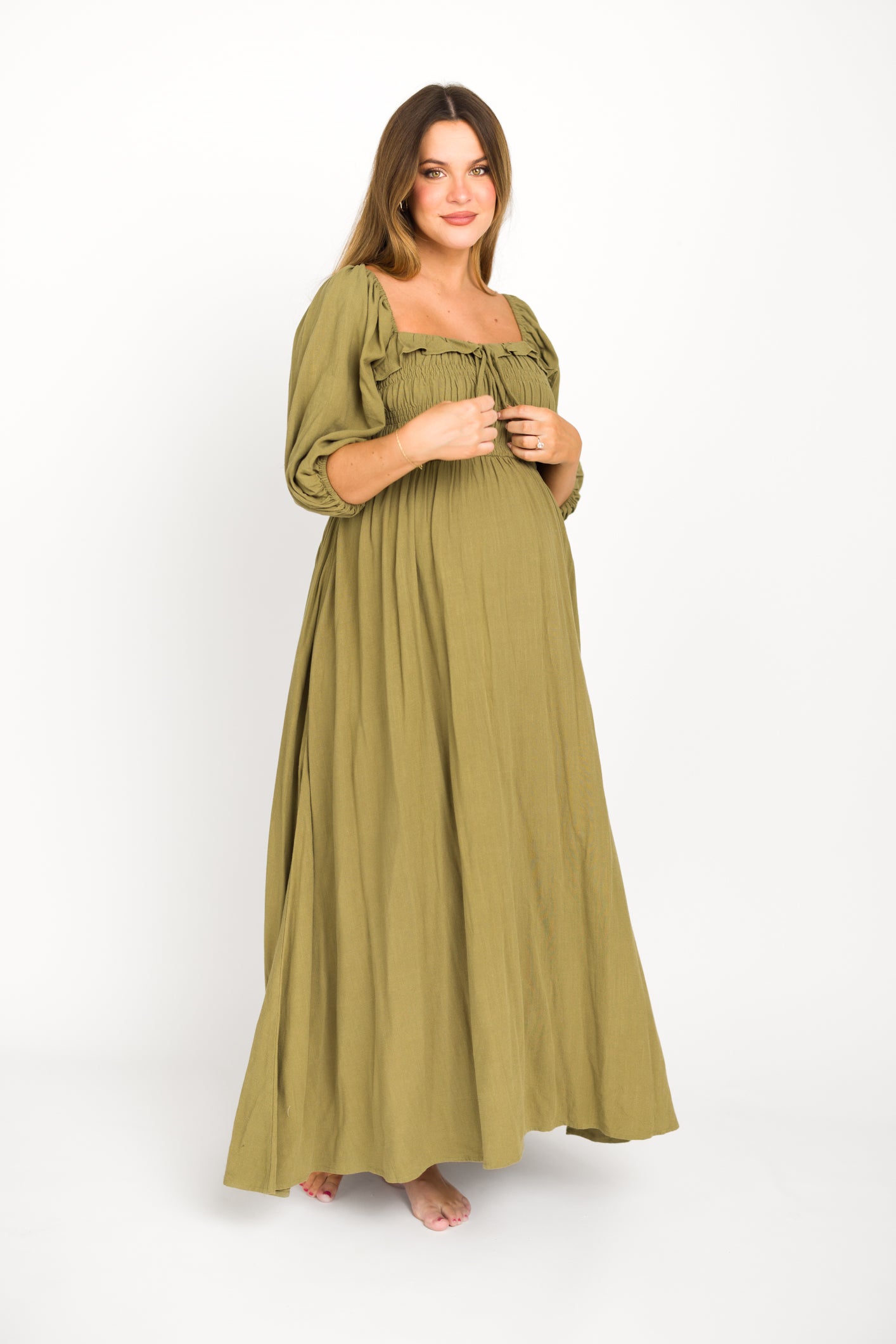 Devon Smocked Maxi Dress in Light Olive - Bump Friendly