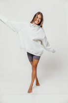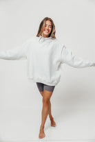 GARMENT DETAILS: Soft, oversized sweatshirt top with dropped shoulders, long sleeves, and rib banded hemline and cuffs. Features a reversible design and cozy mockneck.
