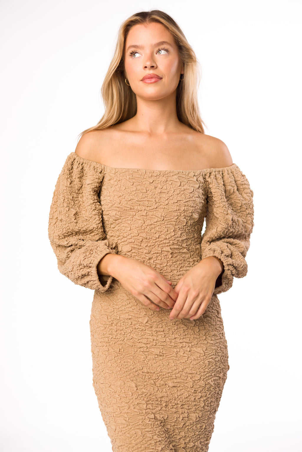 Be the envy of every holiday party this season in the Darcy Midi Dress! This flattering dress features playful 3/4 length blouson sleeves, with a fitted silhouette and textured fabric that elevates its elegant style. Pair with strappy heels for the perfect night out!