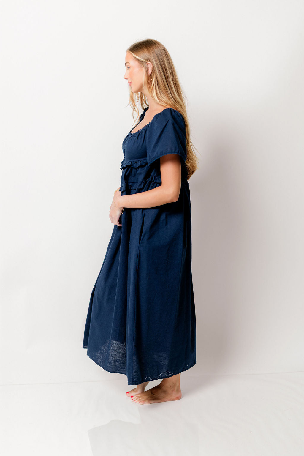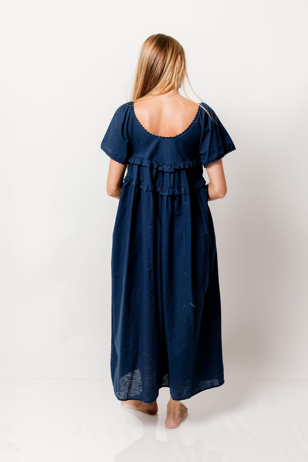 Tawny Long Smocked Cotton & Linen Midi Dress in Navy
