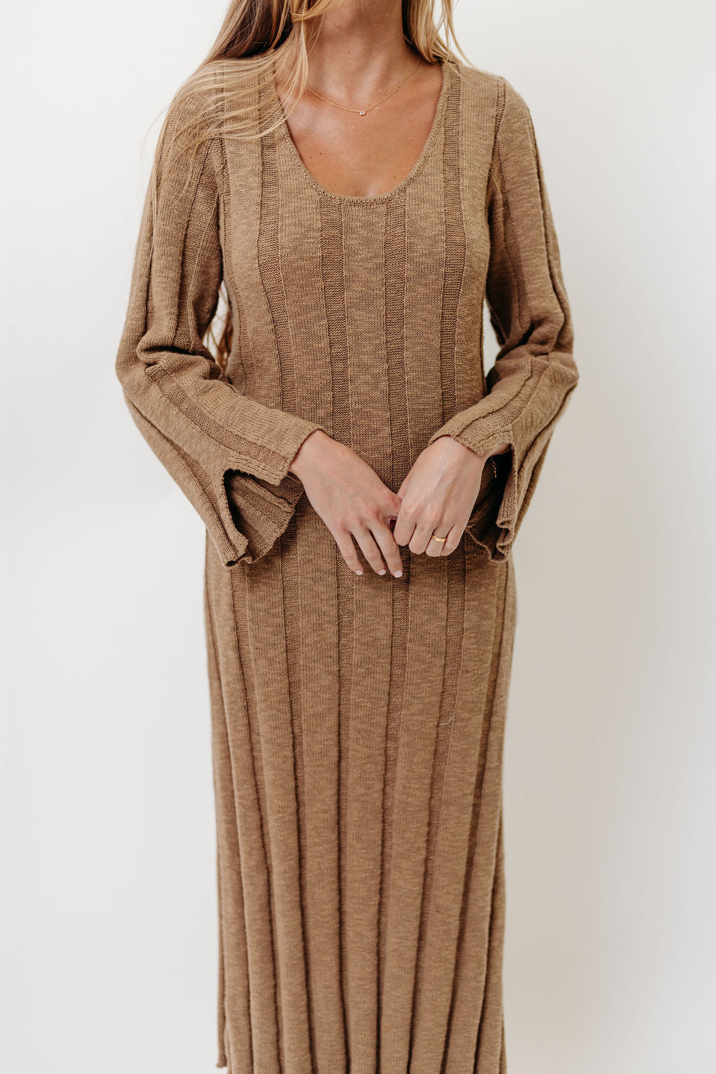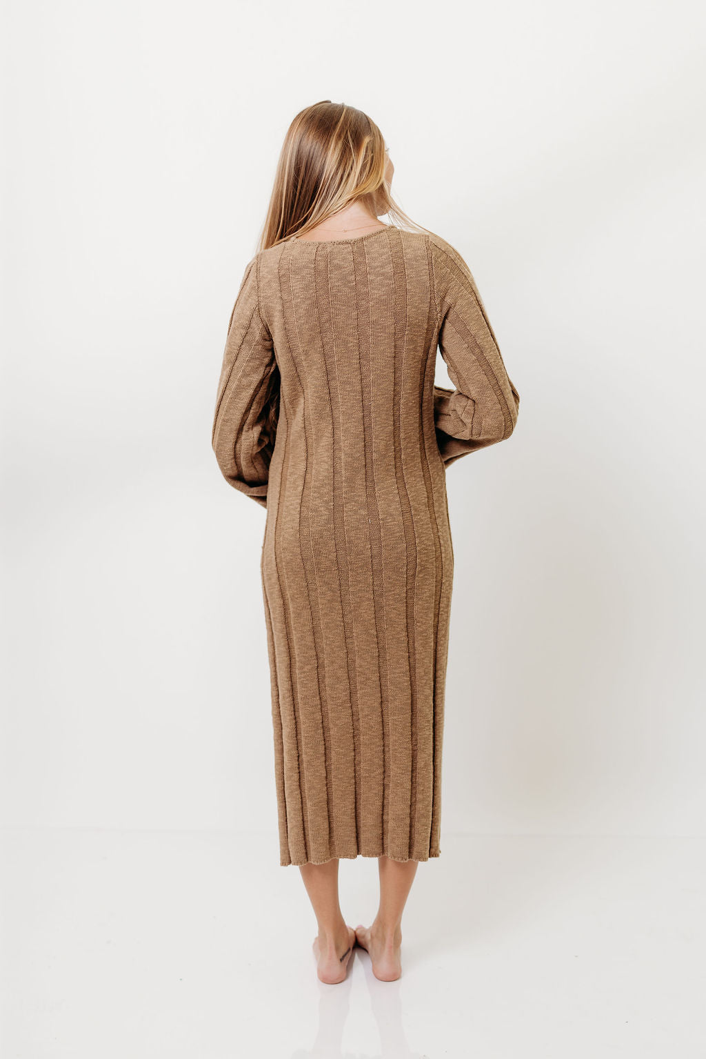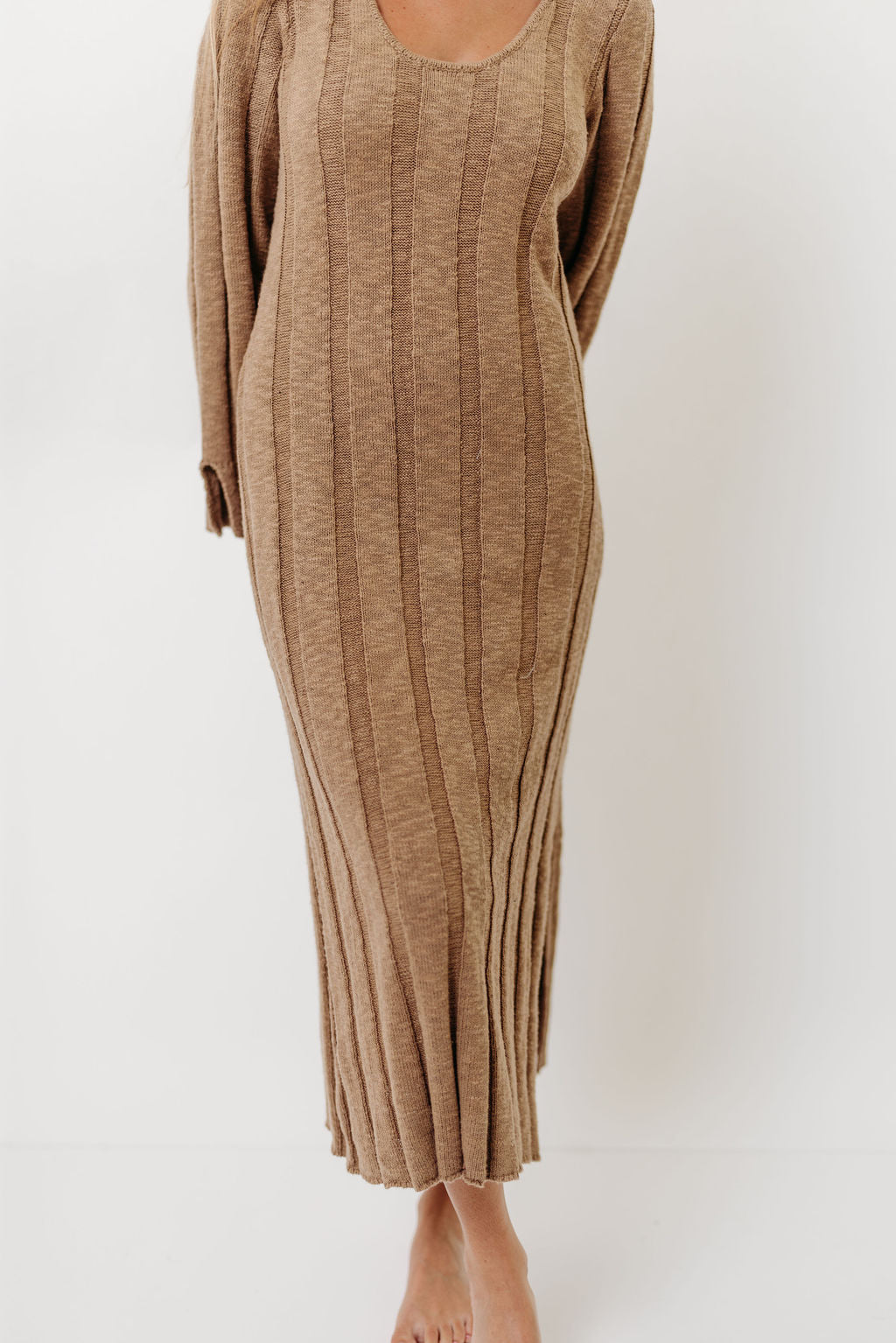 GARMENT DETAILS: Premium 100% cotton knit dress with scooped neckline, long sleeves with split cuffs, and a semi-fitted silhouette. Features a side slit in the skirt for comfort.