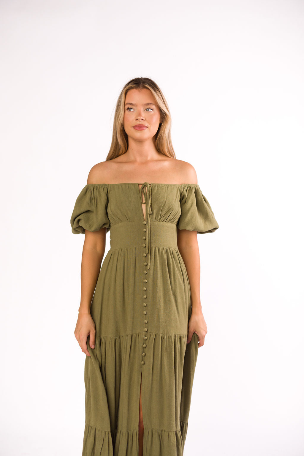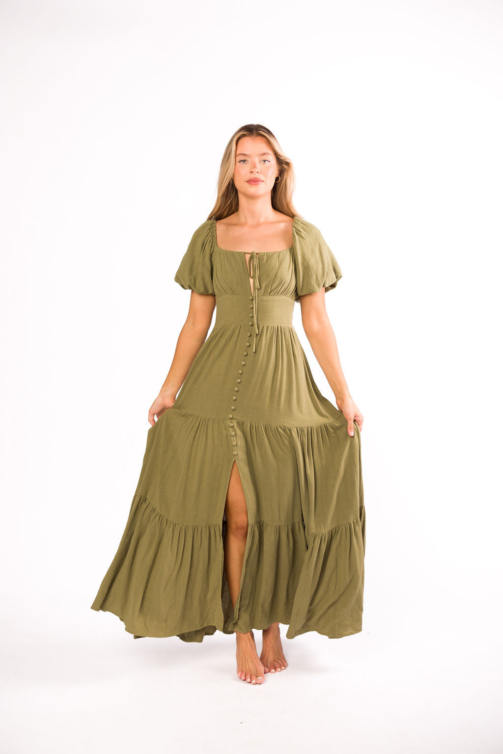 GARMENT DETAILS: Lightweight linen blend maxi dress, with short puffed sleeves and a multi-tiered design. Fully lined.