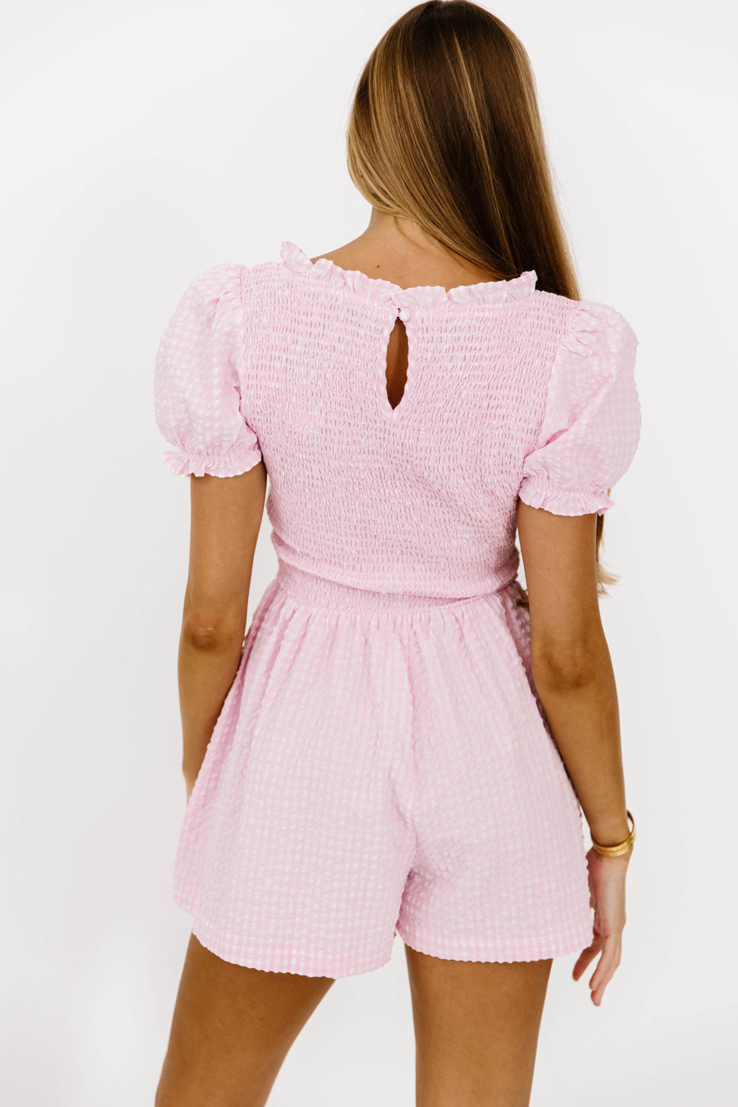 GARMENT DETAILS: Lightweight seersucker shortie romper in a charming gingham print. Features square neckline, puffed sleeves, and side pockets, with a fully smocked bodice and back button detail.