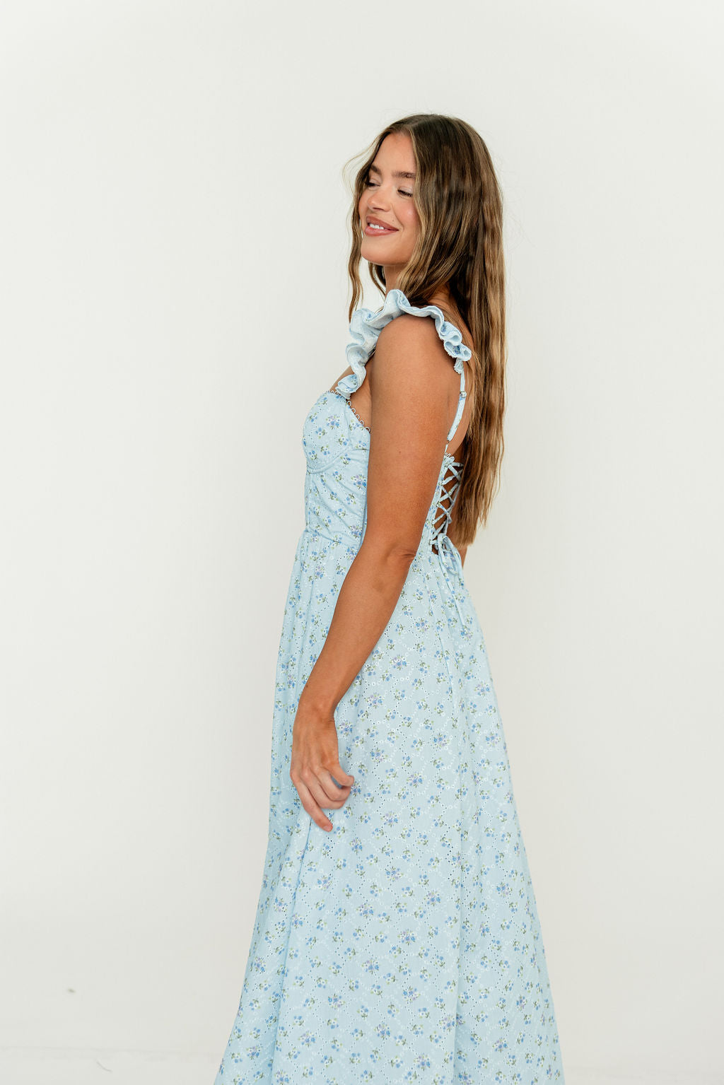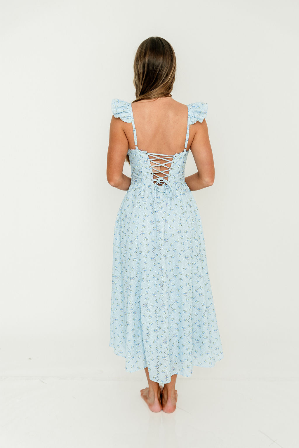 GARMENT DETAILS: Charming chiffon midi dress in a lighthearted floral print, with sweetheart neckline, bustier-style bodice, and ruffled shoulder straps. Features an adjustable lace-up back and full lining.
