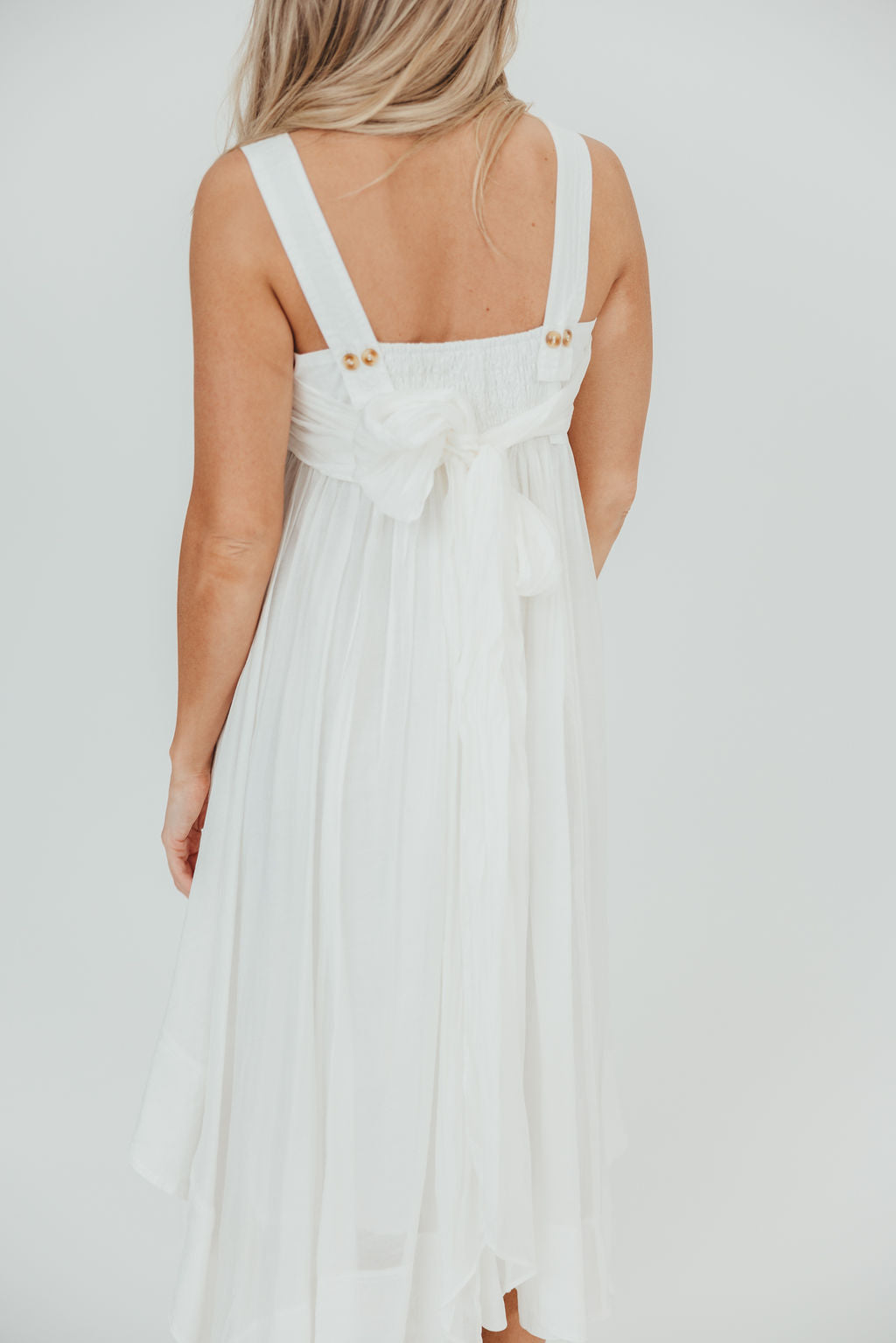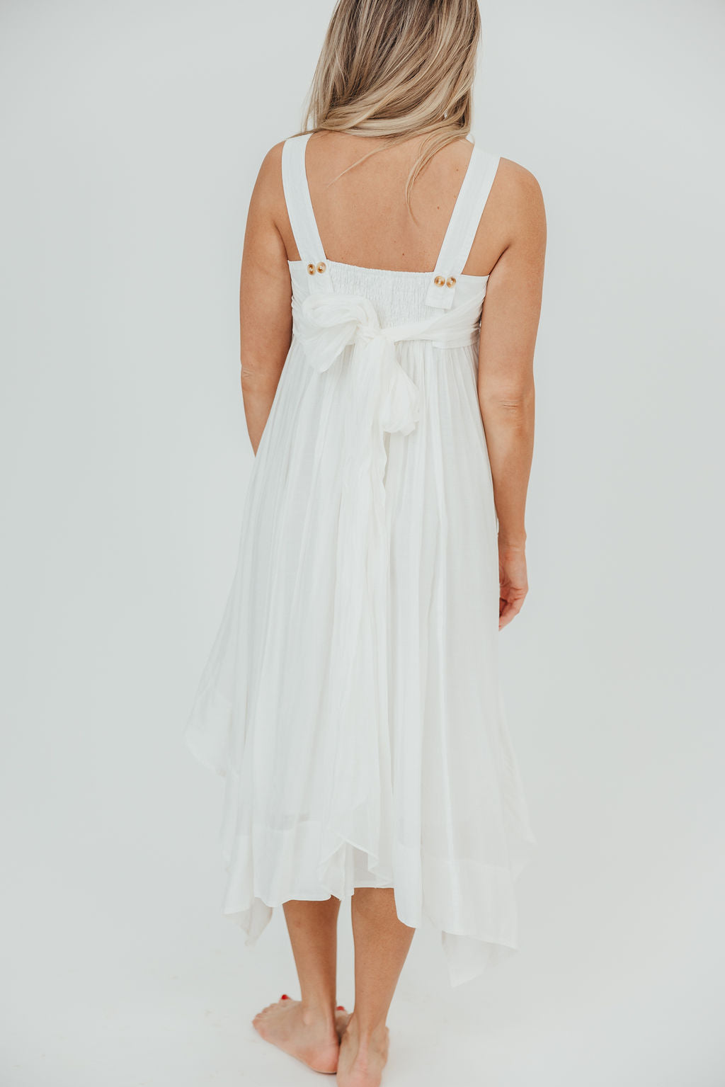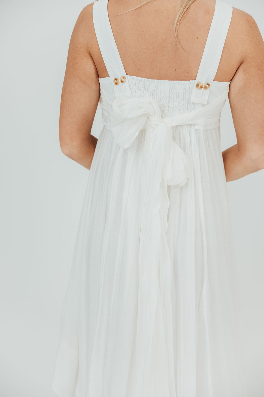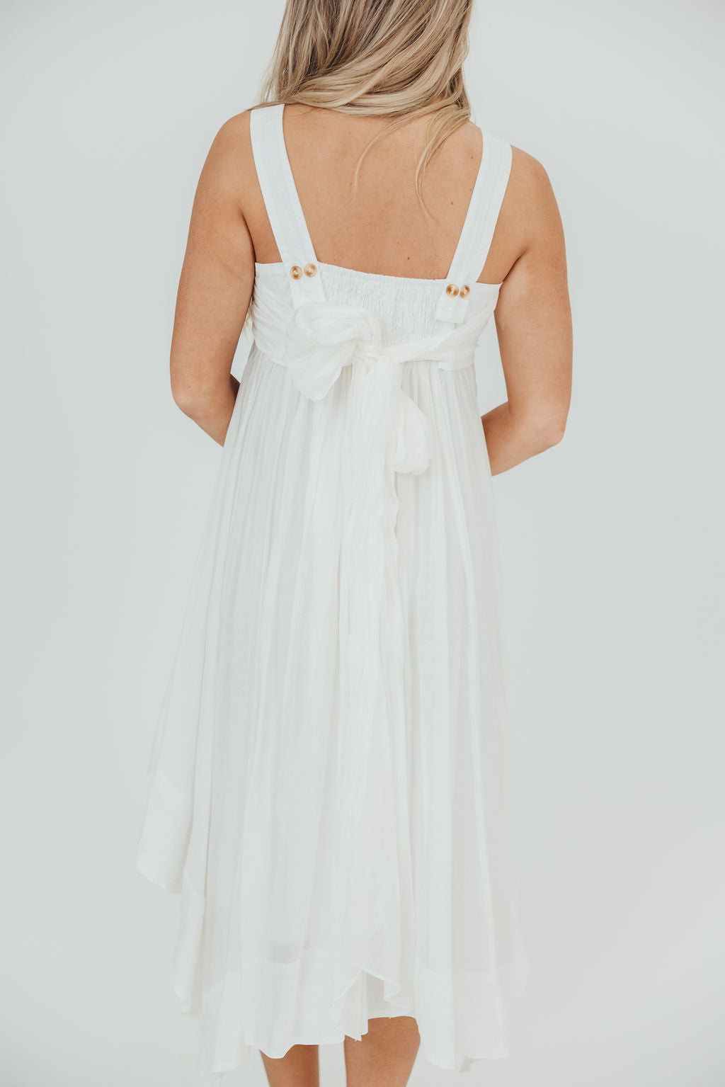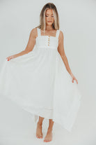 GARMENT DETAILS: Sleeveless trapeze midi dress in a lightweight poplin. Features a square neckline, with empire waisted bodice, smocked back panel, and tortoiseshell button details. Skirt is voluminous, with a handkerchief hemline and a self-tie back sash.