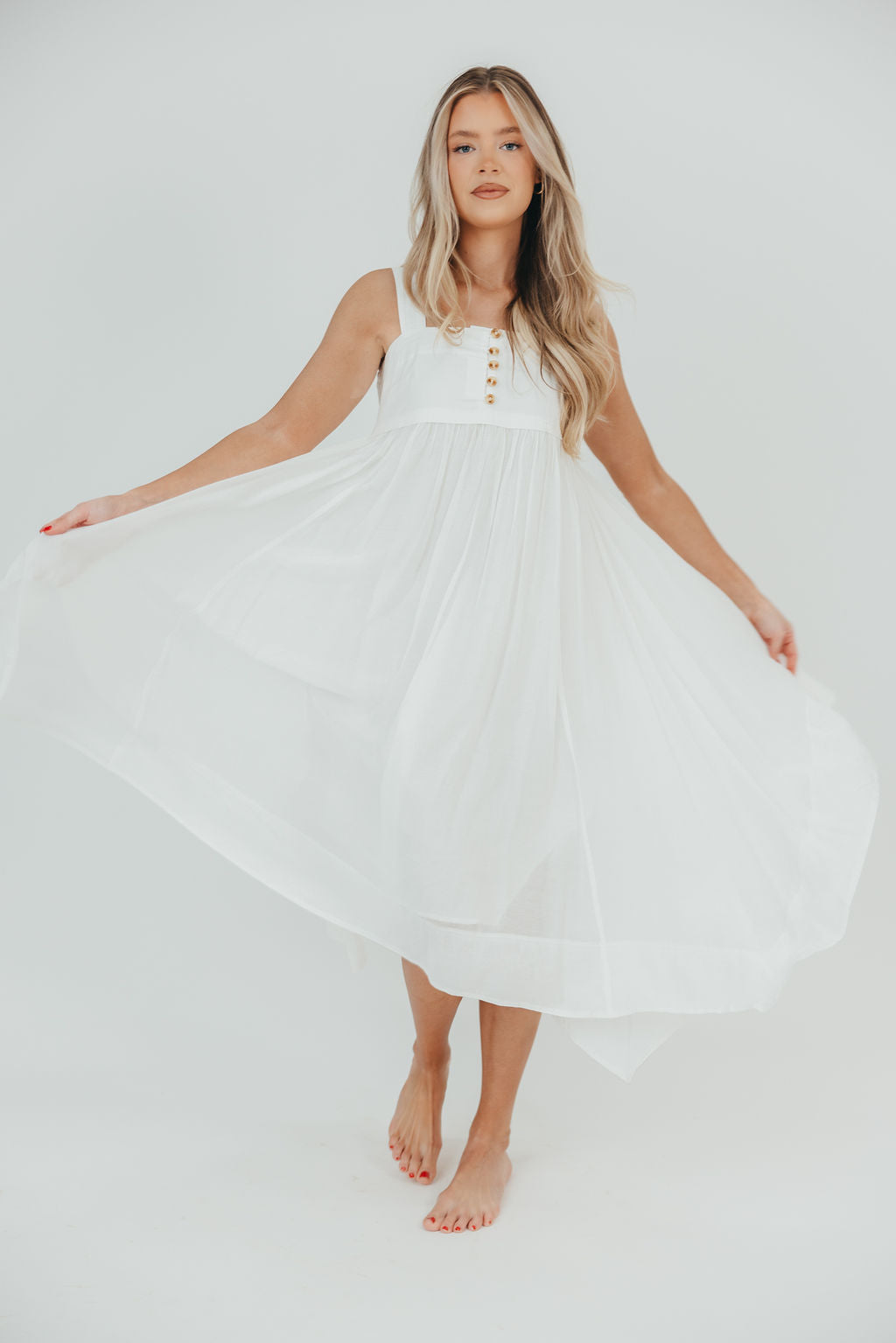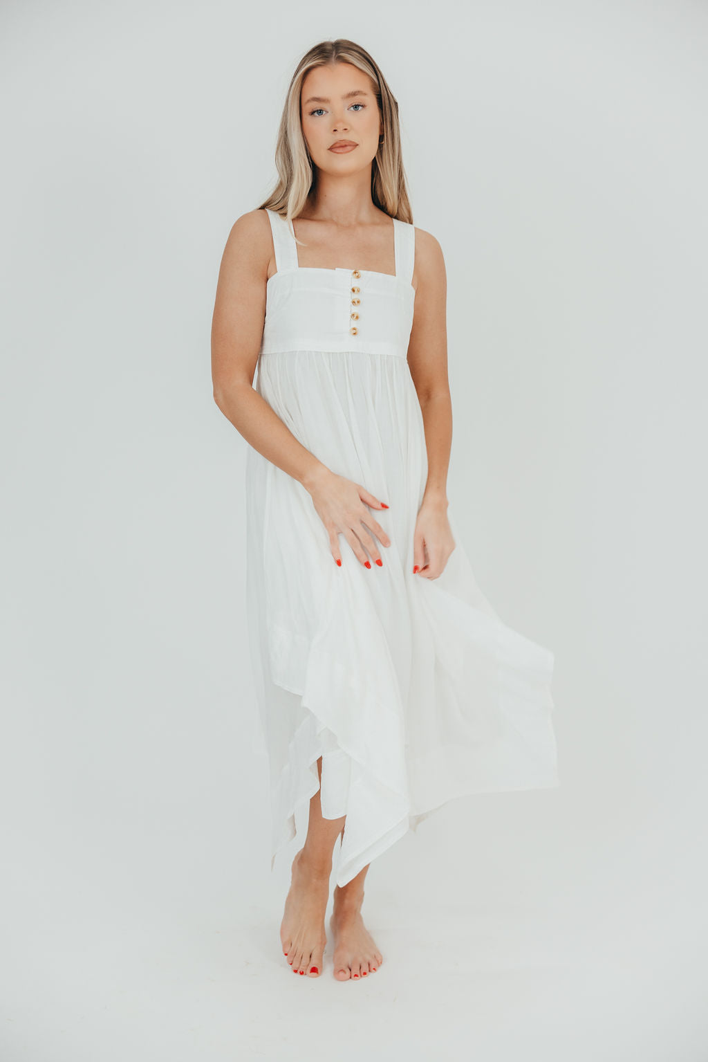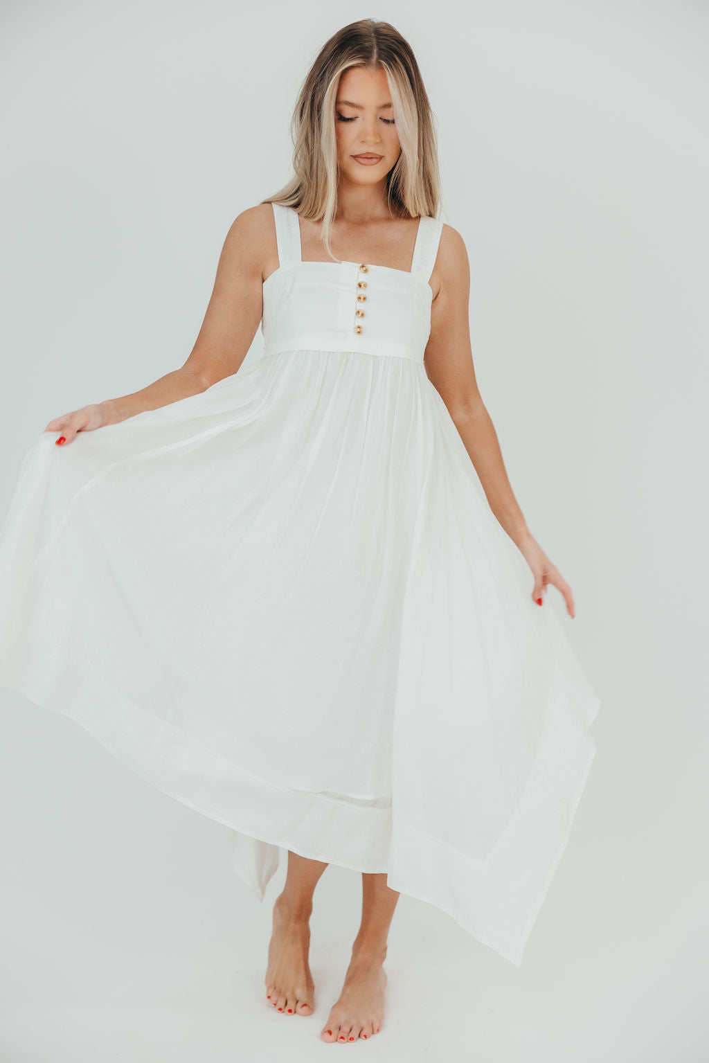 There are so many reasons to love this dress! The Ariella offers a crisp, lightweight poplin paired with a flattering square neckline, dainty tortoiseshell buttons, and a gorgeous handkerchief hemline. It's sweet and charming, and an absolutely elegant choice for summer soirées!