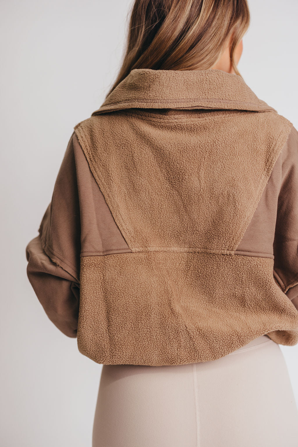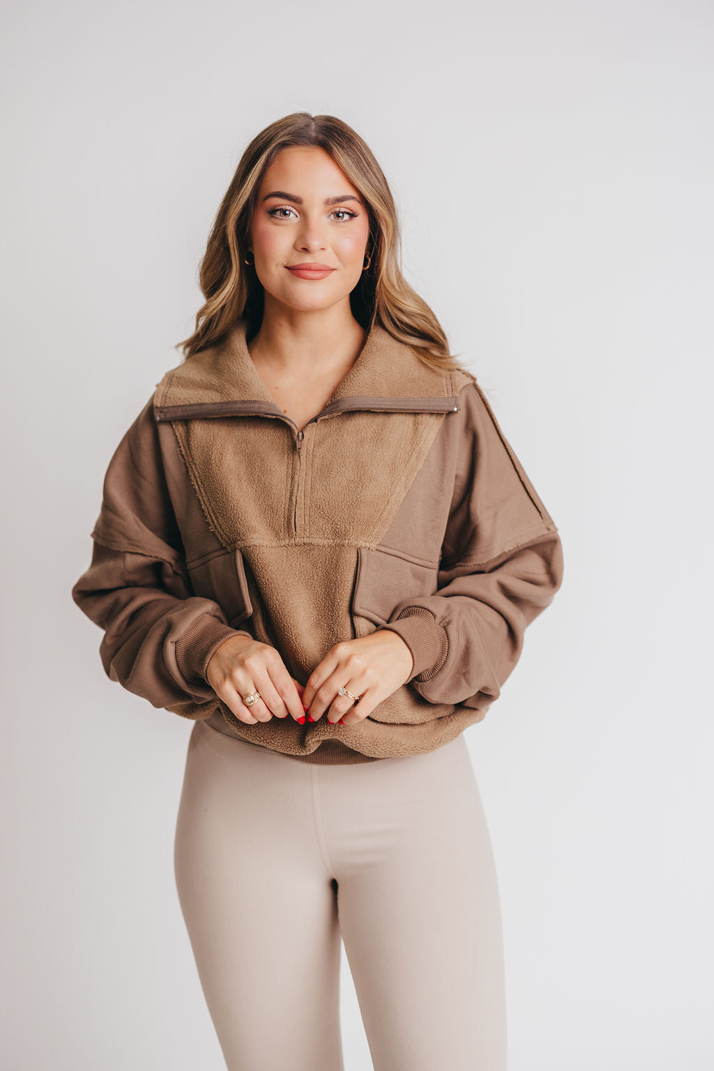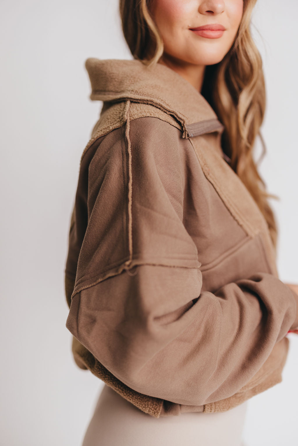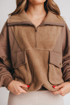 GARMENT DETAILS: Brushed terry pullover with a slouchy silhouette and 1/4 zip neckline. Features dual snap utility pockets and a contrasting sherpa fabric detail.