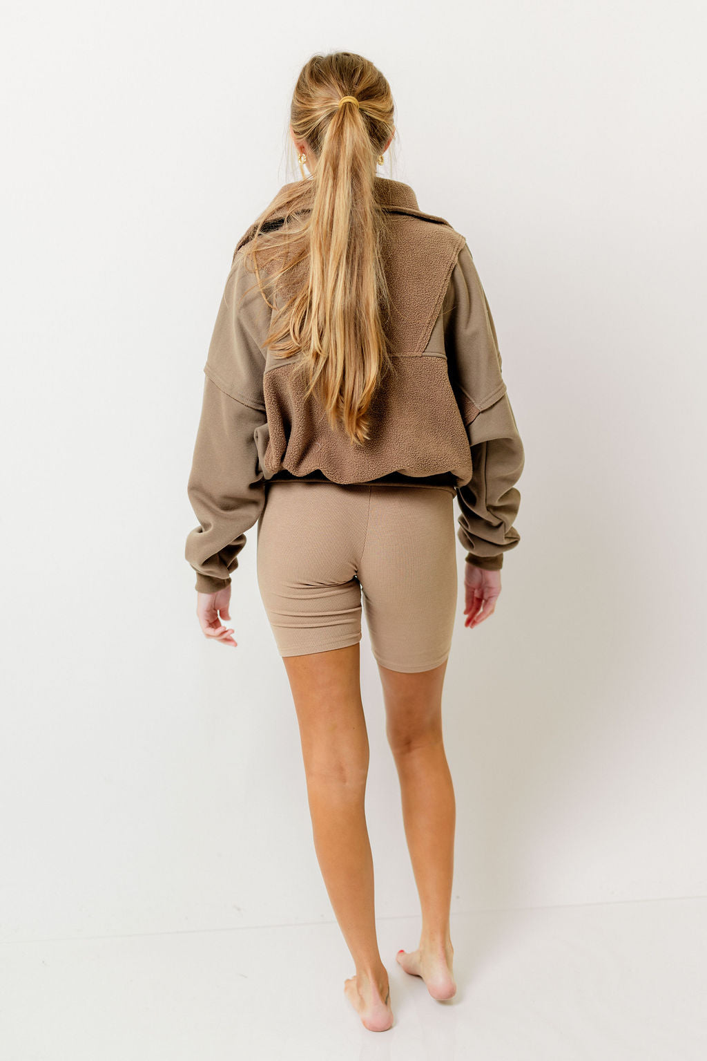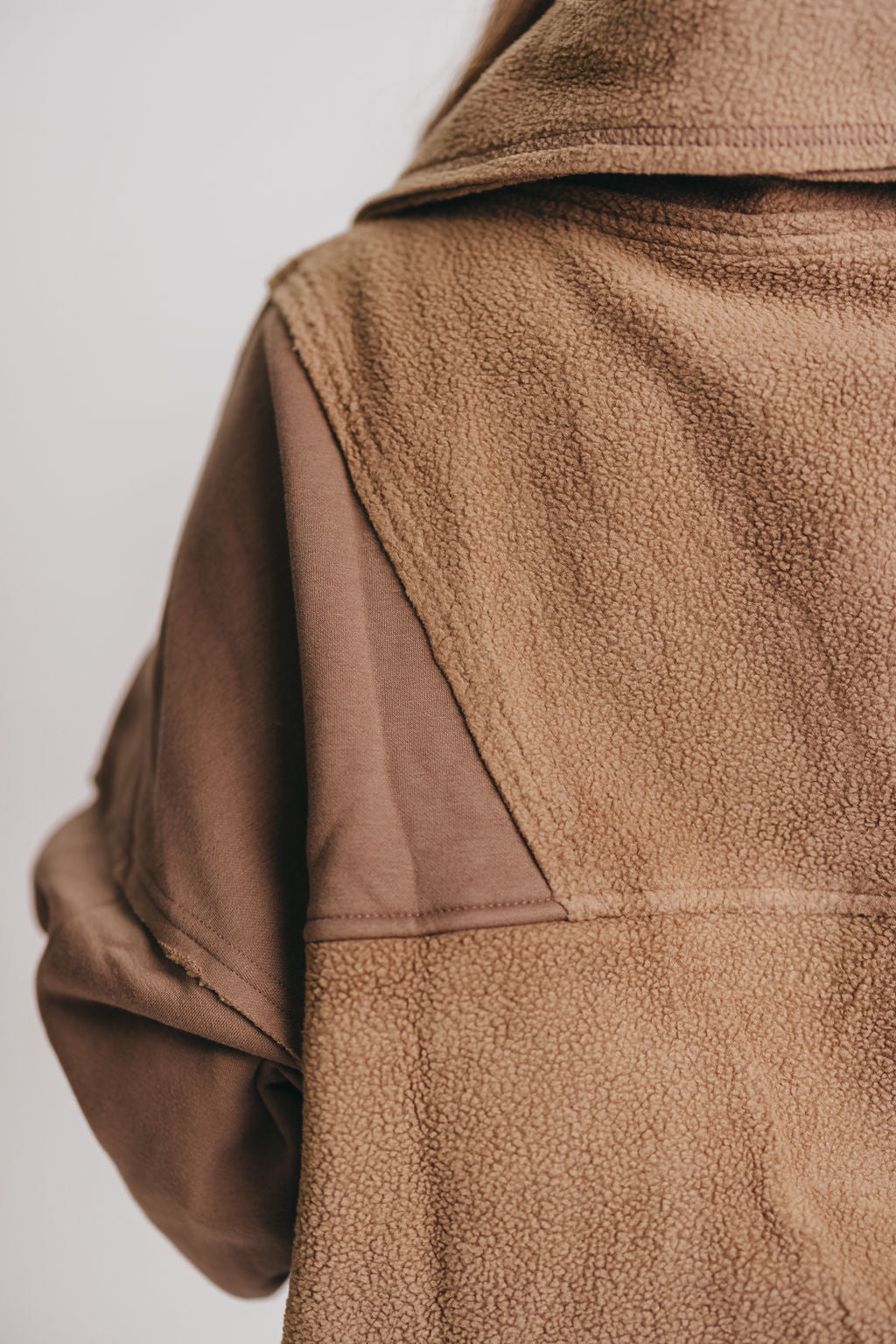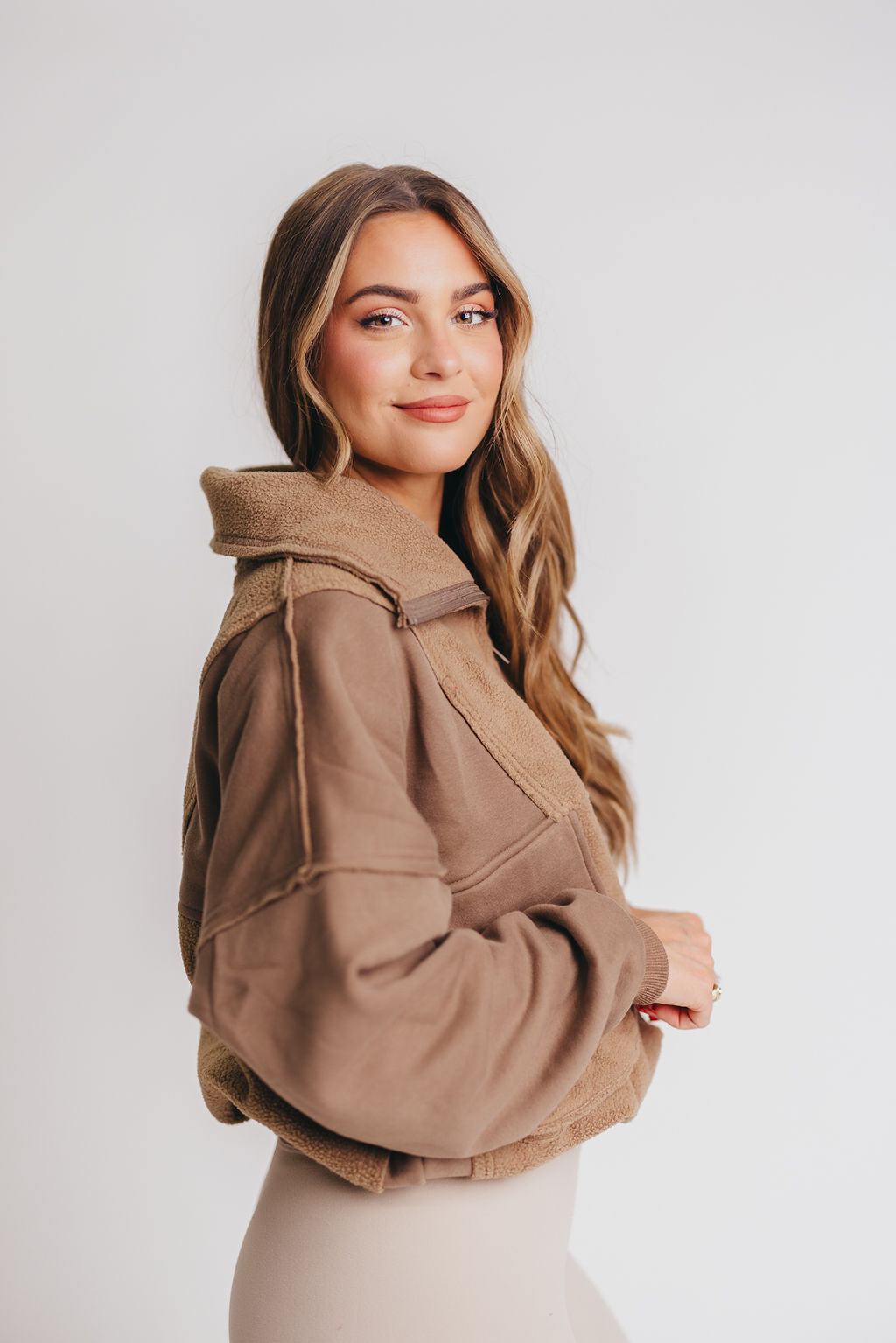 GARMENT DETAILS: Brushed terry pullover with a slouchy silhouette and 1/4 zip neckline. Features dual snap utility pockets and a contrasting sherpa fabric detail.