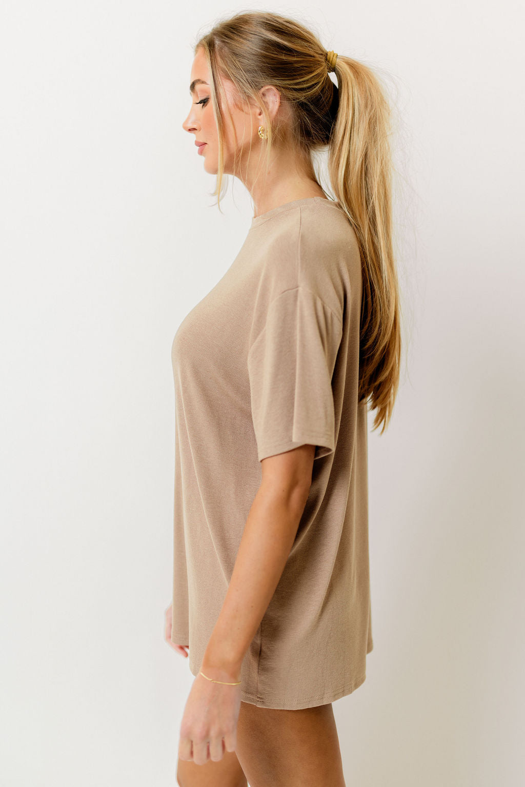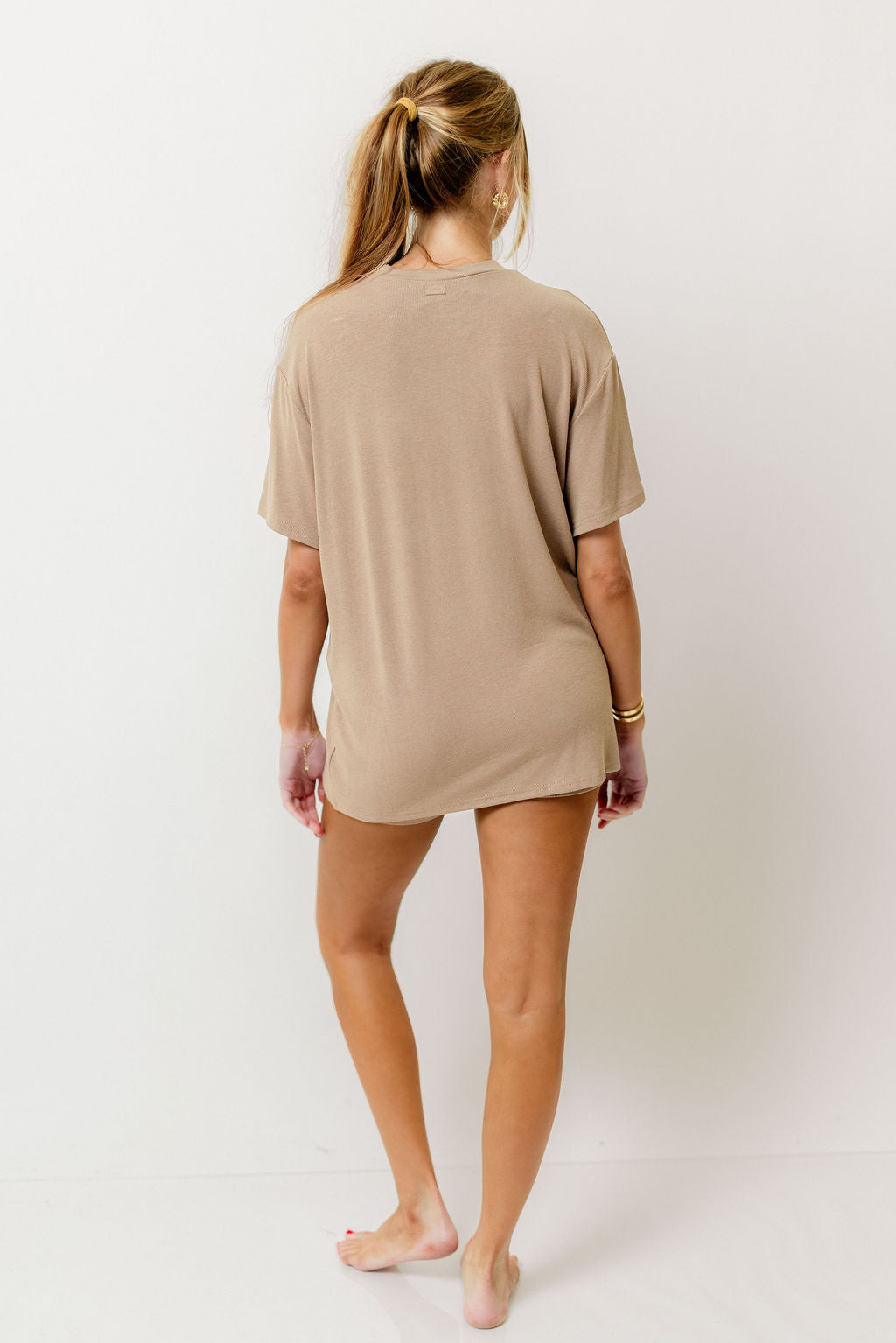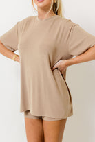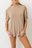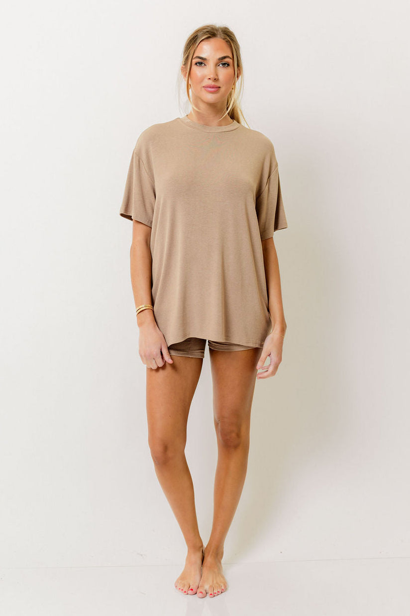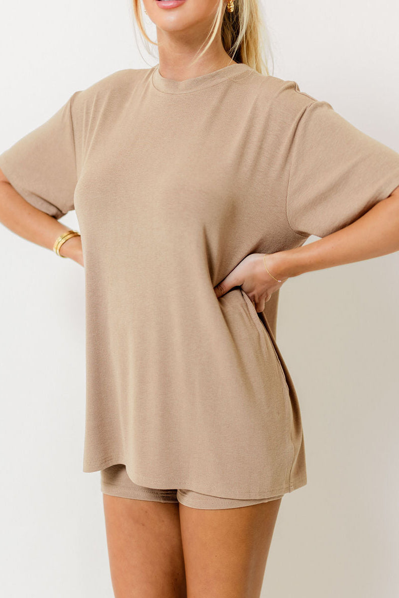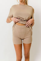 GARMENT DETAILS: Cozy ribbed knit set. Top features a crewneck, short sleeves, and relaxed fit. Boxer-style biker shorts feature an elasticated waistband, high waist, and stretchy fit.