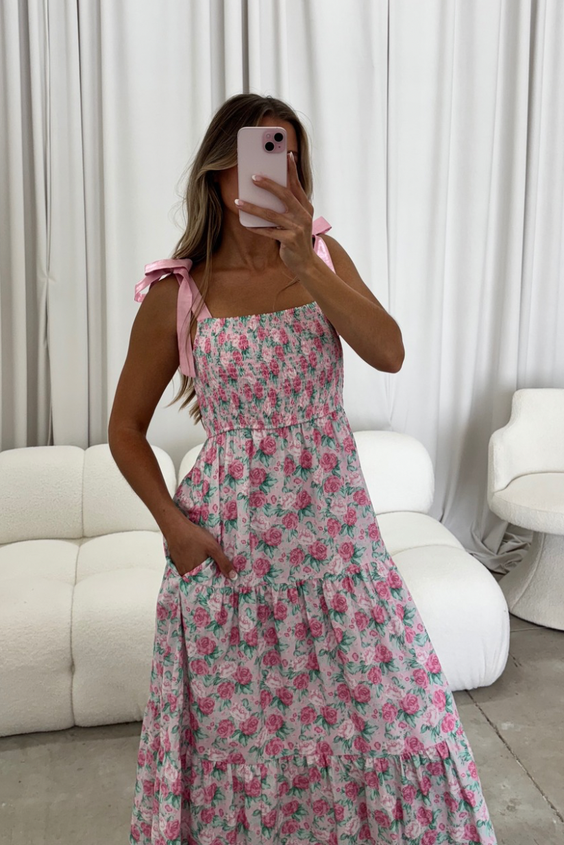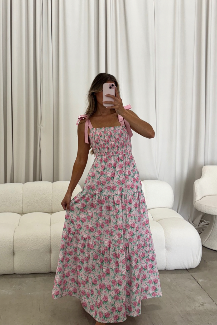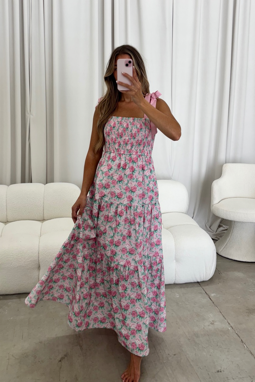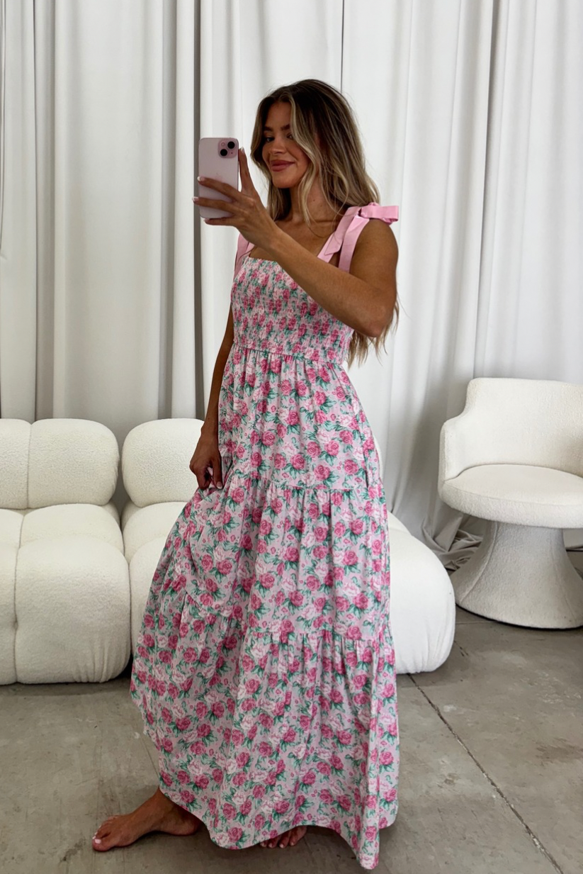 GARMENT DETAILS: Lightweight maxi dress in a charming floral print; features square neckline, adjustable self-tie shoulder straps, and fully smocked bodice. Finished with multi-tiered skirt and in-seam pockets. Lined.