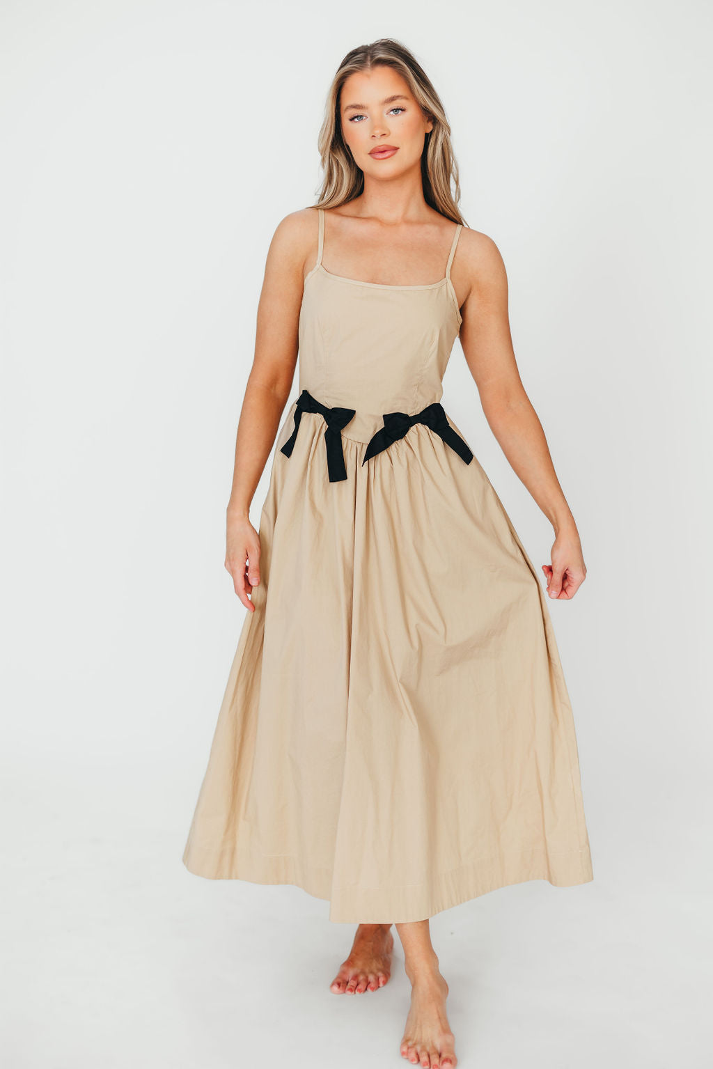 Celeste Square Neck Midi Dress with Bow Detail in Khaki *Final-Sale*