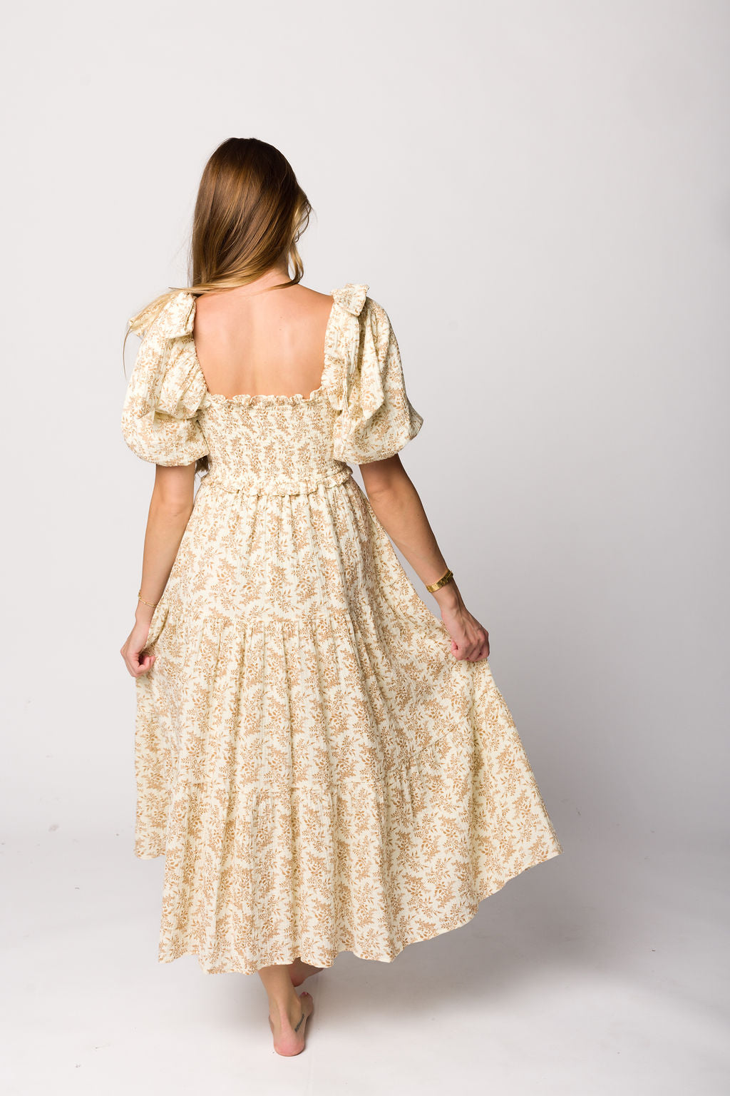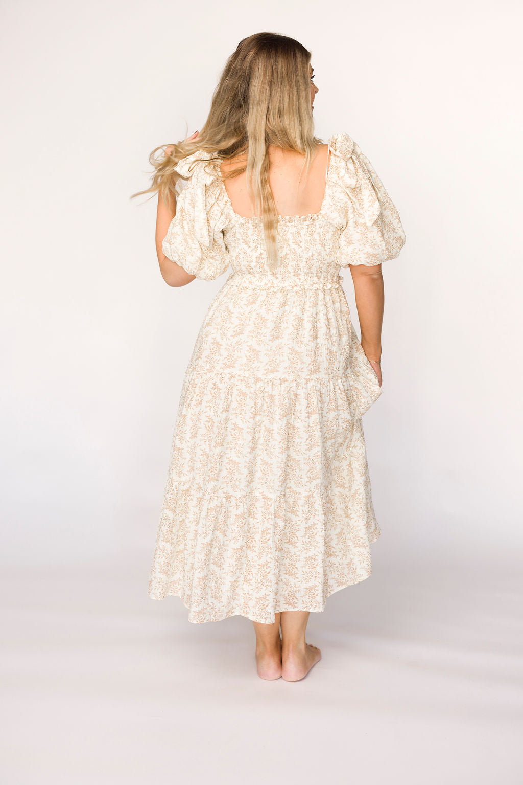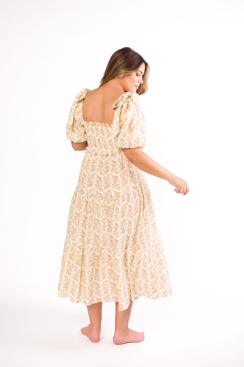 Elena 100% Cotton Toile Print Smocked Midi Dress in Light Brown- Bump Friendly