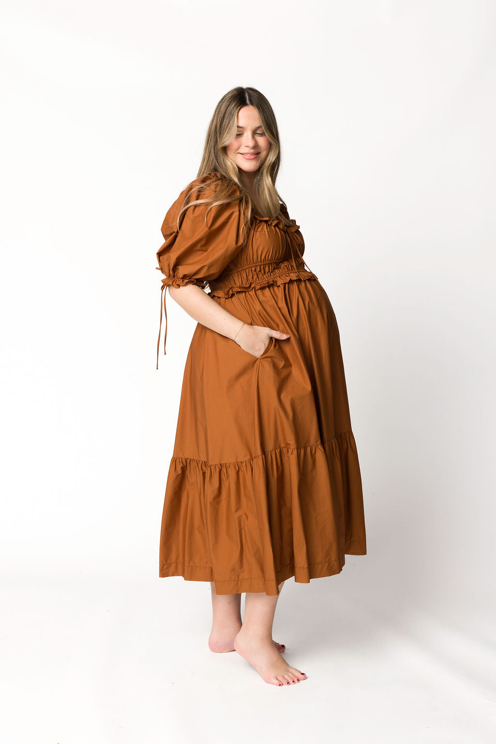 Crissy Ruched Midi Dress in Brown - Bump Friendly