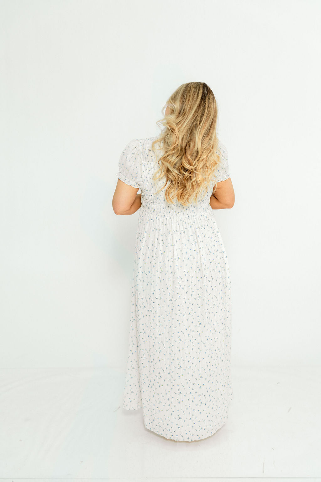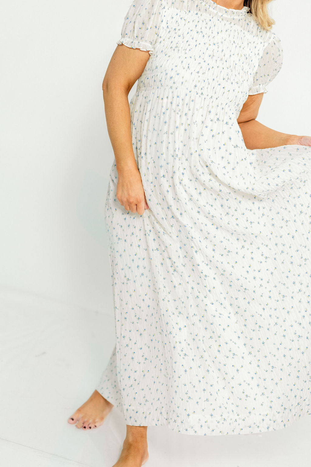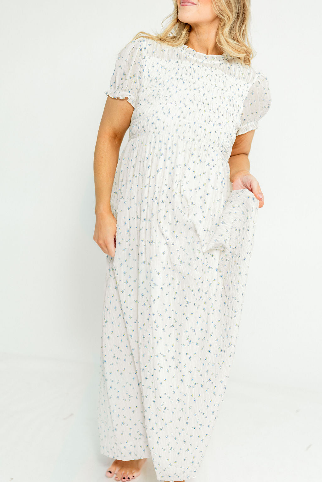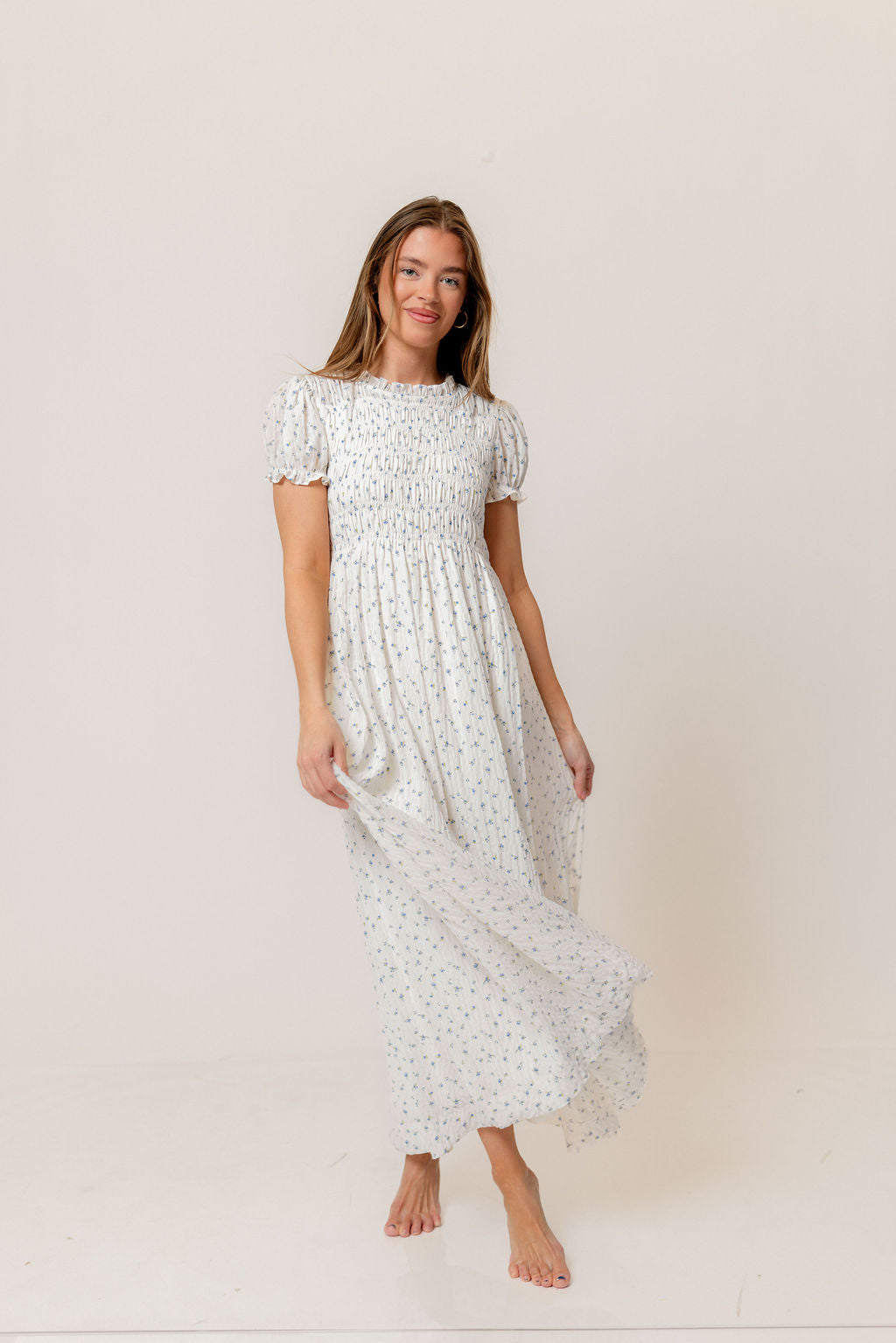 GARMENT DETAILS: Feminine maxi dress with high modest neckline, short puffed sleeves, and a fully smocked and stretchy bodice. Features an empire-waisted silhouette, with a wide, flowy skirt. Finished with delicate ruffle details.