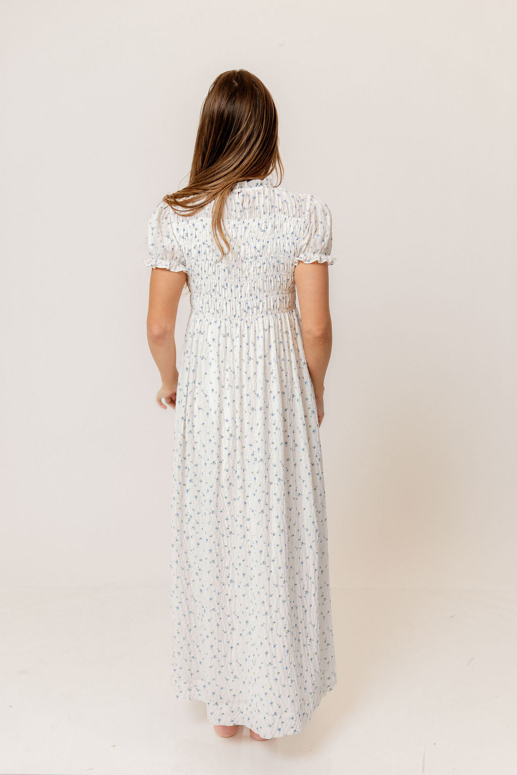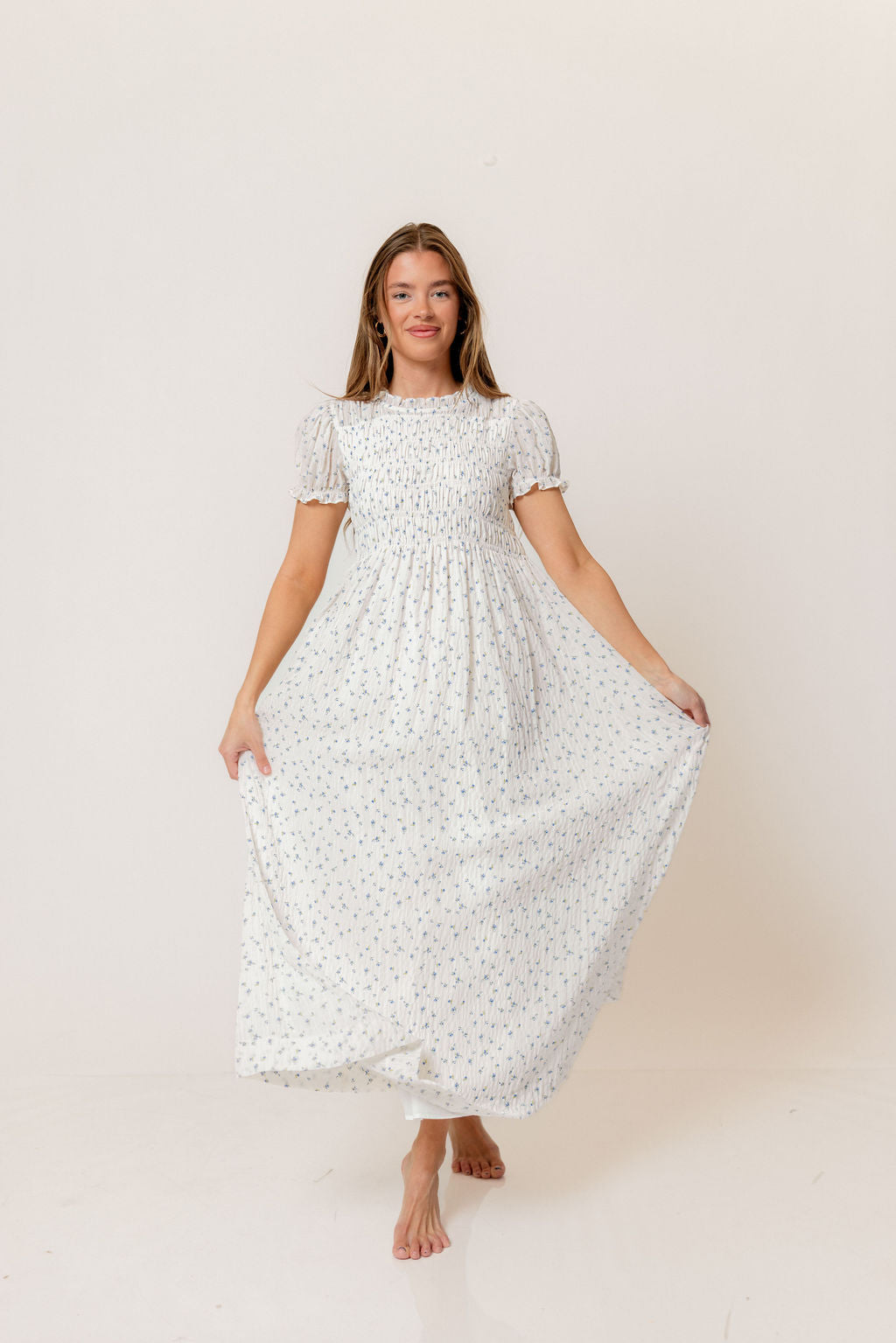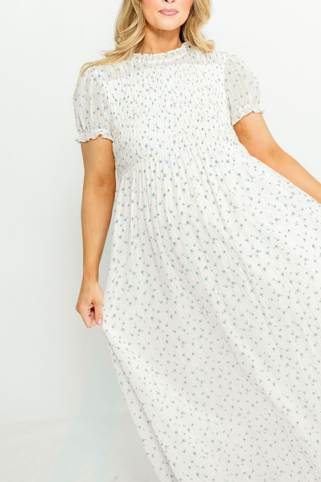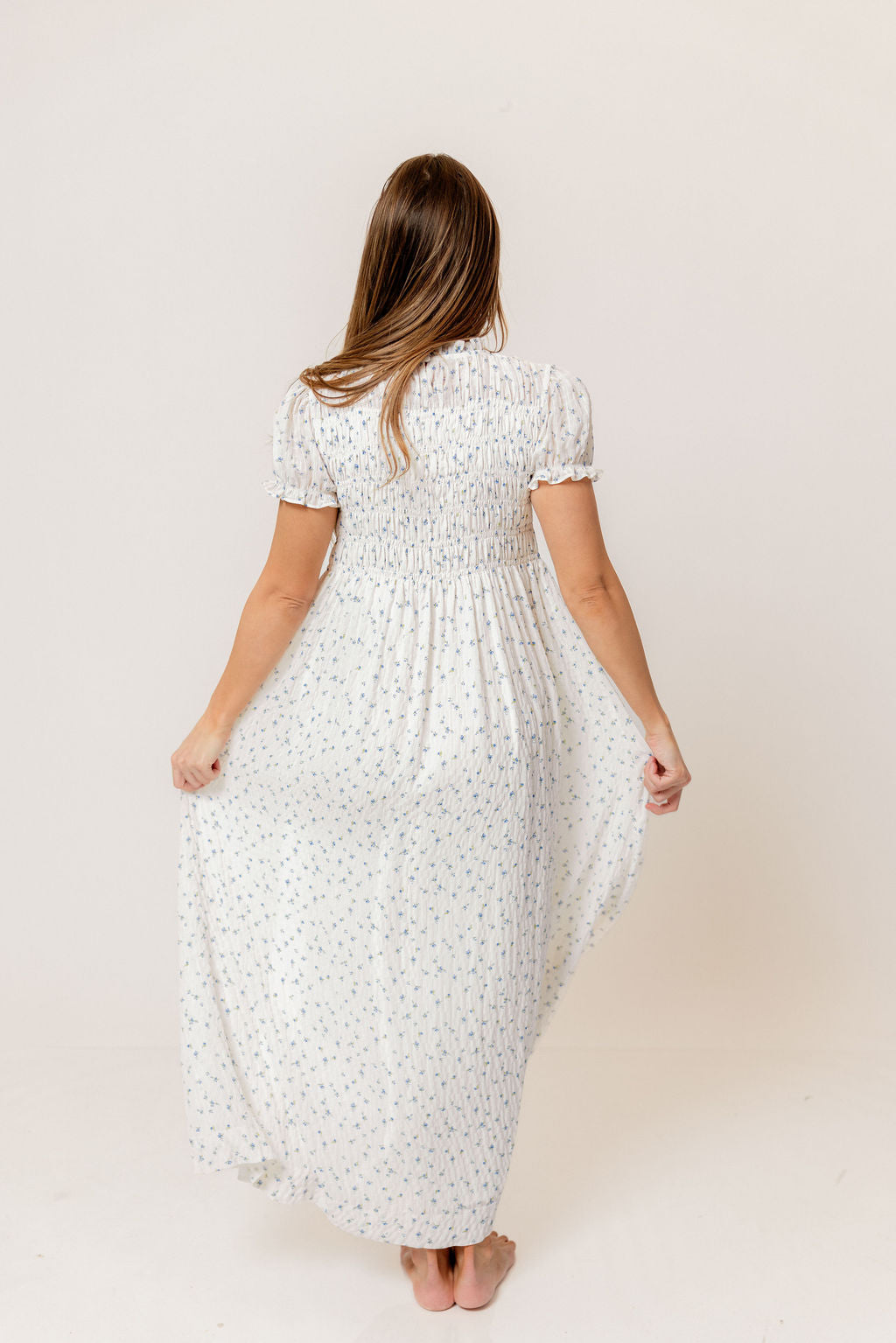 GARMENT DETAILS: Feminine maxi dress with high modest neckline, short puffed sleeves, and a fully smocked and stretchy bodice. Features an empire-waisted silhouette, with a wide, flowy skirt. Finished with delicate ruffle details.